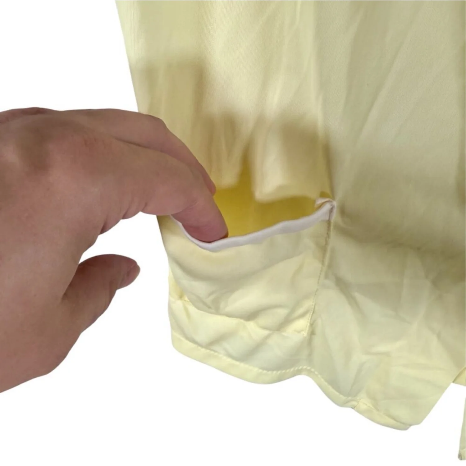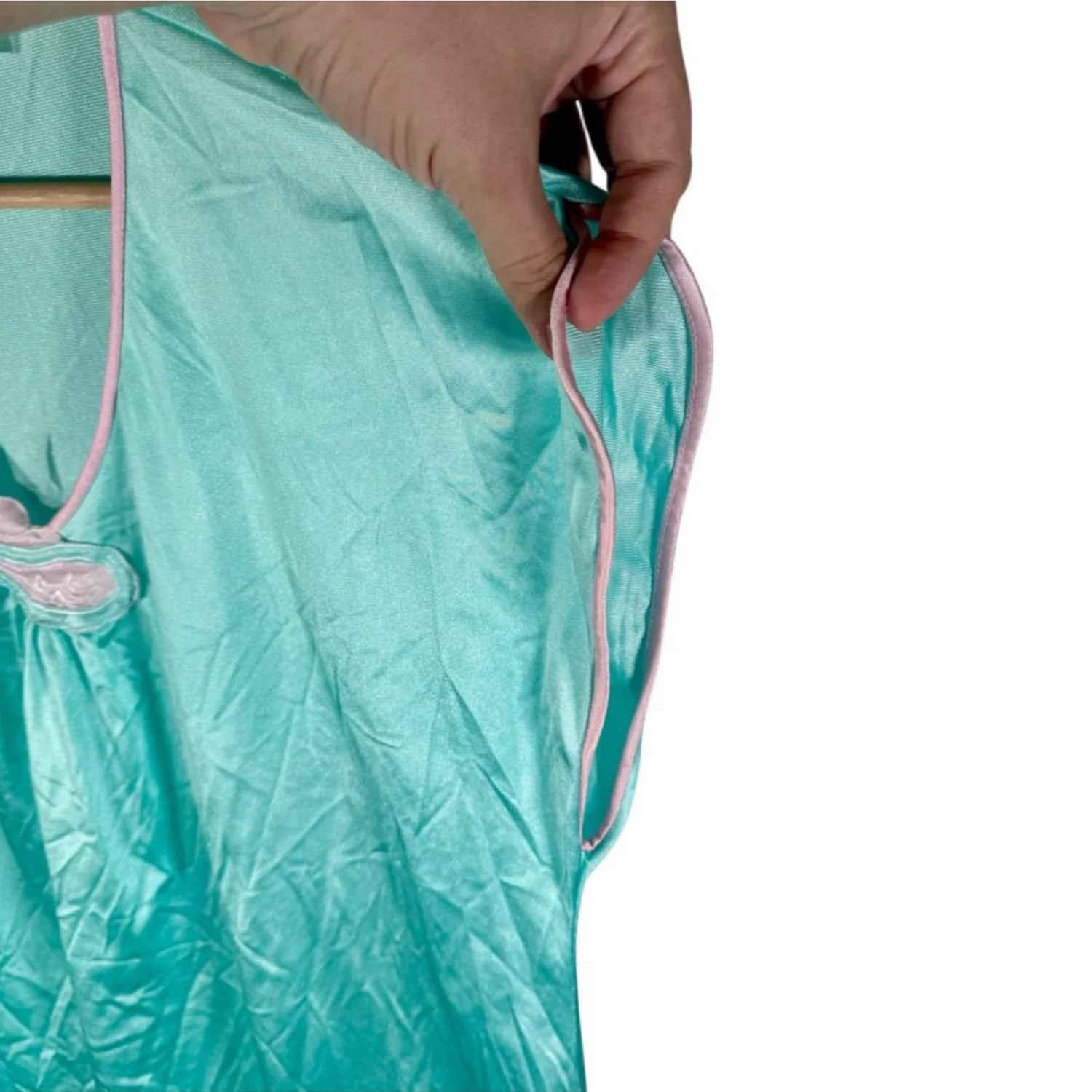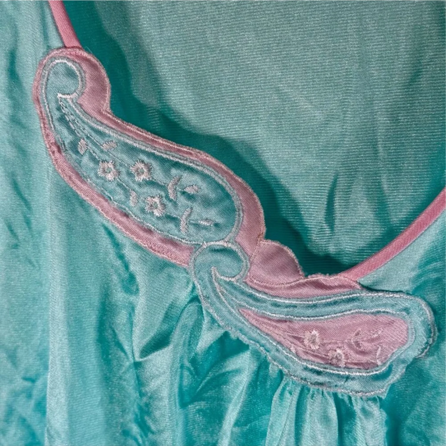Both blouses appear to be made of nylon with a satin texture. Yellow blouse is sleeveless and button-up. The seafoam green & pink one is a cap sleeved pullover with pink trim and a paisley pattern at neckline. I do not have bottoms to match either shirt. Both are in excellent preowned condition, considering wear. One tiny stain on yellow blouse. See pictures for details. Measurements of yellow blouse armpit to armpit 20.75 length 24" Measurements of seafoam green blouse armpit to armpit 20.5" length 27.25" Keywords: intimates, lingerie, sleepwear, loungewear, relaxation P20250319 49