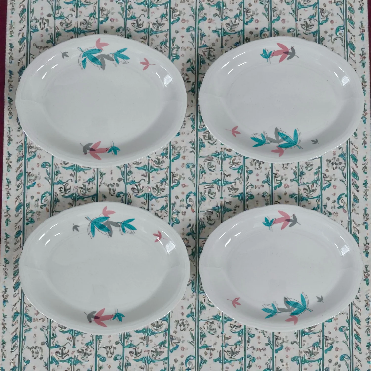 Very cool and retro style! Dishes come in a set of 4 and feature MCM style leaves. All are in good vintage preowned condition. Hand wash only. There are some surface scratches and a couple of blemishes on the edges. See pictures for details. Measurements length 9.75" width 7.75" Keywords: midcentury modern, 1950s, retro, kitchen, plates, dishes, replacement P20260010 208