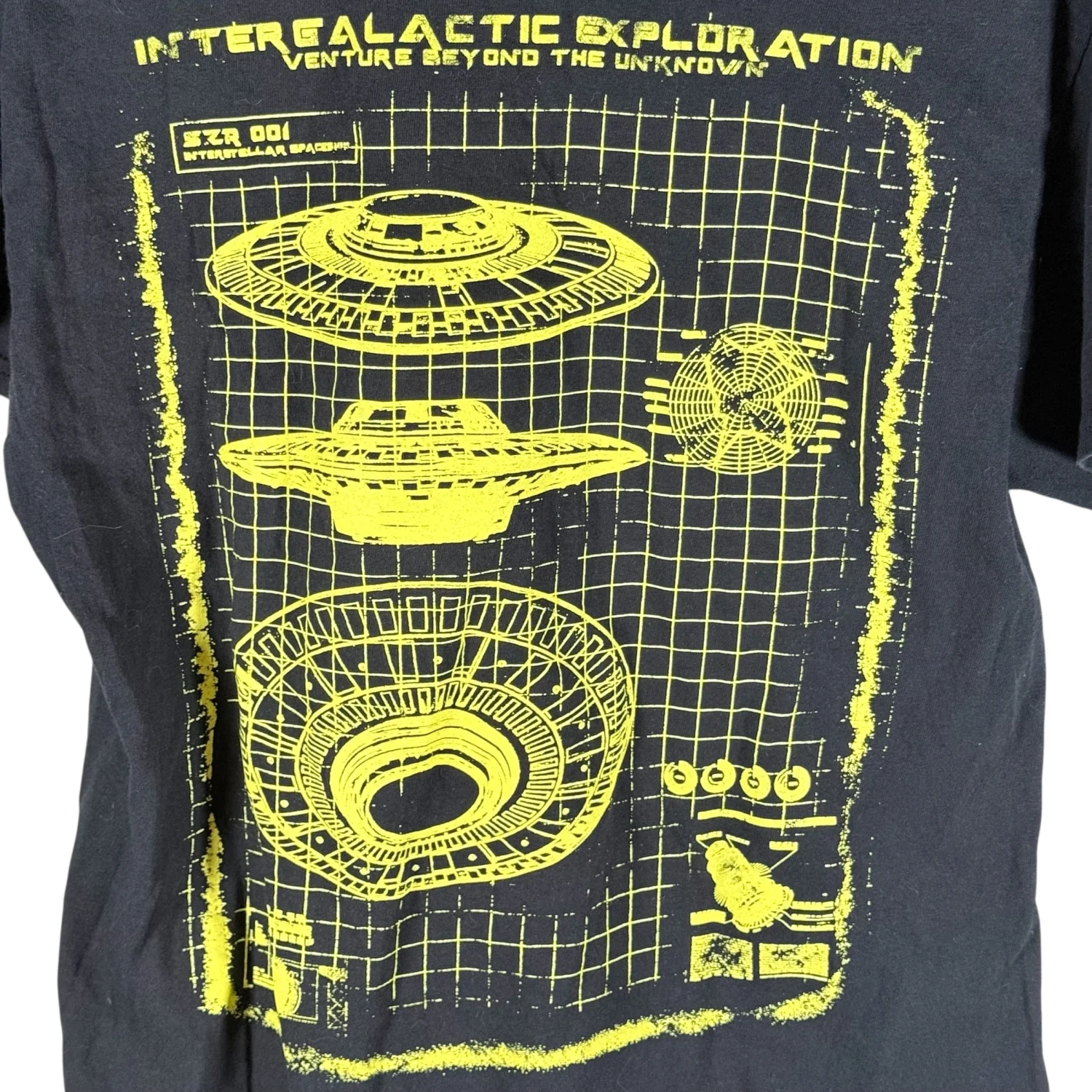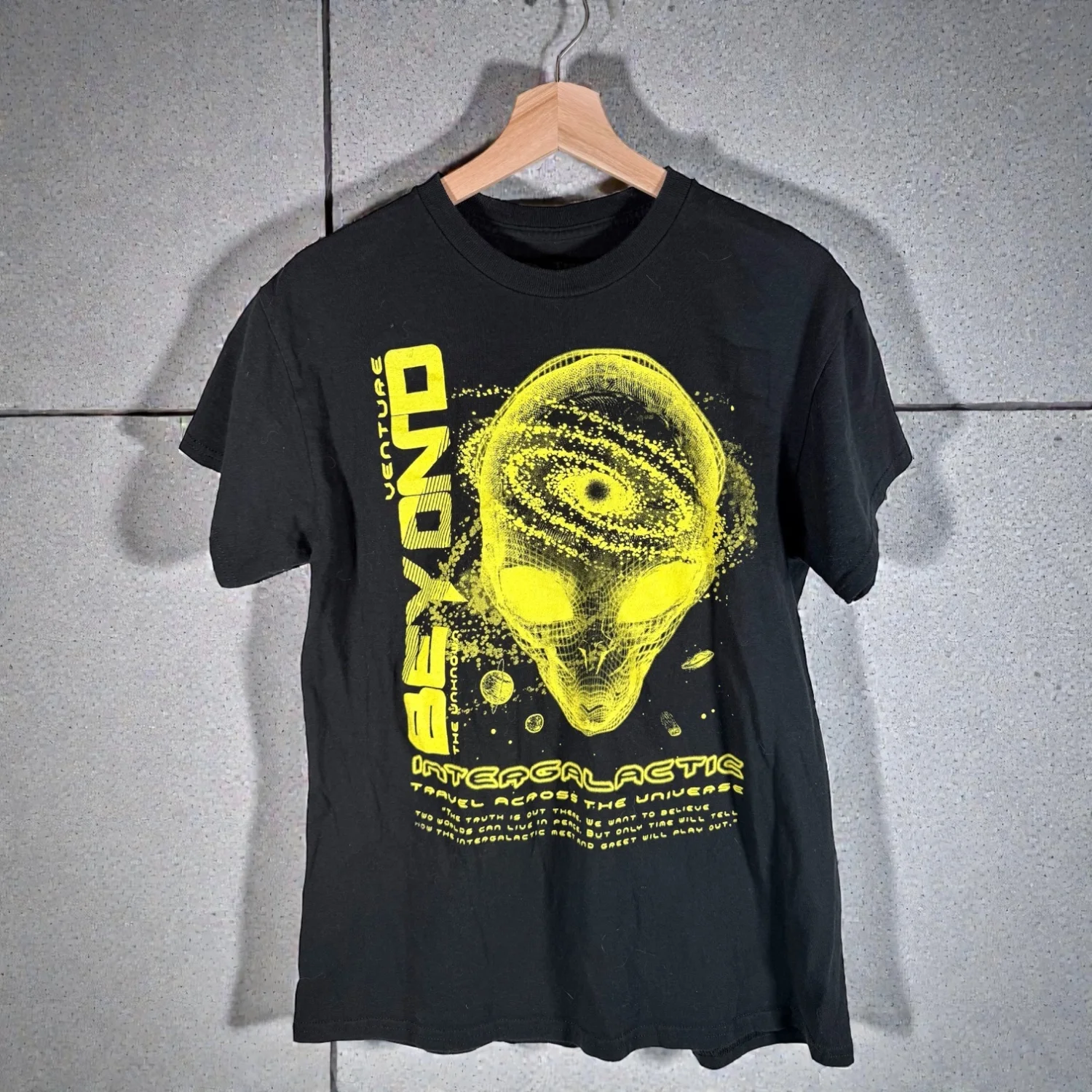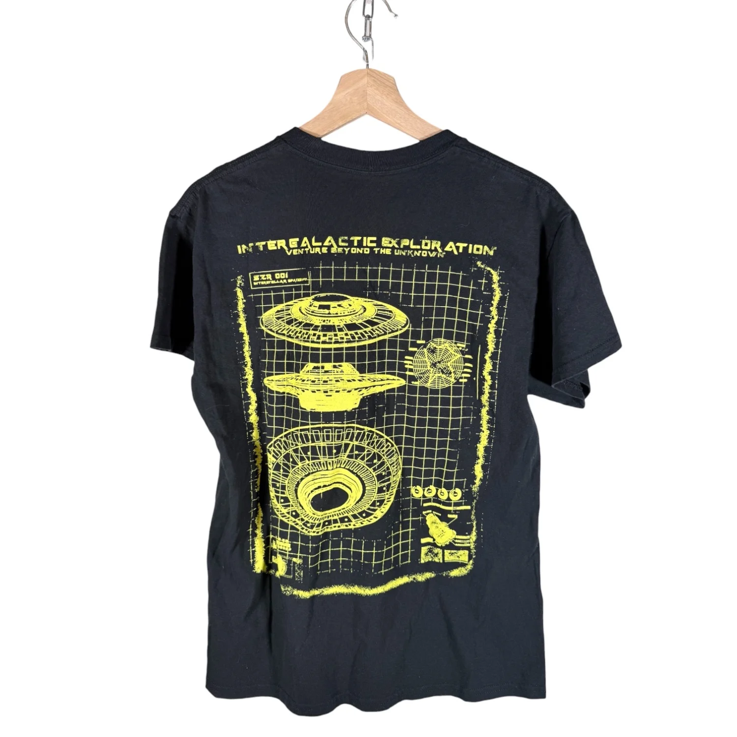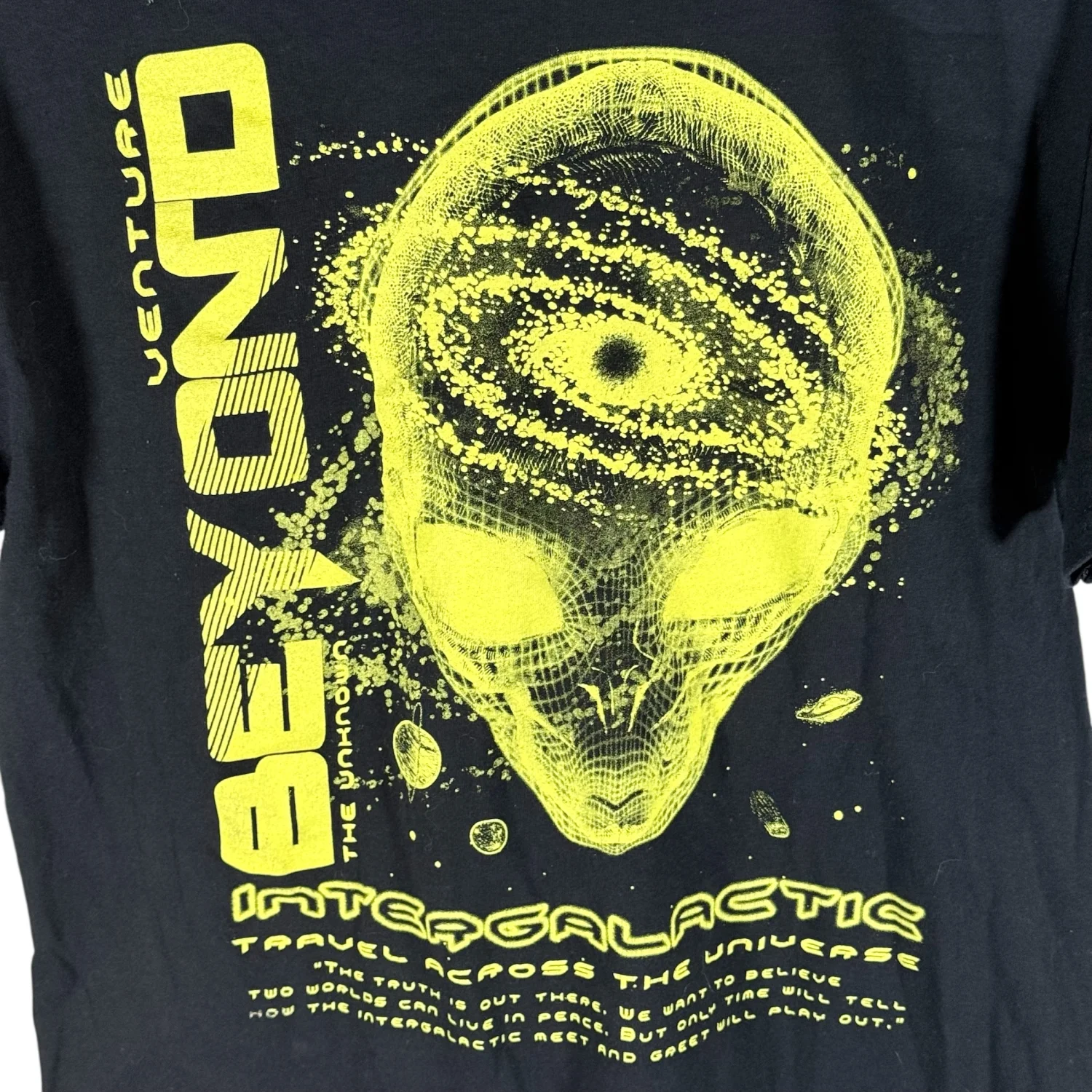 This cool t-shirt is in excellent preowned condition with normal wear. See pictures for details. Measurements armpit to armpit 19.25" length 25.75" Keywords: alien, extraterrestrial, casual, supernatural, space, school, casual, basic, closet essential, science fiction P20260013 2