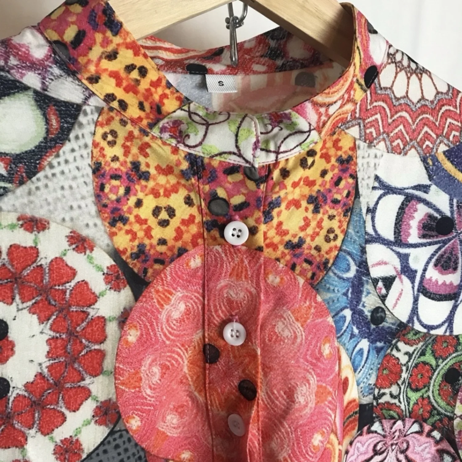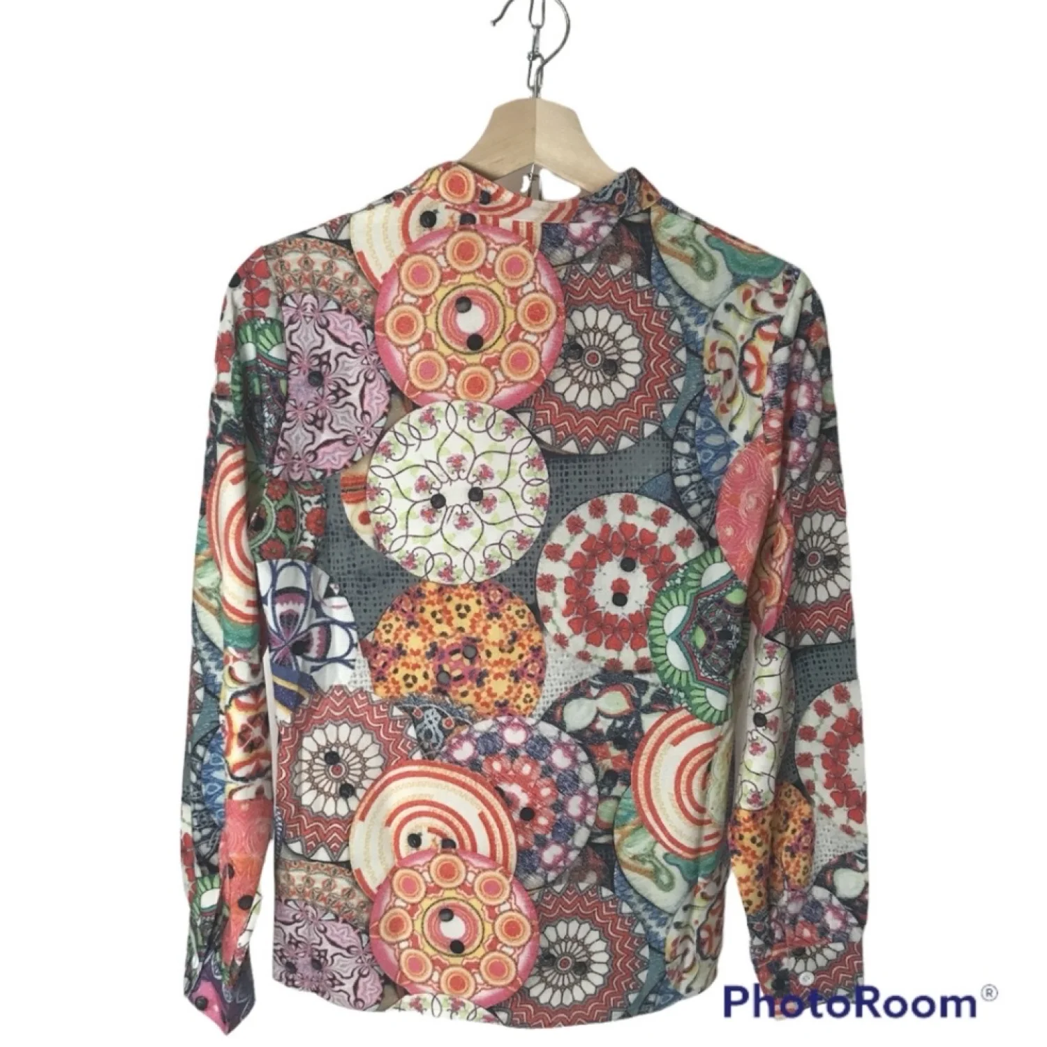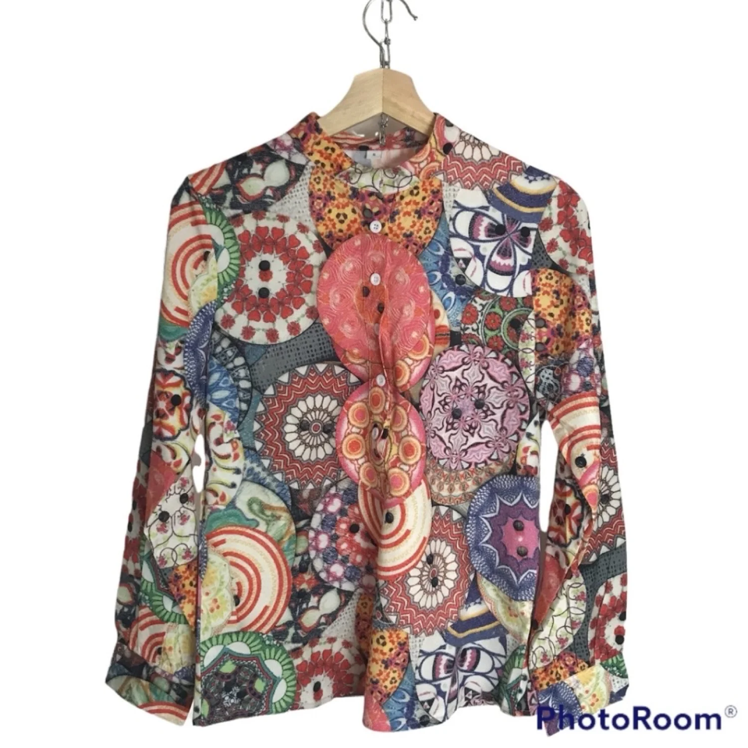 Make a statement in this gorgeous blouse! Features half button front with mock collar. Appears to be semi-fitted. No brand associated with this blouse. Material: No material tag. Feels like 100% polyester. Care: No care tag. Wash machine washed and dried on low with no issues. Size: Women's small (per tag) Condition: Good used See pictures for details and measurements. Keywords: groovy, wrinkle free, 1970s, vintage style, colorful, vibrant 20220190 51