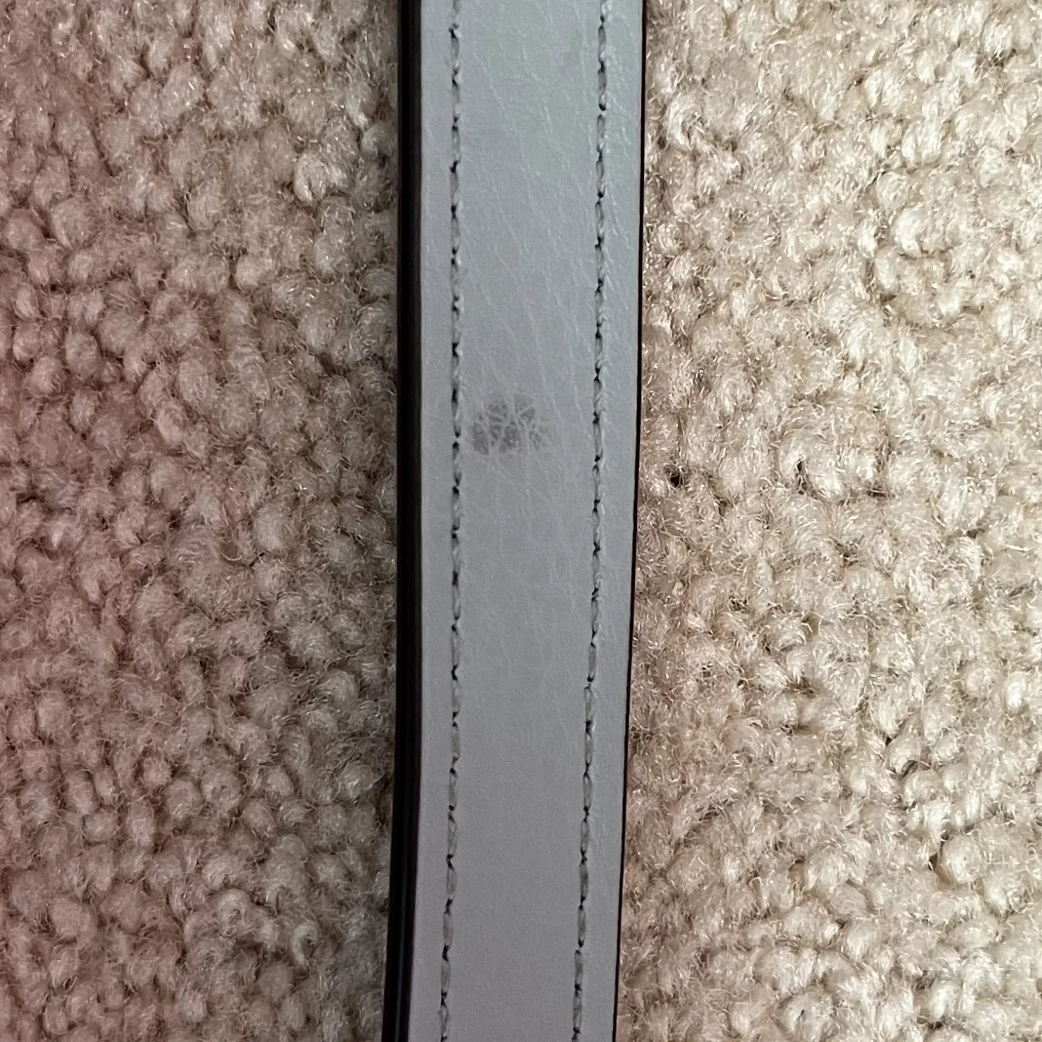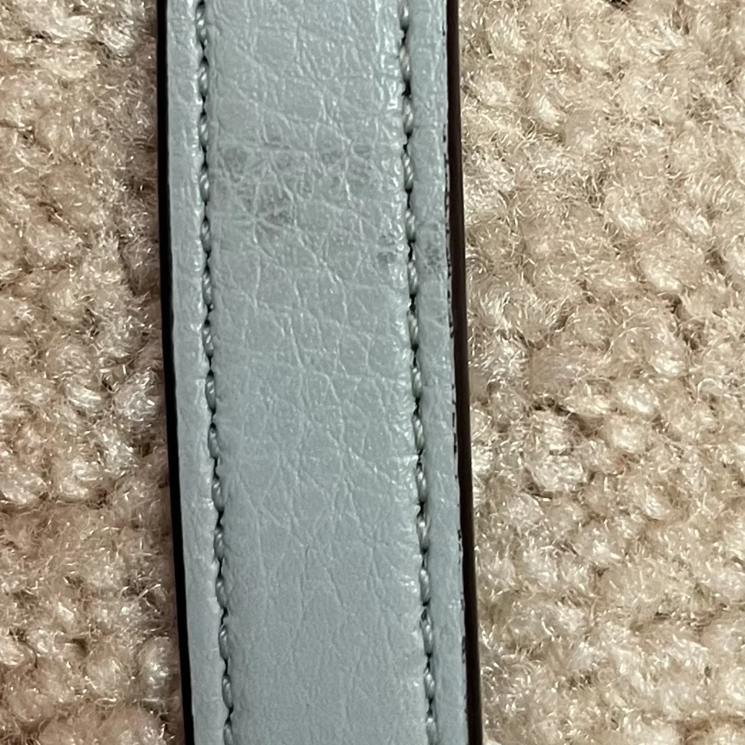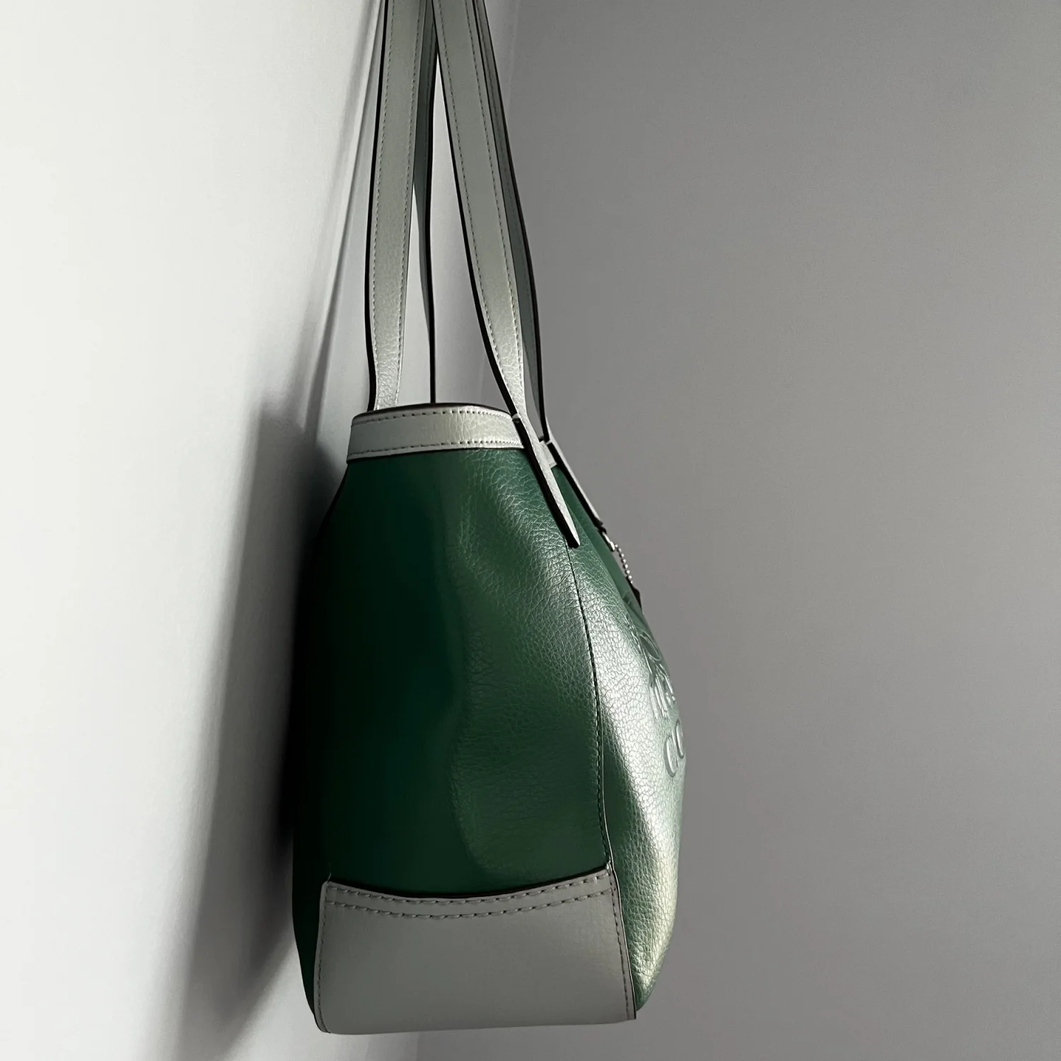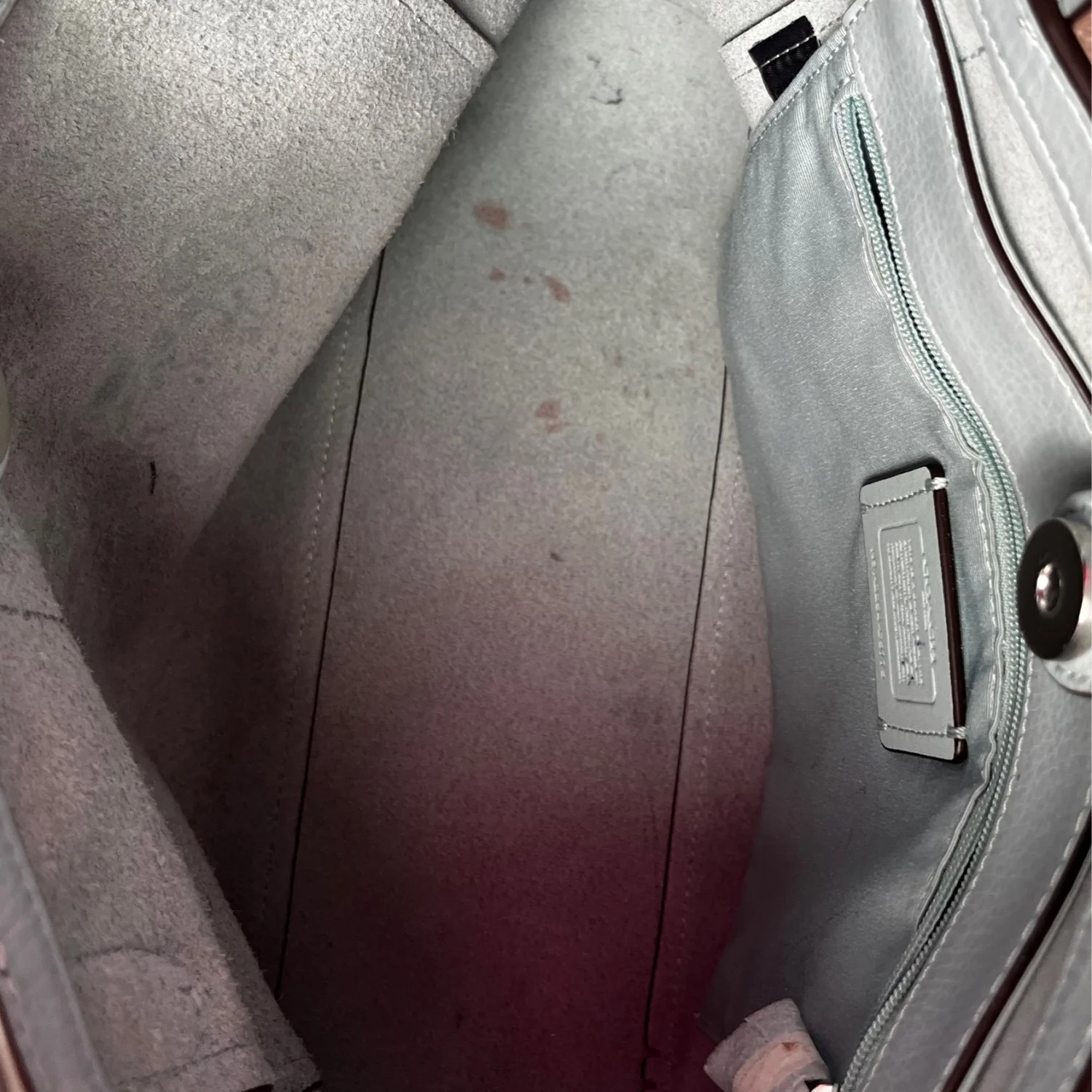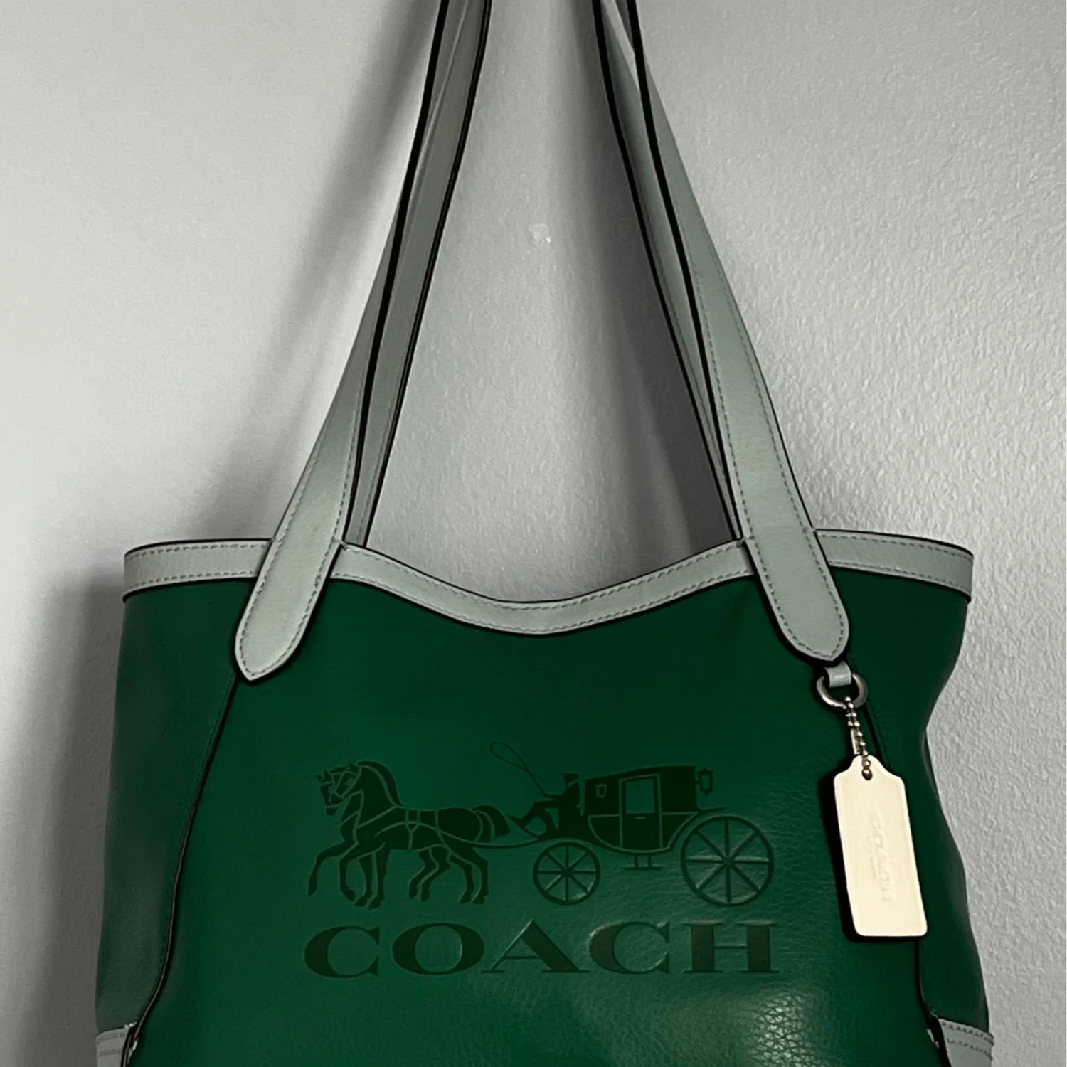 The COACH horse and carriage baby blue and green tote is a stylish and practical designer handbag for women. Made of pebbled leather with a logo accent, this medium-sized tote features a magnetic closure and silver hardware. The gray leather double handles add a touch of sophistication to this casual tote, perfect for everyday use. With inner pockets for organization and a pebbled finish, this tote is a versatile accessory for any outfit. The brand card adds a chic touch to this fashionable handbag from Coach. Pristine condition, besides picture light stains on the strap. Noted pen marks on the inside of the bag