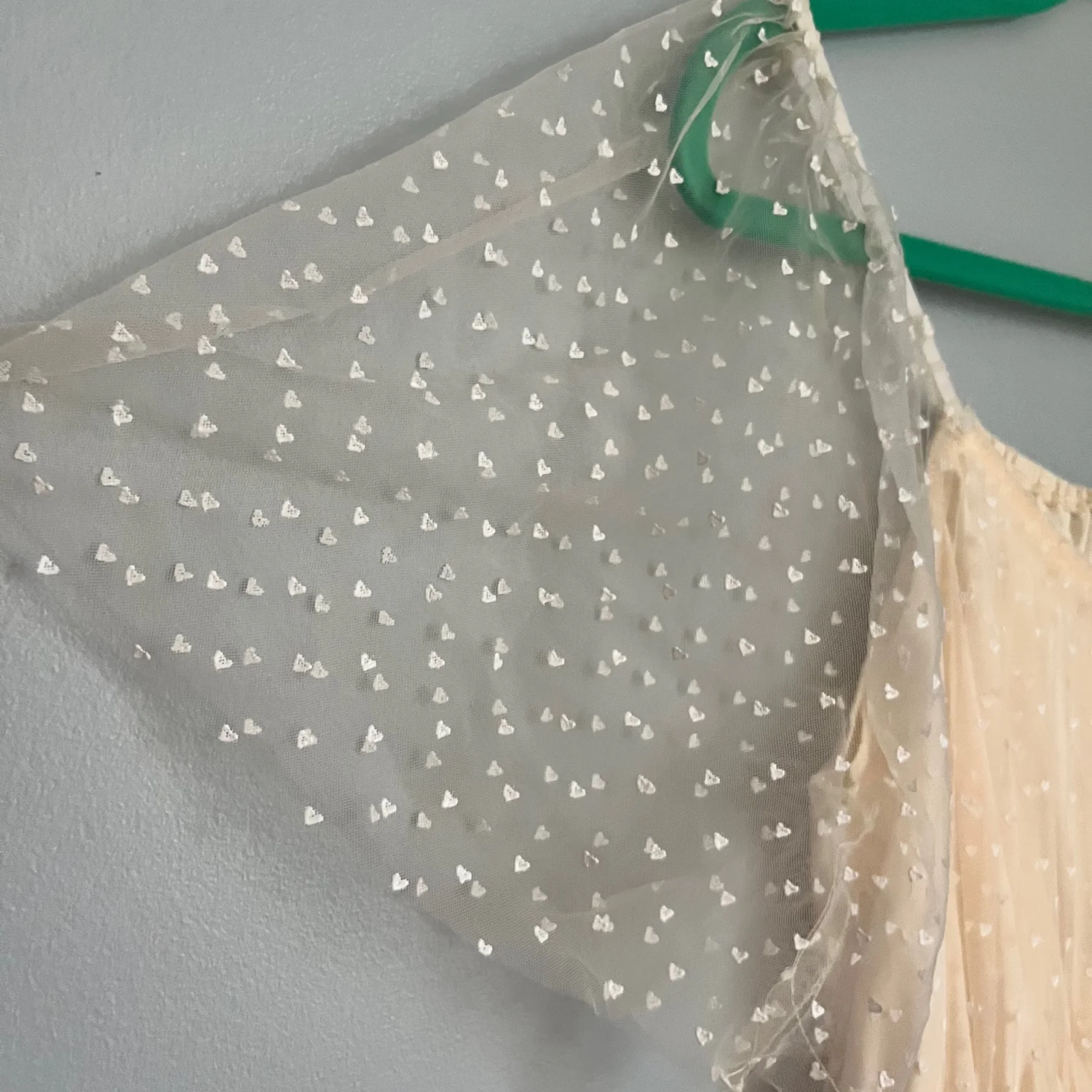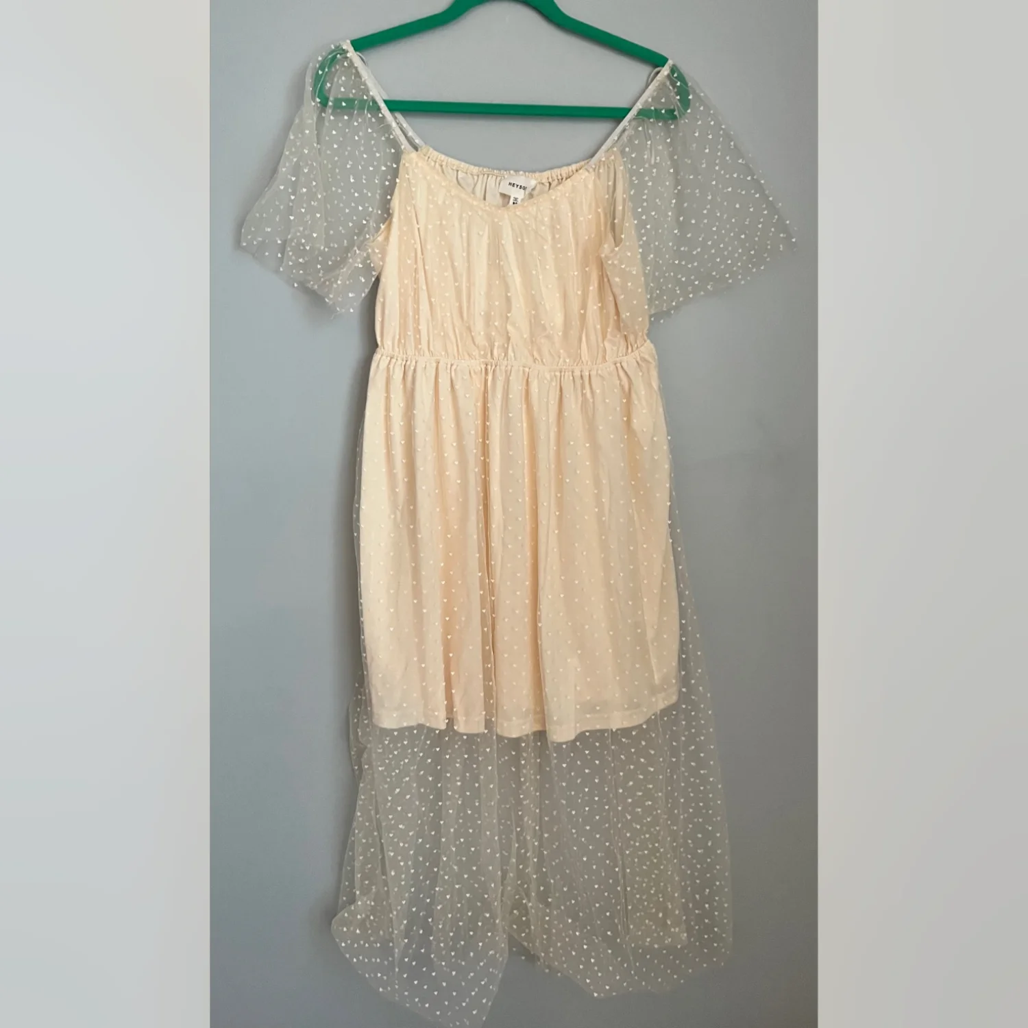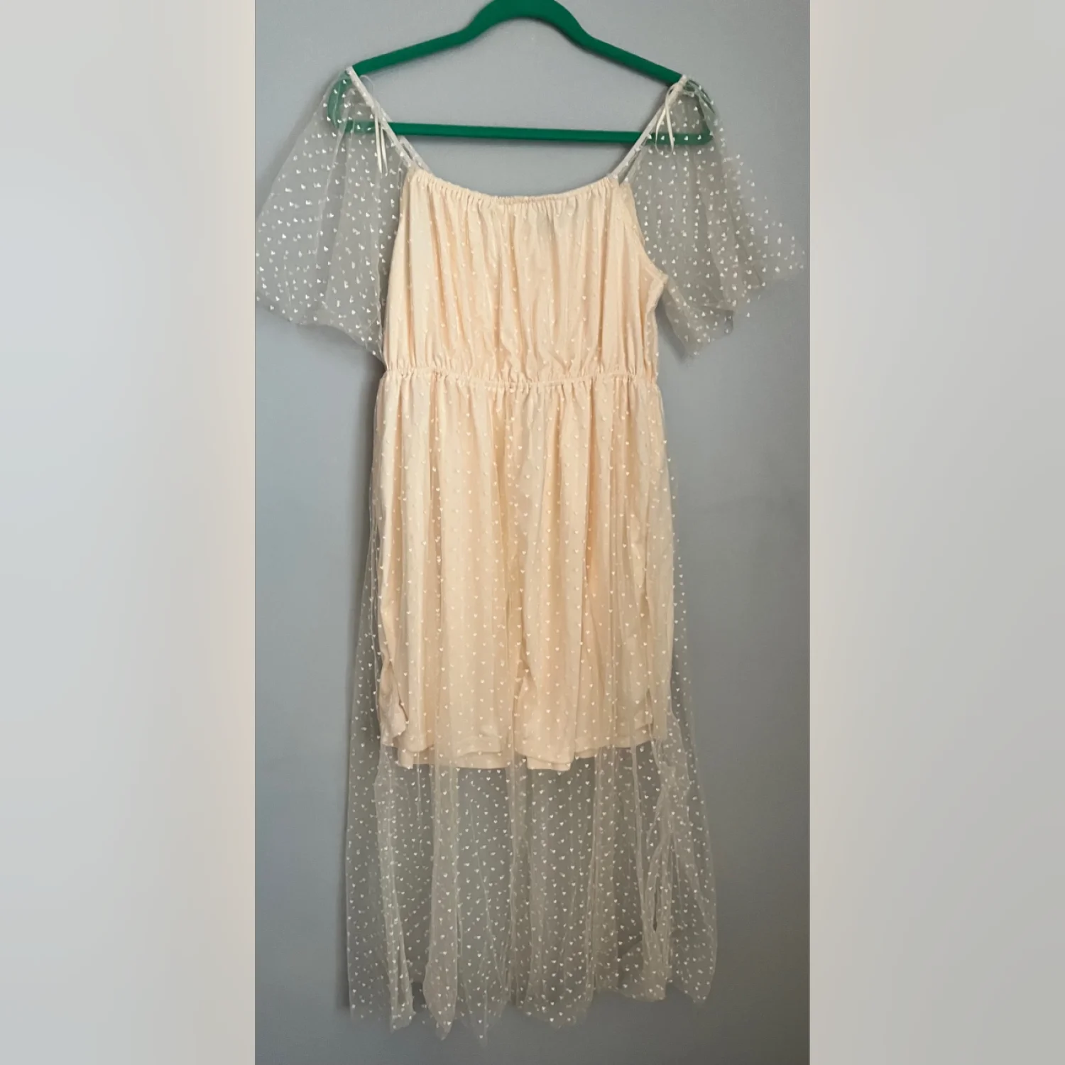 The Heyson Ivory Heart Pattern Tulle Maxi Dress is a stunning piece perfect for parties or casual wear. This dress features a delicate heart pattern on a sheer tulle fabric, with short flutter sleeves and a square neckline for a feminine touch. The long dress length and lightweight material make it ideal for summer and spring seasons, adding a touch of princessy charm to your wardrobe. A delicate cream midi dress with sheer polka-dot overlay for a romantic look. Romantic Coquette Cottagecore Lace
