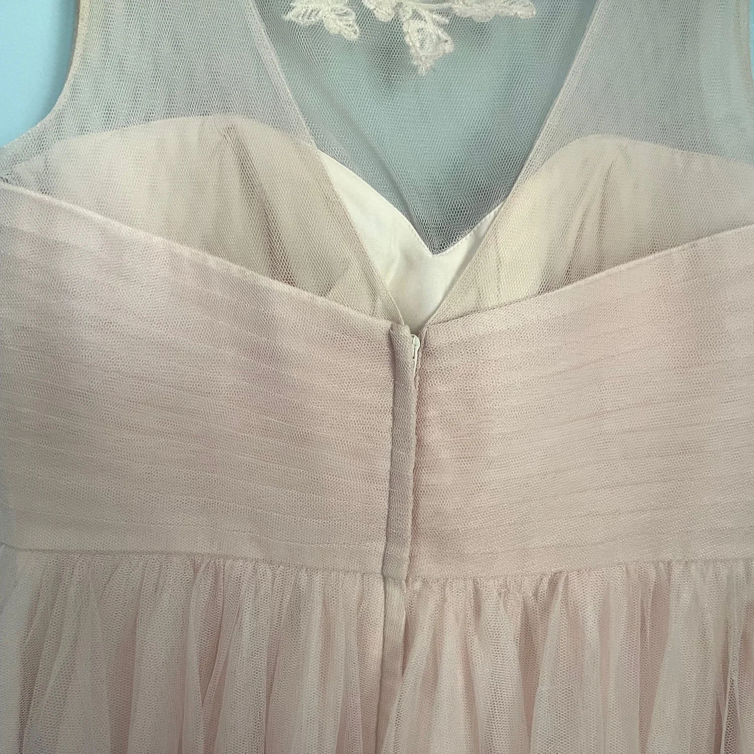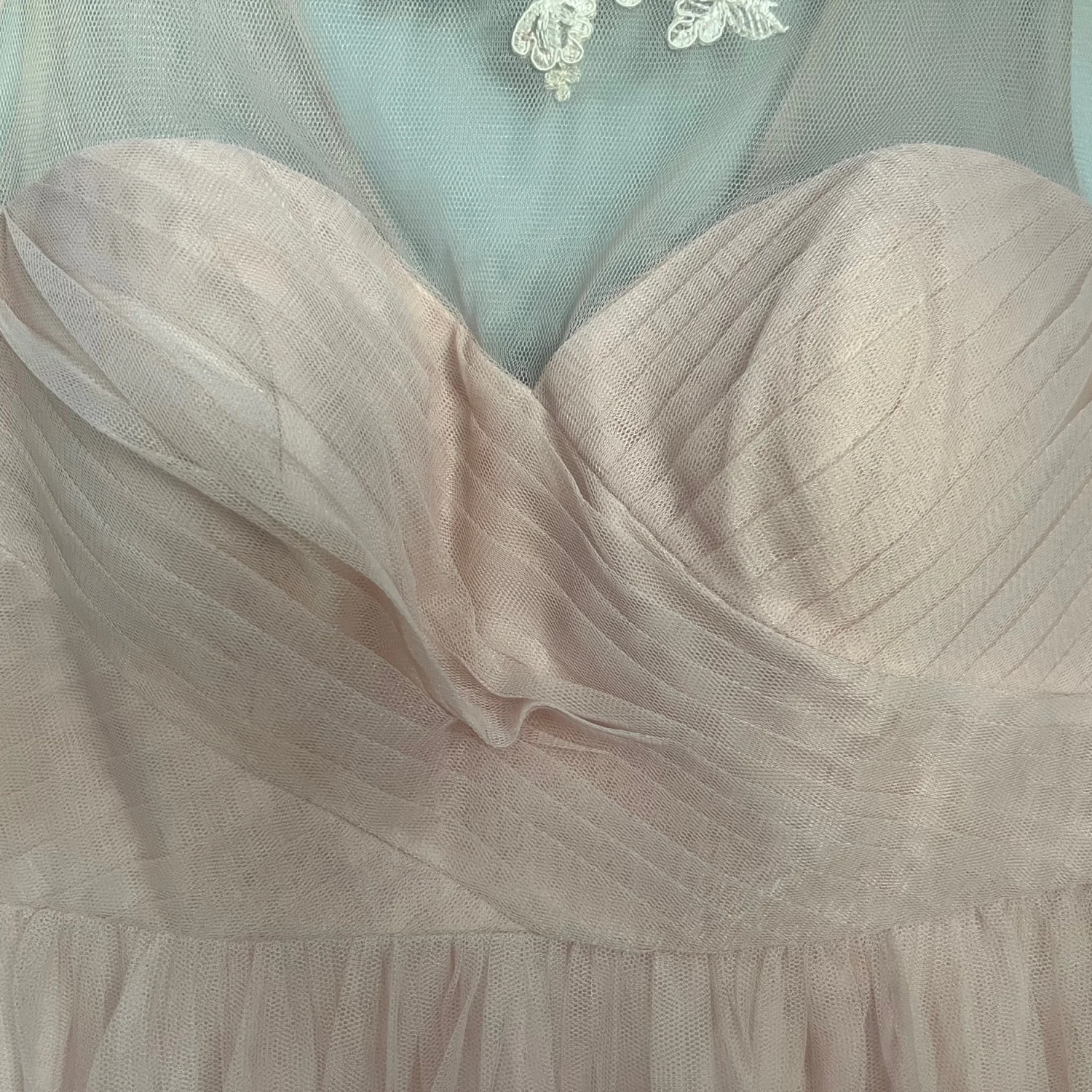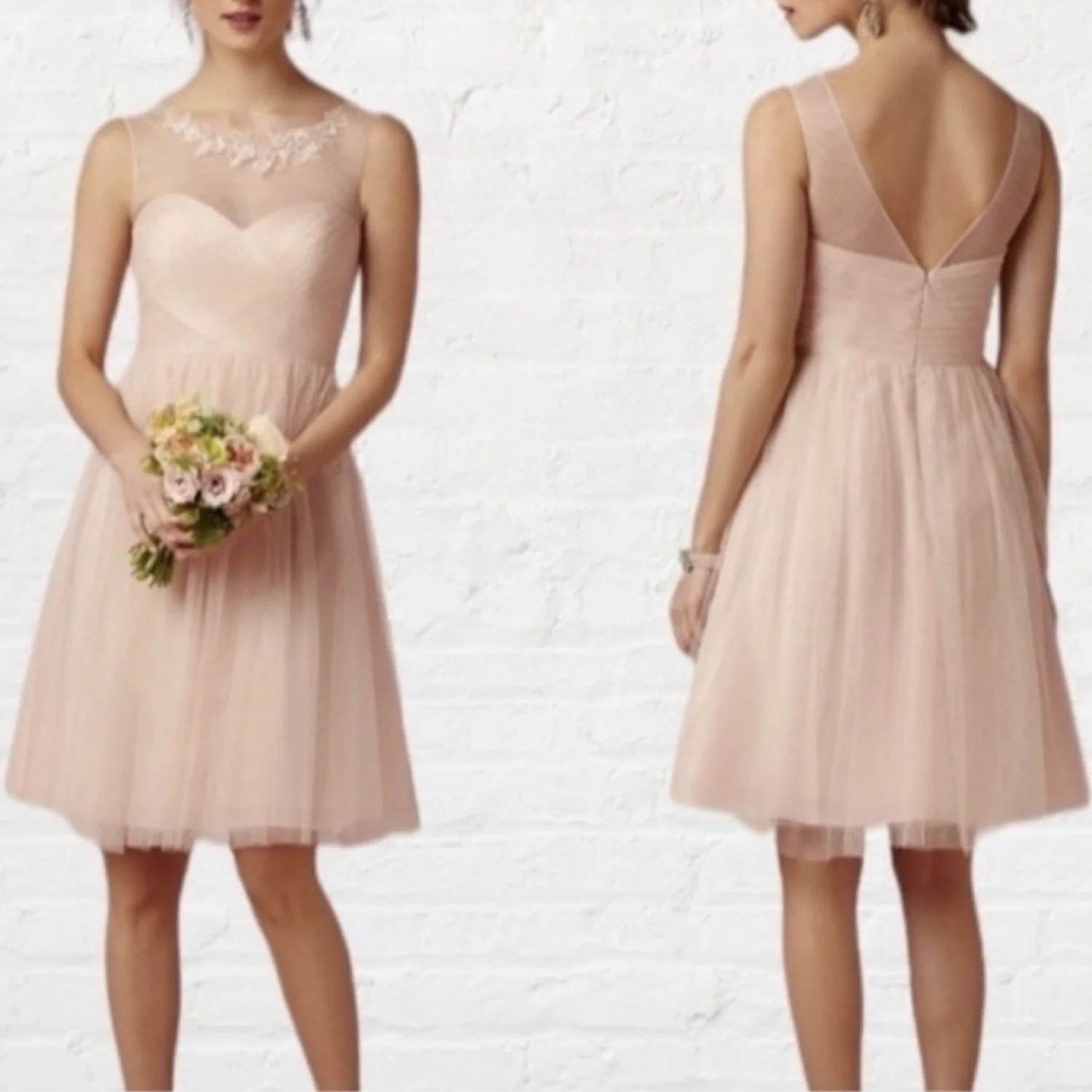Delicate pale blush tulle skirt with a fitted sweetheart bodice. Sheer illusion neckline with subtle floral appliqué. Knee-length silhouette for elegant movement. Ideal for bridesmaids or formal occasions.