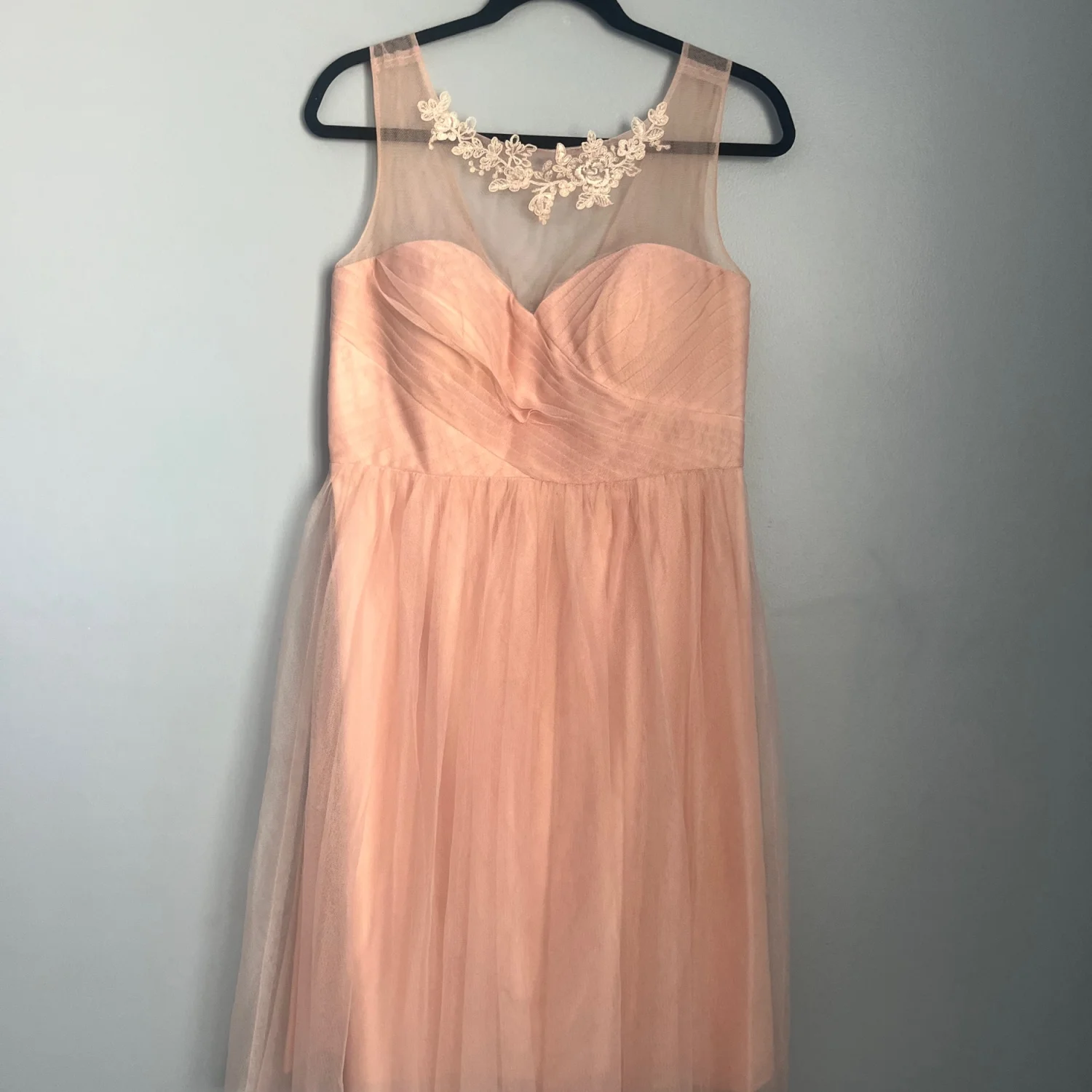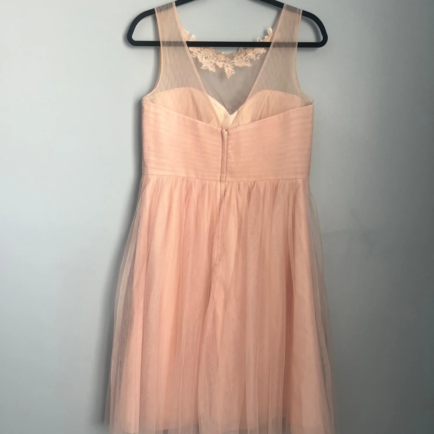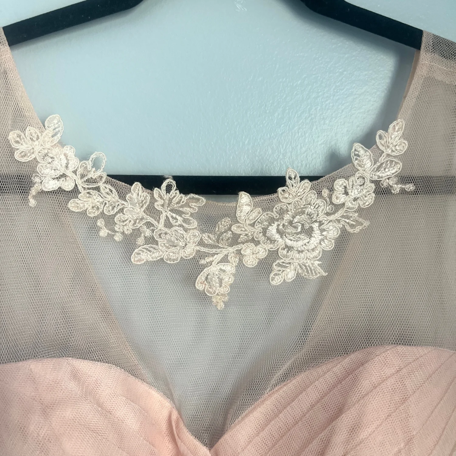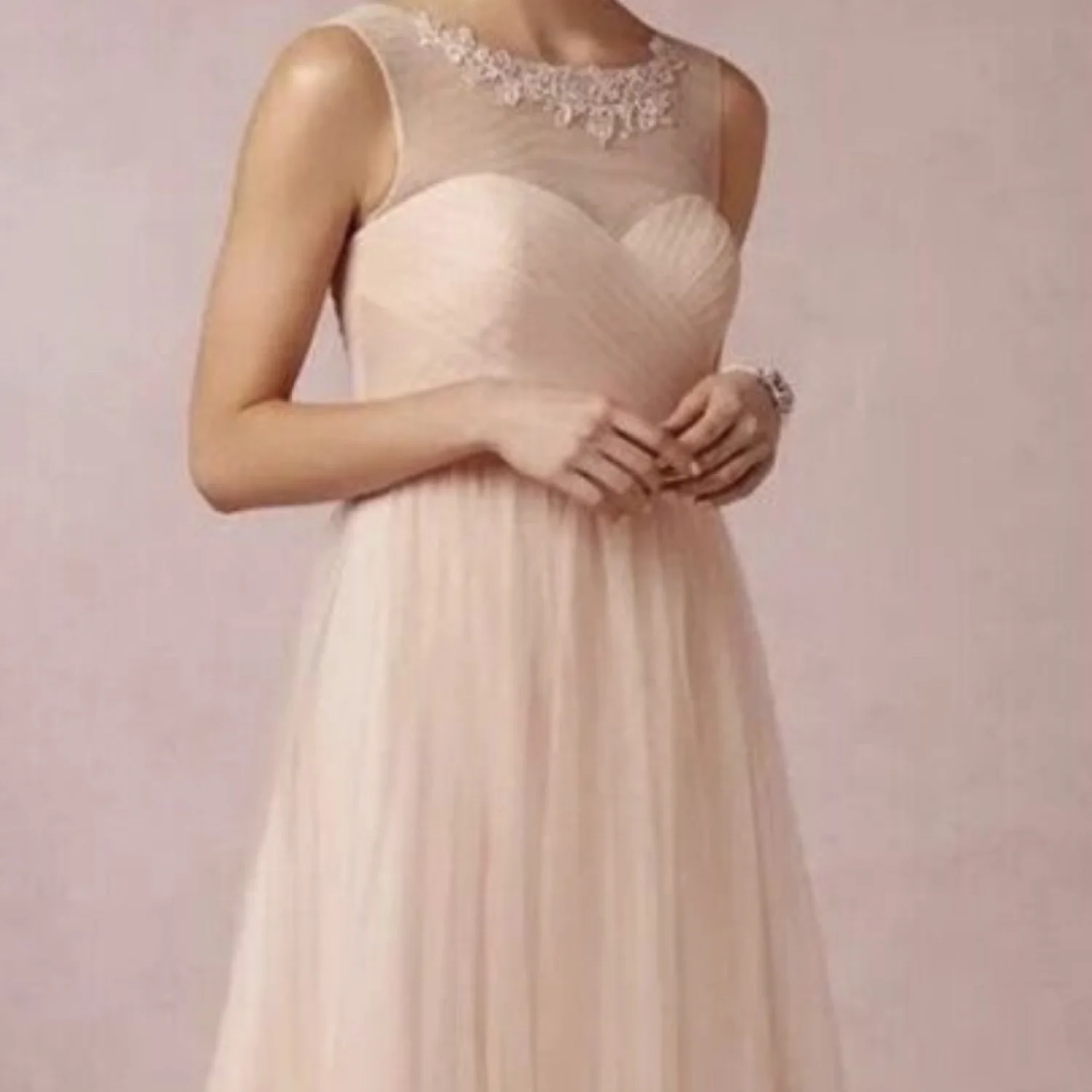 Delicate pale blush tulle skirt with a fitted sweetheart bodice. Sheer illusion neckline with subtle floral appliqué. Knee-length silhouette for elegant movement. Ideal for bridesmaids or formal occasions.