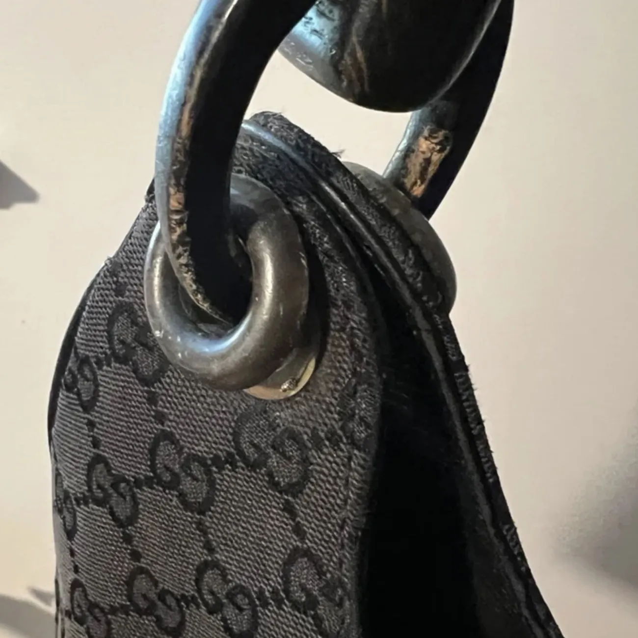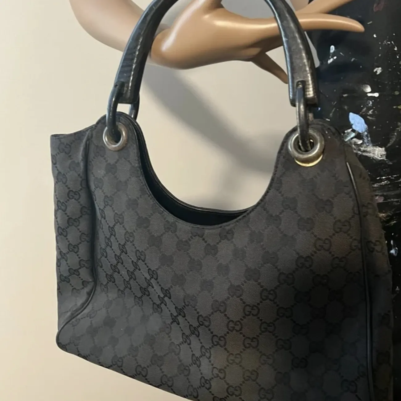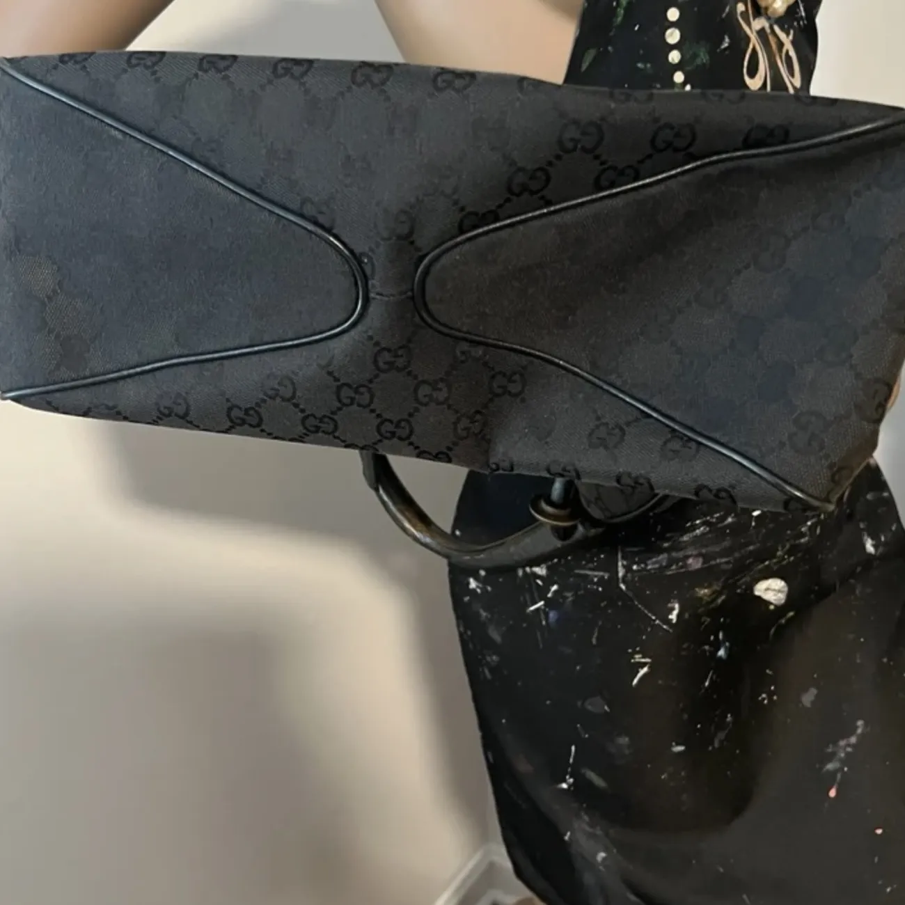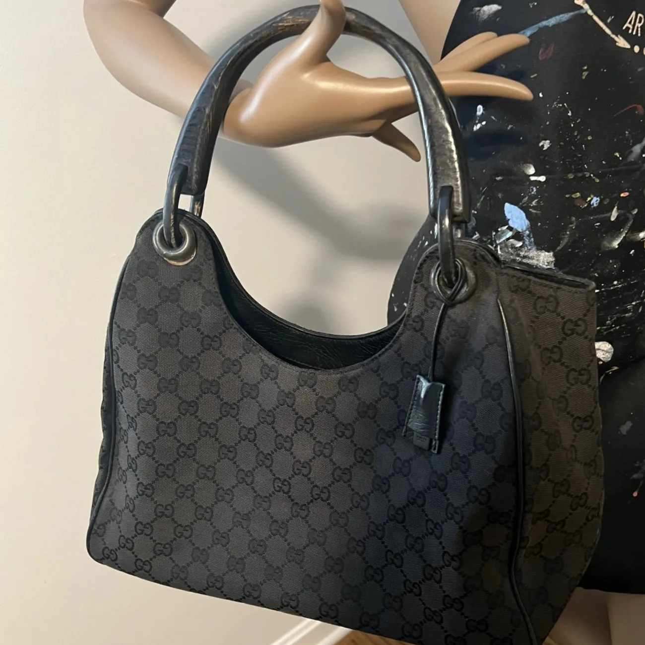 Black Gucci GG Logo Shoulder Bag Hardware: Black Wood Exterior Material: Canvas Lining Material: Cotton Handle/Strap: Wood *White Stain- inside bag Bag has loose wooden circles around the bottom handle Inside zipper pocket Open face interior Serial Number: 106494002404 Size 13” length @ base highest is 10”x 5.5” wide @ base AUTHENTIC𖥸
