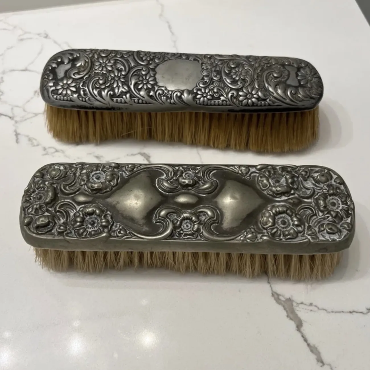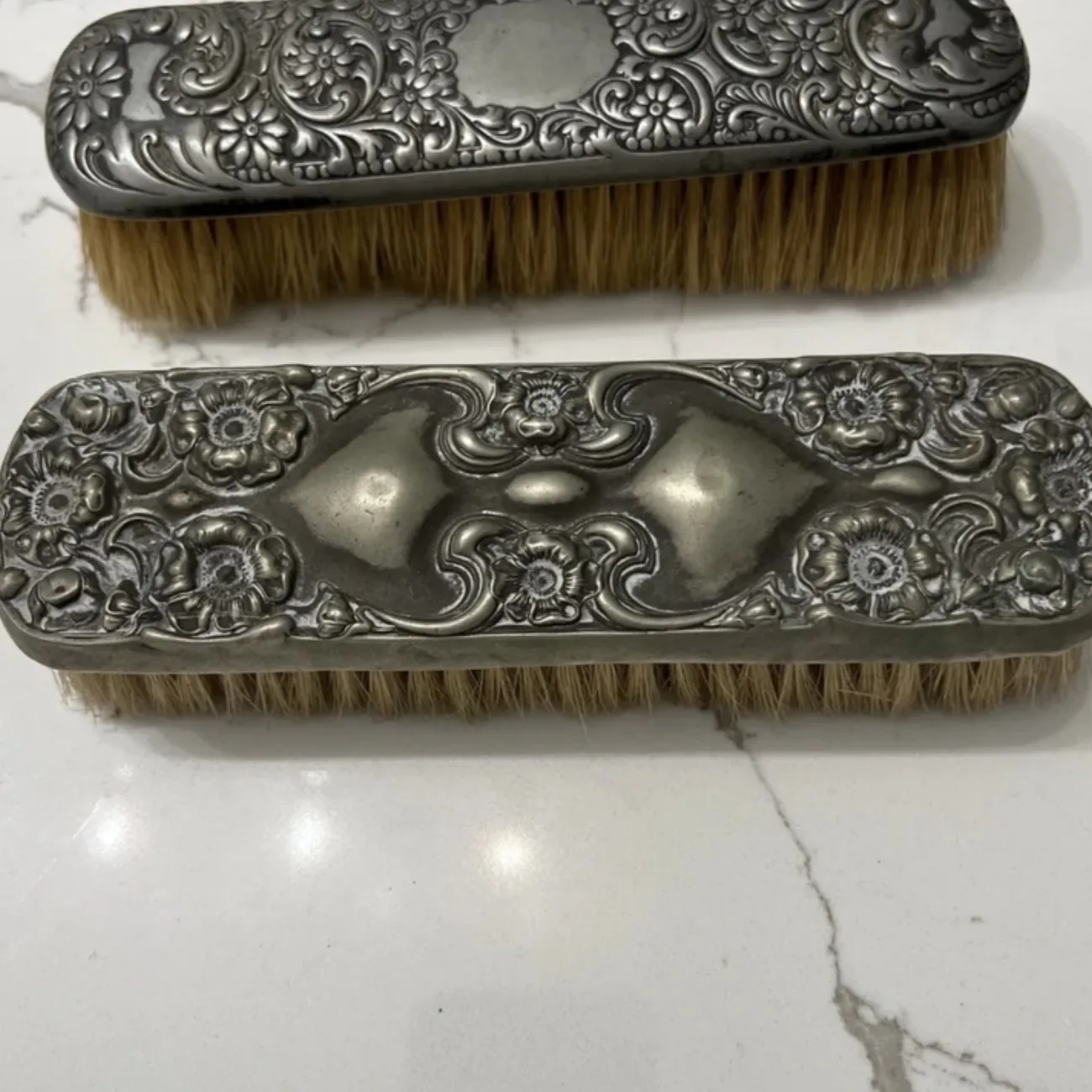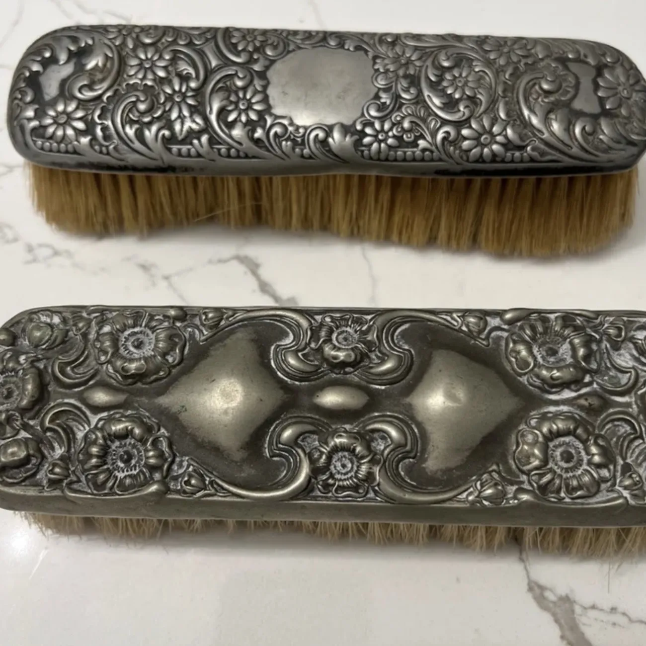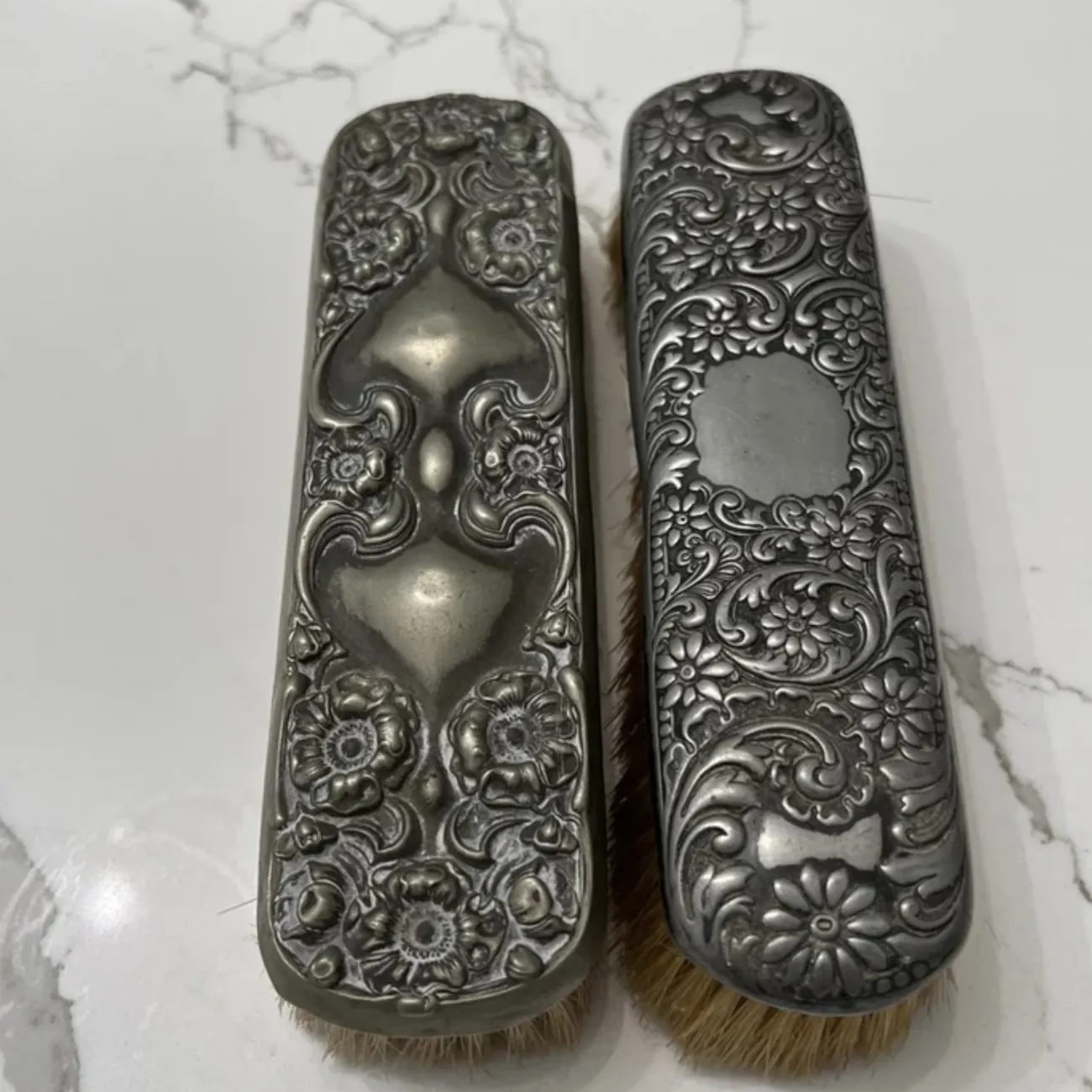Antique Intricate Details 7”x 2” Sold Together Some Bristles are missing in certain areas Chips in certain areas Small dents in areas Expected considering they are Antique. Otherwise in the condition is good.