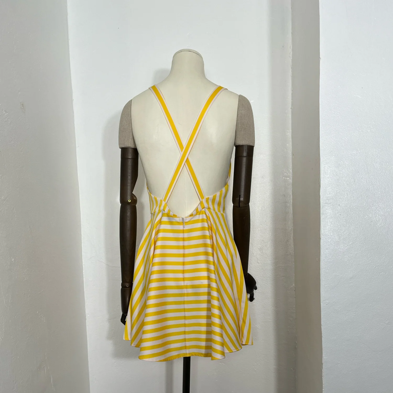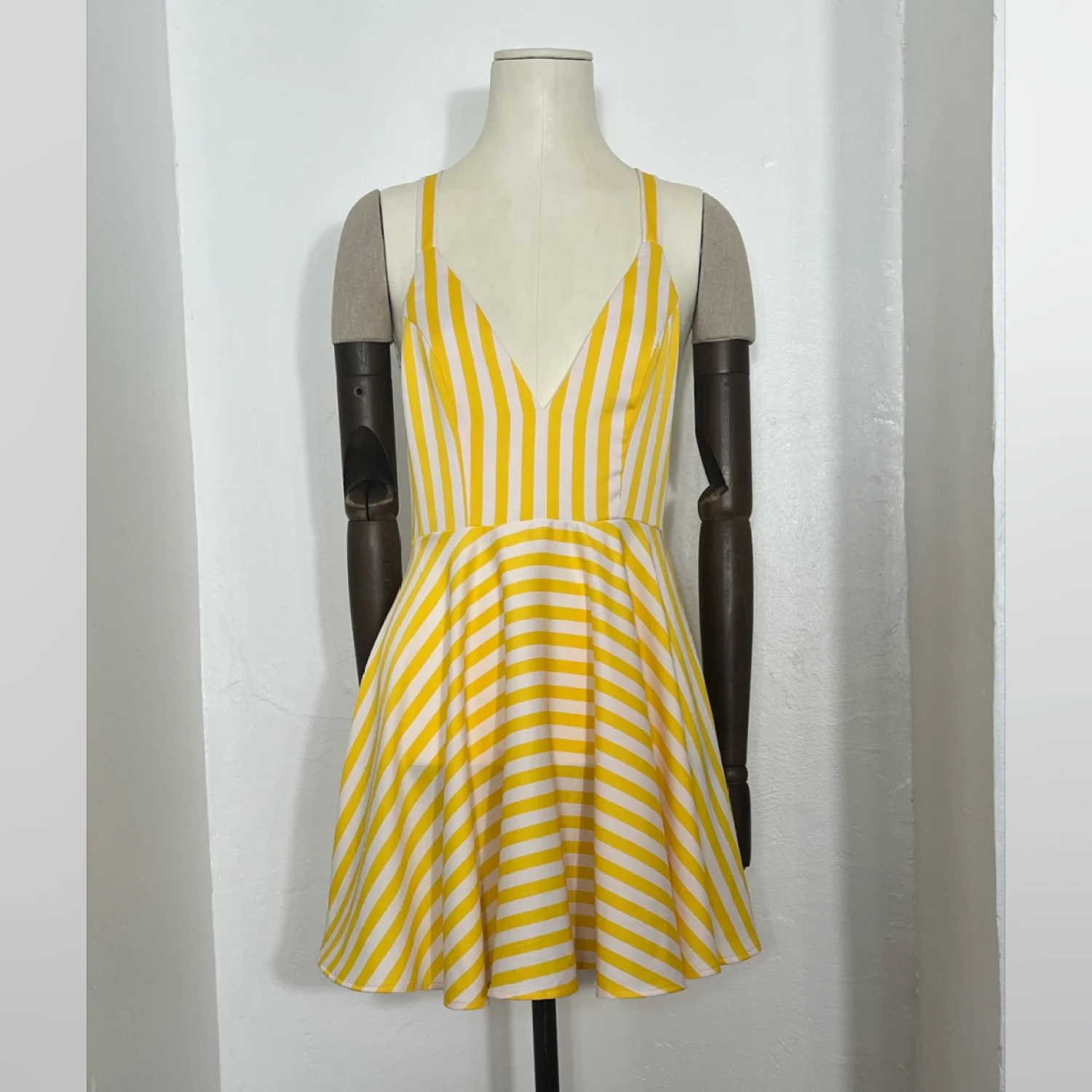 Michael Costello x Revolve yellow and white striped sundress. Features a flattering V-neckline, fit-and-flare silhouette, and crisscross back straps. Perfect for summer outings or casual events. Made from lightweight fabric. Size S. #summer #sundress #striped