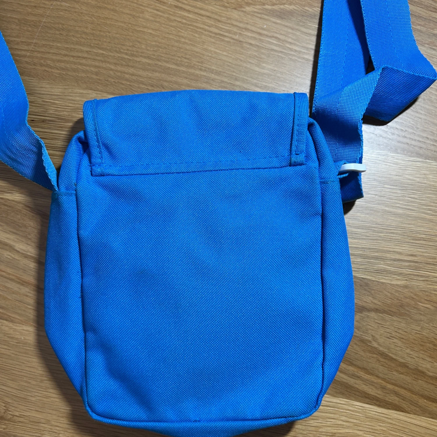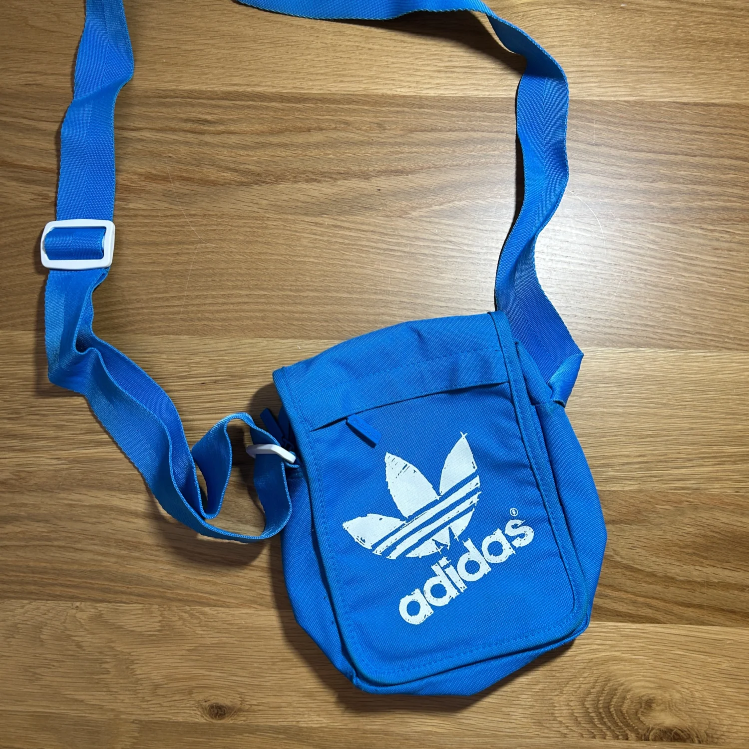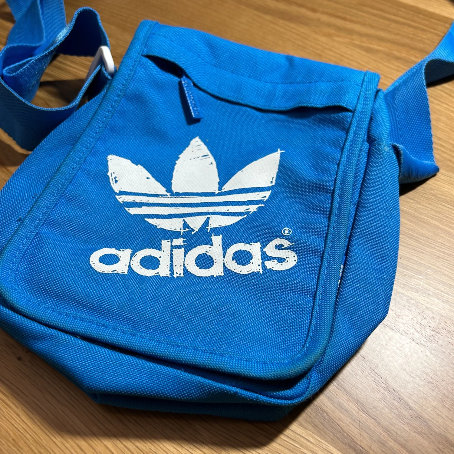 Vintage Adidas crossbody bag in vibrant blue. Features the iconic Trefoil logo in white on the front flap. Perfect for casual outings, this bag comes with an adjustable shoulder strap and a practical velcro closure. Ideal for carrying essentials while on the go. #Adidas #Vintage #CrossbodyBag