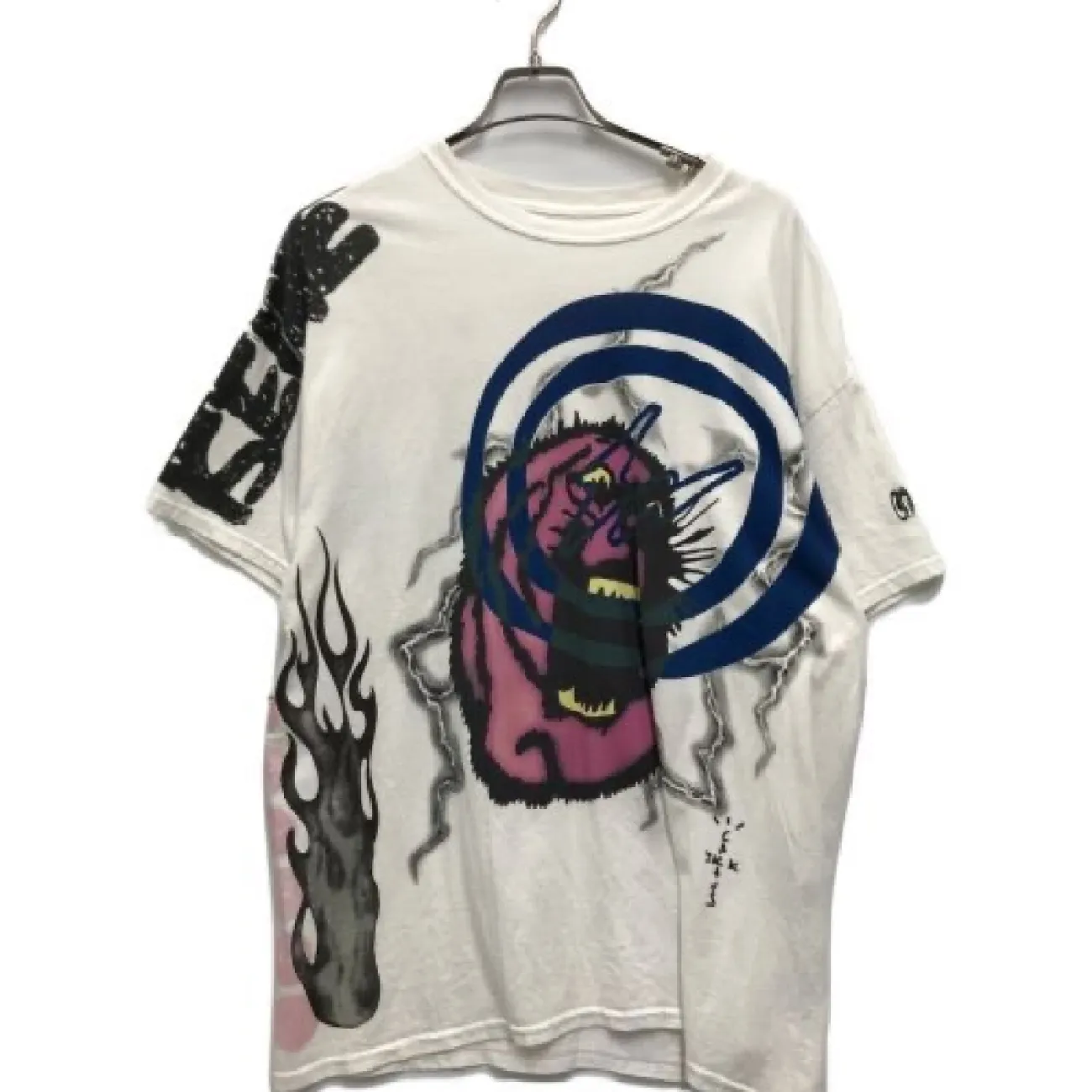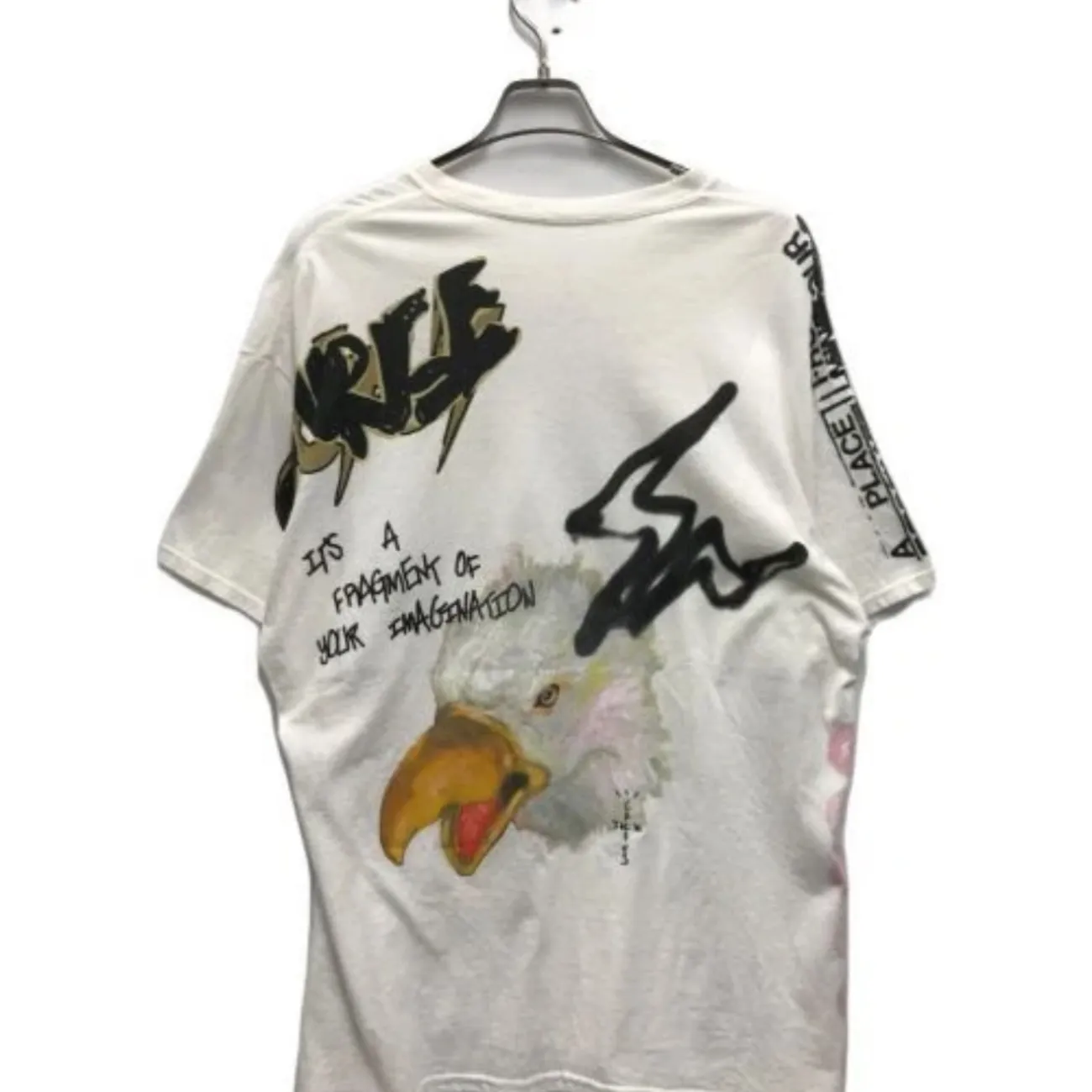 White tee featuring an eagle and monster graphic on the front and back, with additional text and designs.