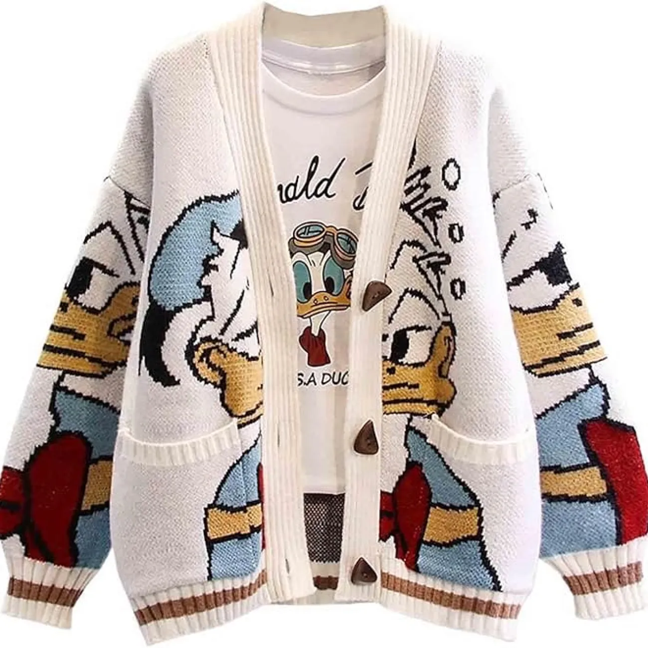 A white cardigan with Donald Duck print and a round neck. The cardigan is made of a soft and comfortable material.