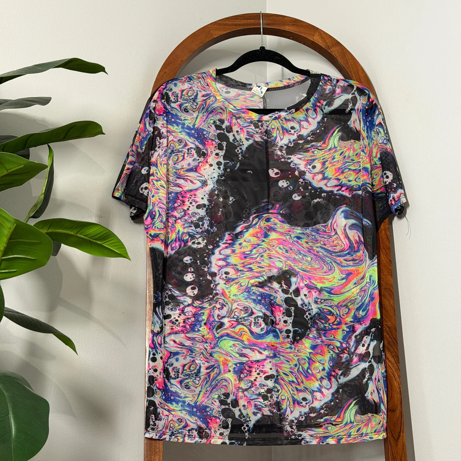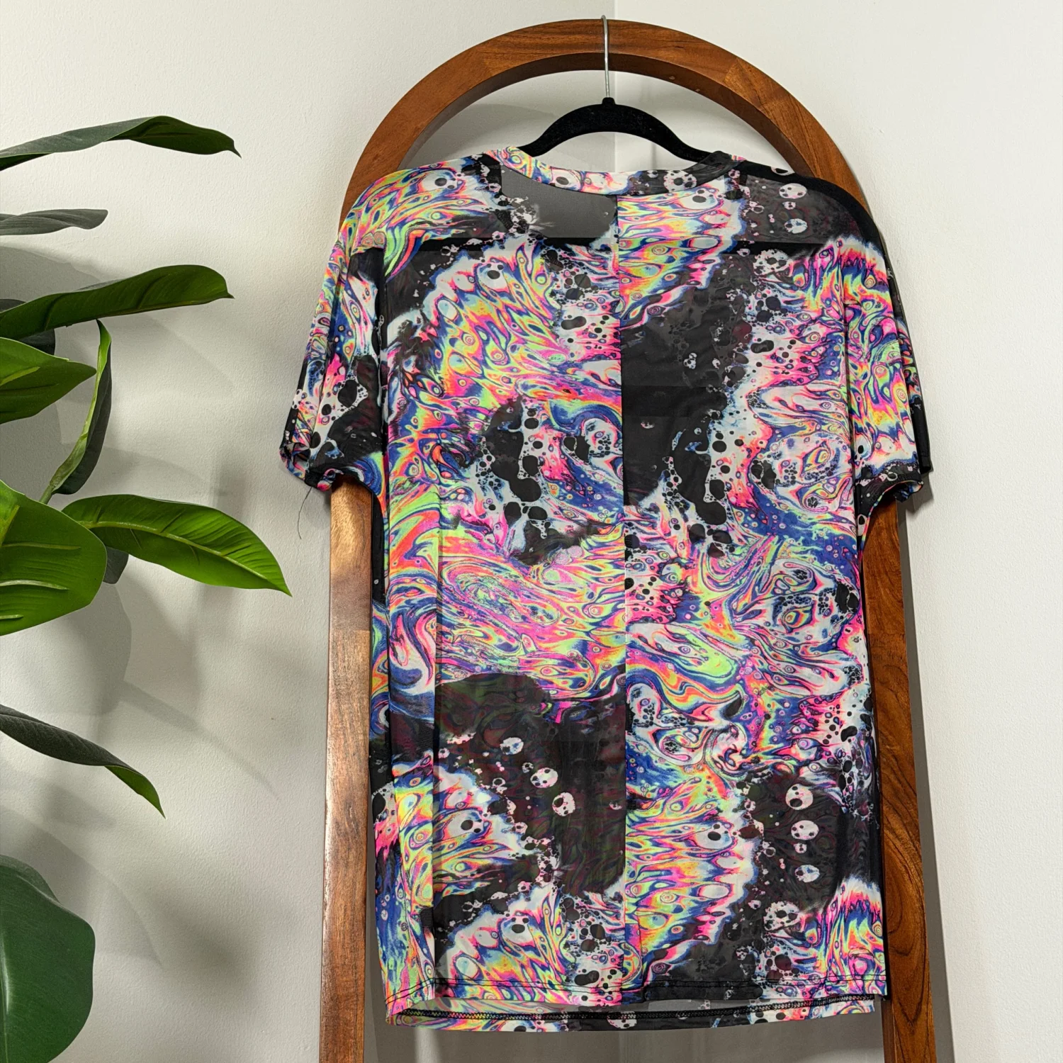 measures approx 26.5in long 22in pit to pit SMALL short sleeve psychedelic mesh shirt from i heart raves. Does not indicate but it could be unisex and it seems oversized, see measurements. Made in the USA. In great preloved condition. Find me on poshmark dmpr16
