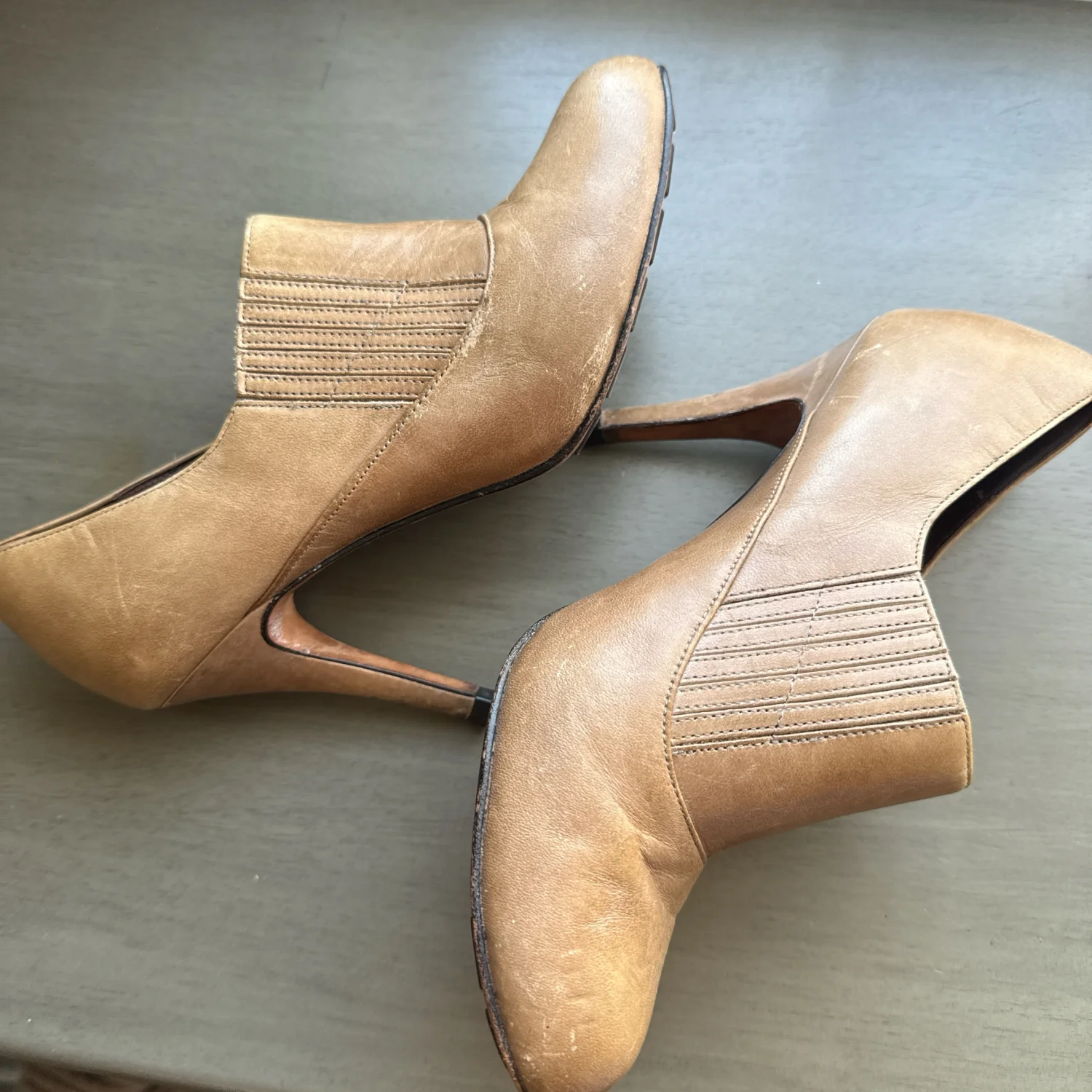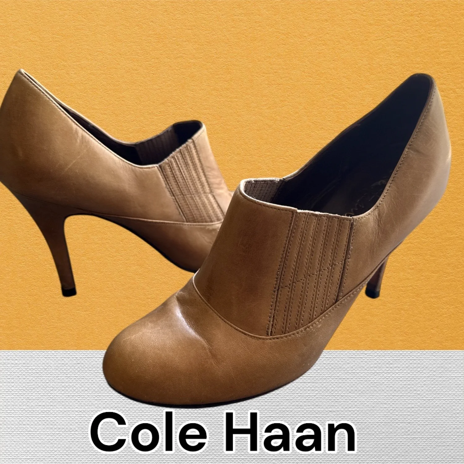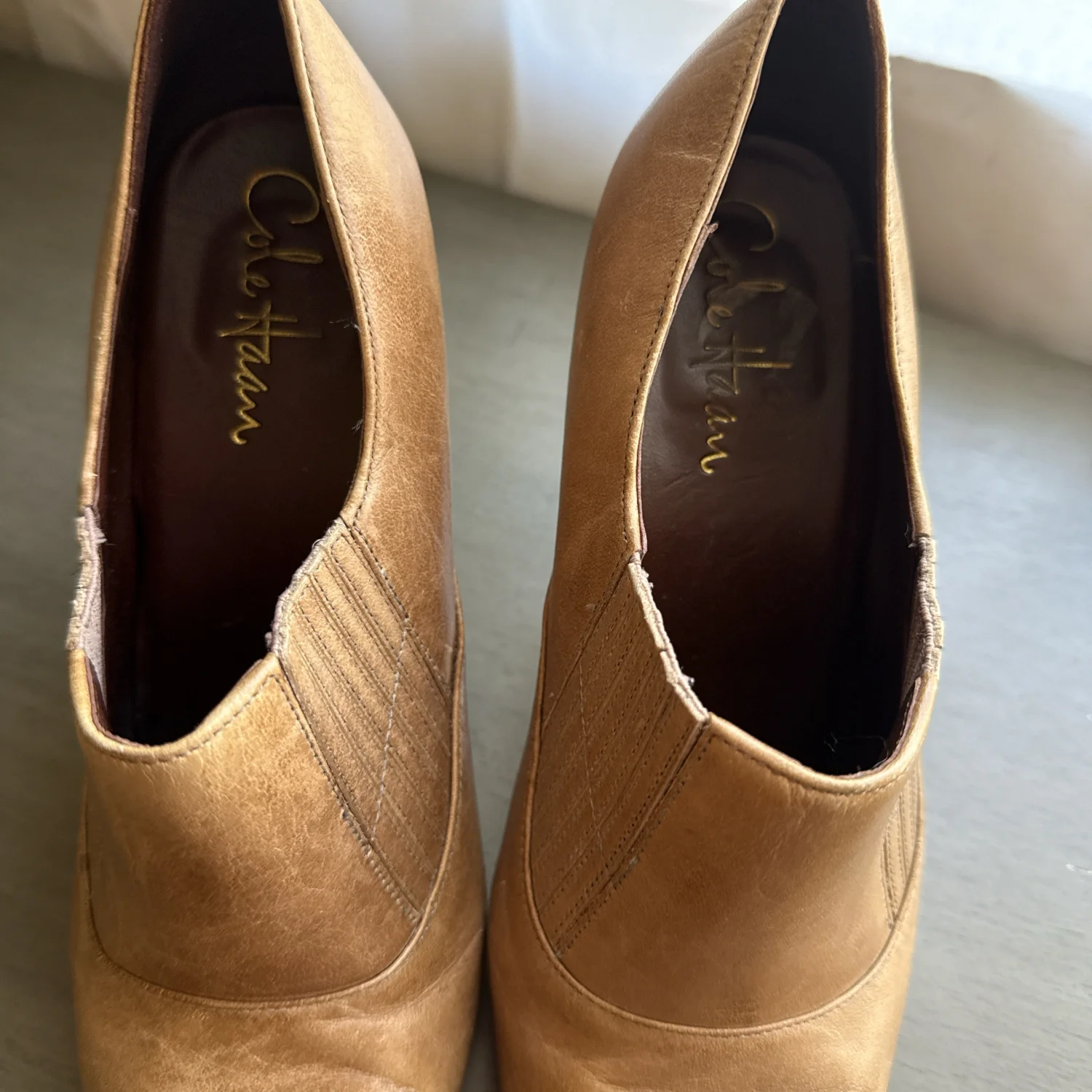Cole Haan leather booties in a beautiful brown color, featuring a sleek high heel design. These shoes have an elastic side panel for easy slip-on wear. Perfect for casual or formal occasions. Lightly used with some creasing, and some natural wear blemishes but overall in great condition. 4.5" heel. Size 7.5. I purchased these on a resale market, but they are a tad too small in the toe area for me. Great pre-love condition has obvious signs of wear in photos, but nothing that It’s not wearable. Perfect for the office are going out on the town. #Retro #colehaan #boot #Vintage tan leather ankle boots, heeled boots, pointed toe, office wear, stylish footwear, versatile shoes, daytime to night, worn-in leather, professional look, elegant ankle boot. Preloved. #ColeHaan #Booties #Heels #Leather #Tan