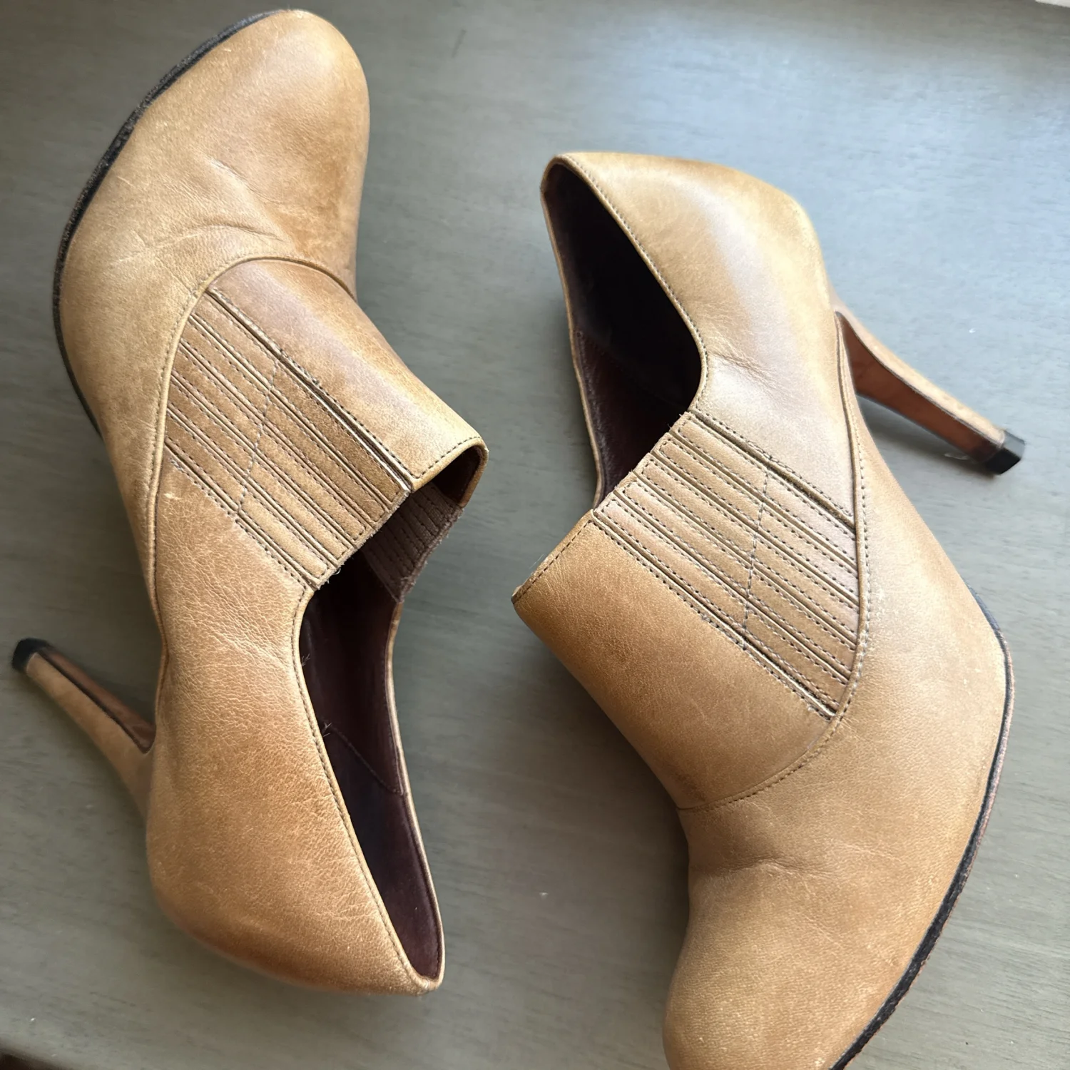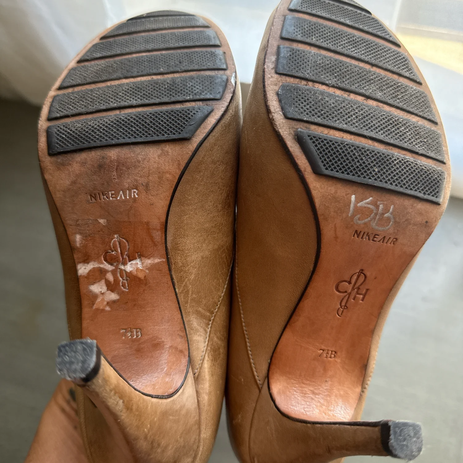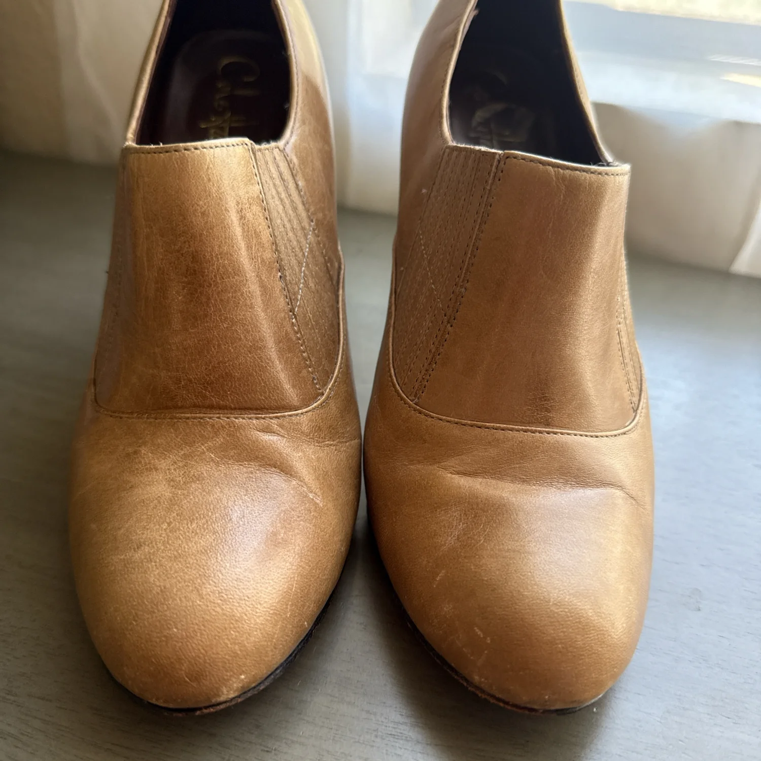 Cole Haan leather booties in a beautiful brown color, featuring a sleek high heel design. These shoes have an elastic side panel for easy slip-on wear. Perfect for casual or formal occasions. Lightly used with some creasing, and some natural wear blemishes but overall in great condition. 4.5" heel. Size 7.5. I purchased these on a resale market, but they are a tad too small in the toe area for me. Great pre-love condition has obvious signs of wear in photos, but nothing that It’s not wearable. Perfect for the office are going out on the town. #Retro #colehaan #boot #Vintage tan leather ankle boots, heeled boots, pointed toe, office wear, stylish footwear, versatile shoes, daytime to night, worn-in leather, professional look, elegant ankle boot. Preloved. #ColeHaan #Booties #Heels #Leather #Tan