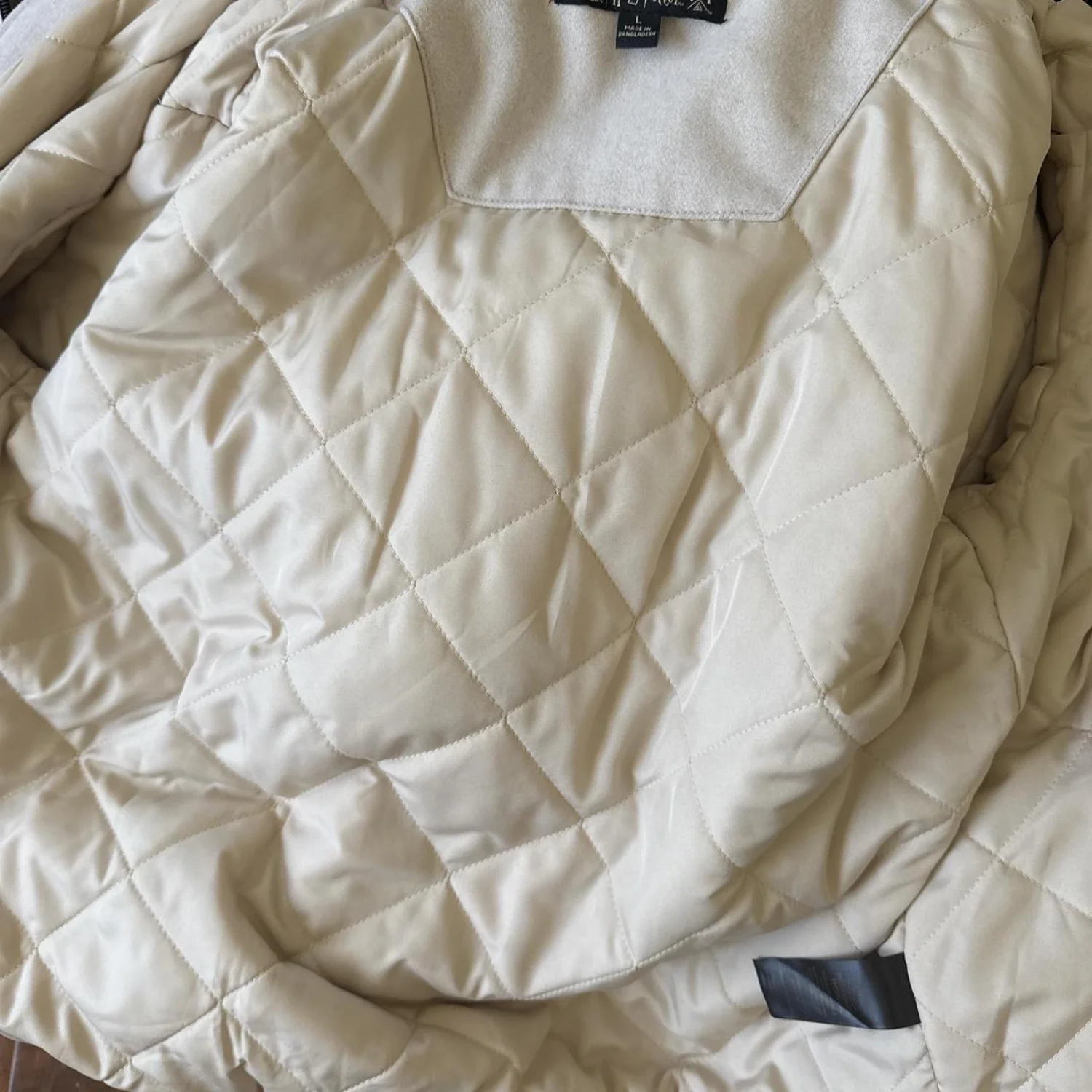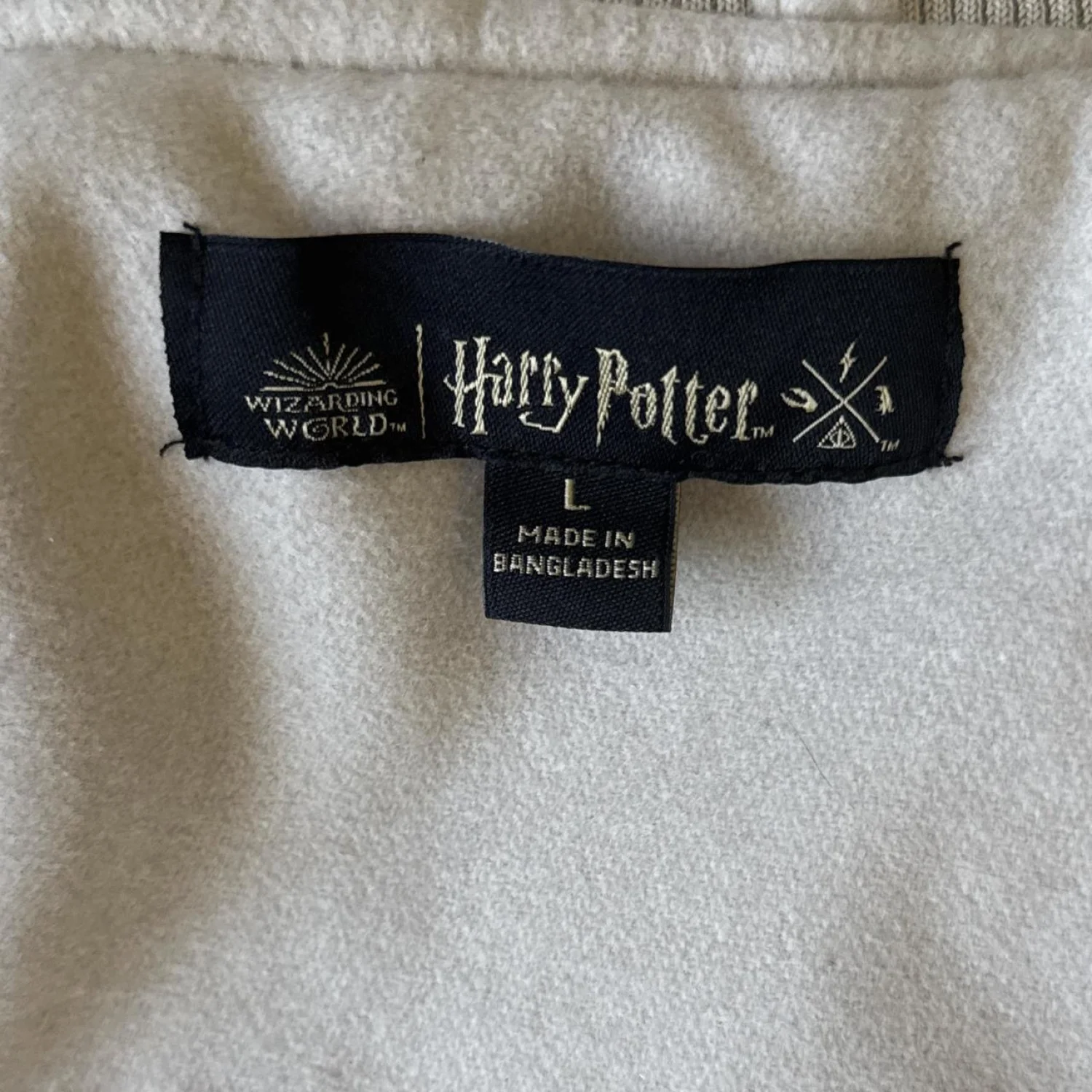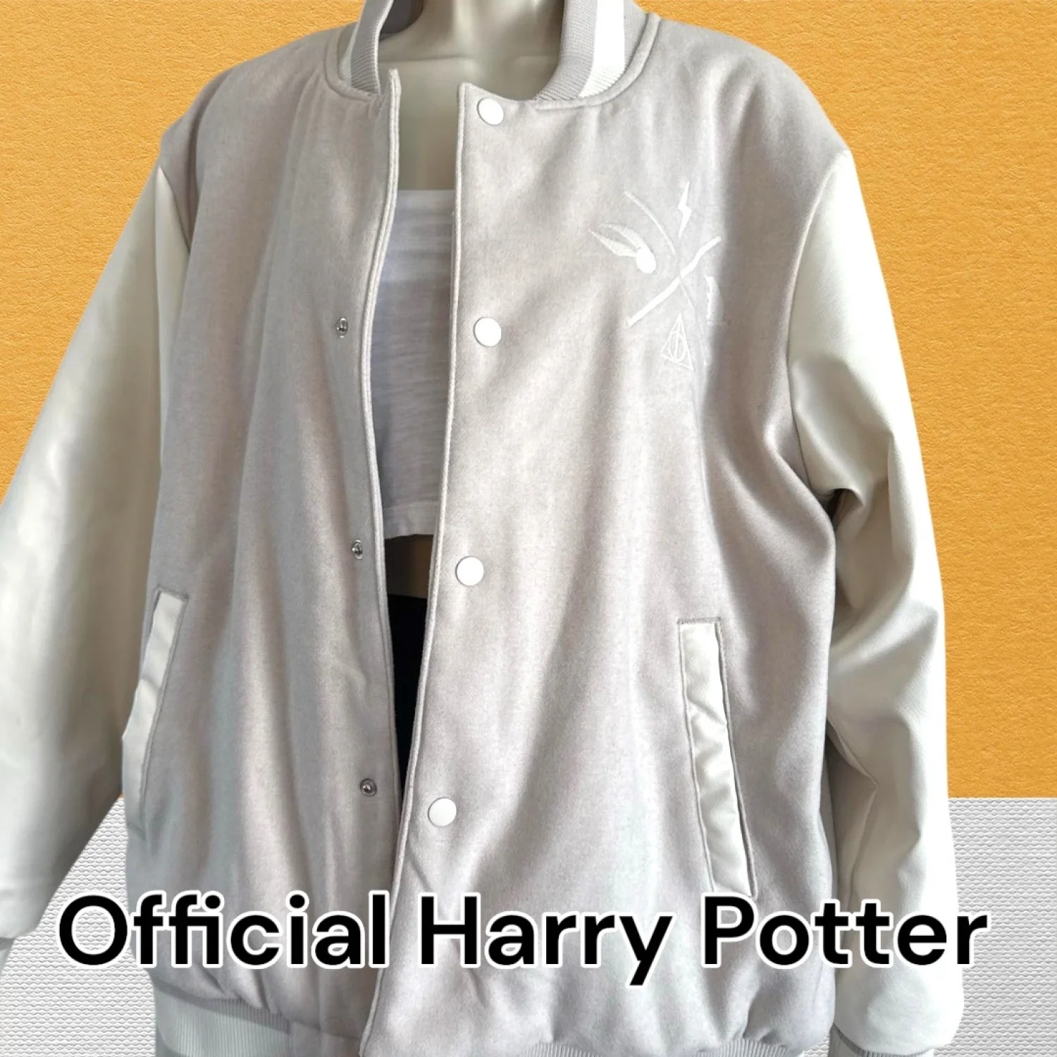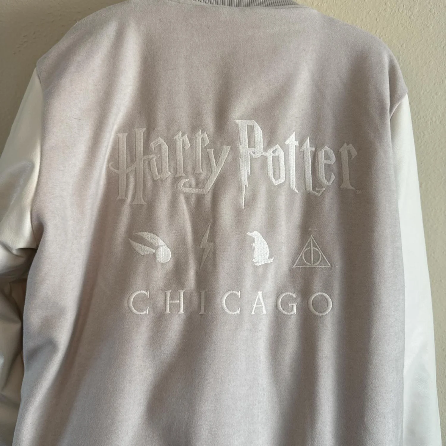 Official Harry Potter varsity jacket featuring 'Chicago' embroidery. This jacket has a light grey body with white sleeves and buttons. It includes iconic Harry Potter symbols embroidered on the front and back. The interior is quilted for extra warmth. Tags indicate manufacture by Wizarding World. Perfect for Harry Potter fans and collectors. Official Harry Potter varsity jacket. Bomber style jacket. Worn twice in excellent Preloved condition hardly worn. This is from the Wizarding World of Harry Potter store in Chicago size large the color is an off-white cream, color and beige camel color. The lining is beautiful in an excellent condition as well pockets on the outside snap button closure. Unisex jacket for both men and women. #HarryPotter #BomberJacket #VarityJacket #Wizard #Cosplay harry potter, varsity style, bomber jacket, cream color, beige accents, unisex, snap button, outer pockets, wizarding world, collectible #HarryPotter #VarsityJacket #Chicago