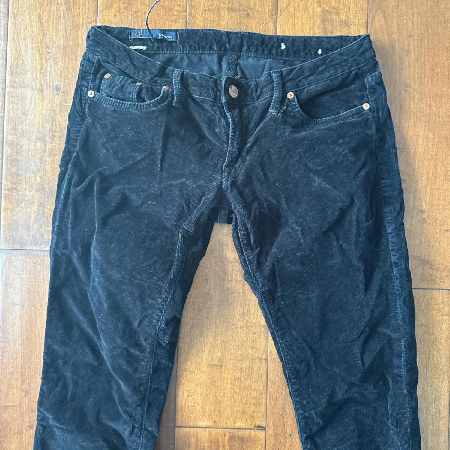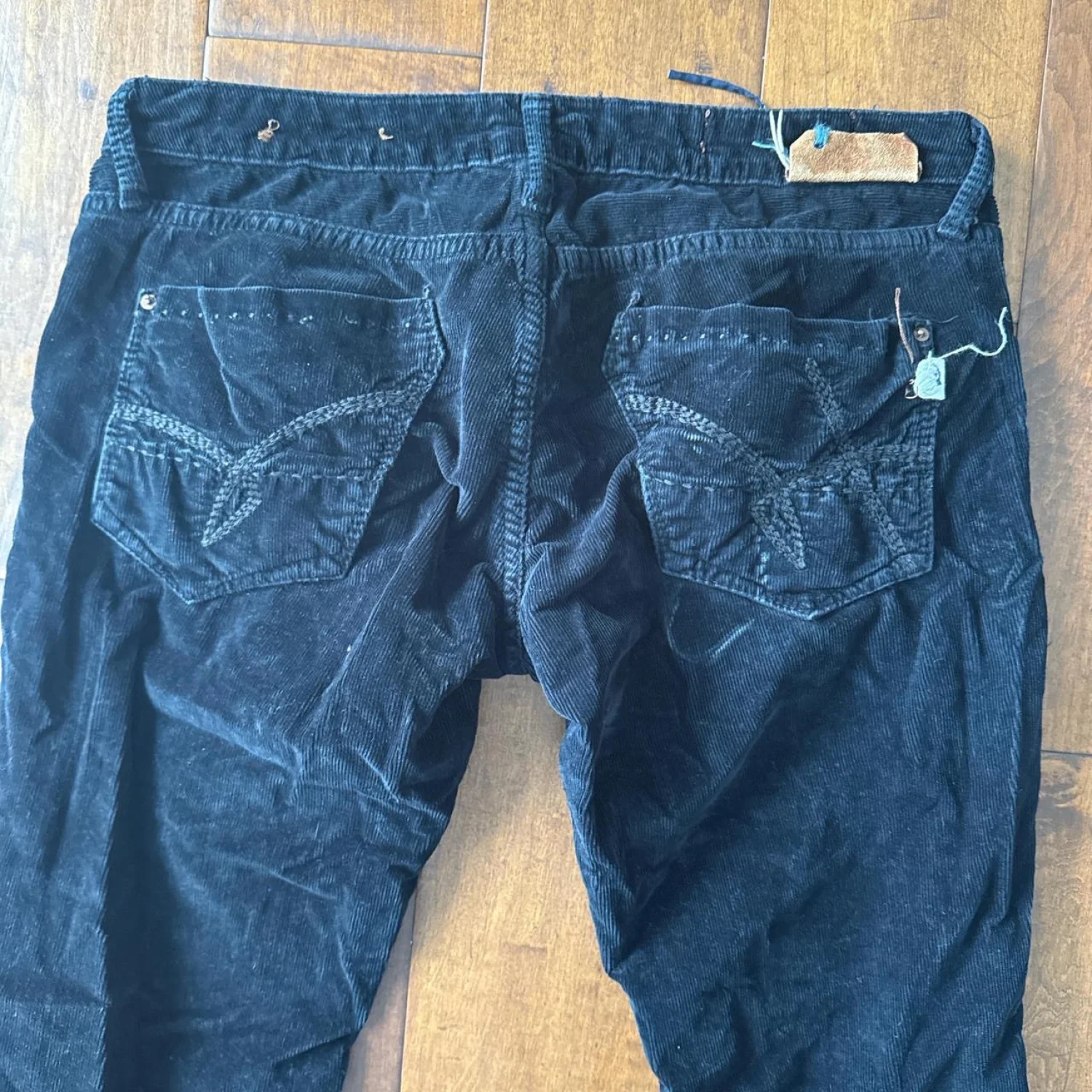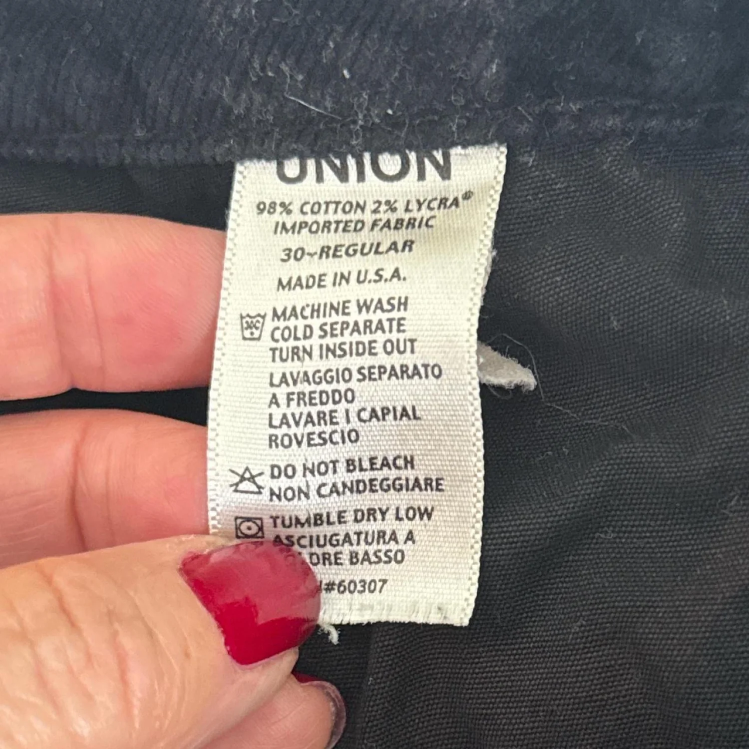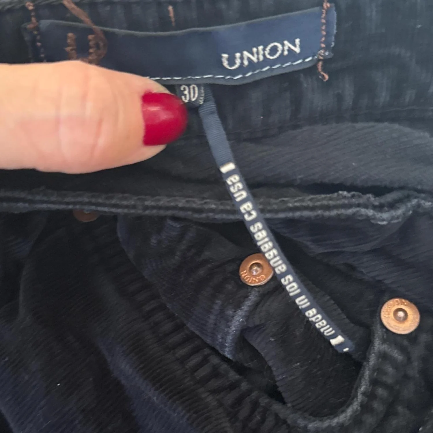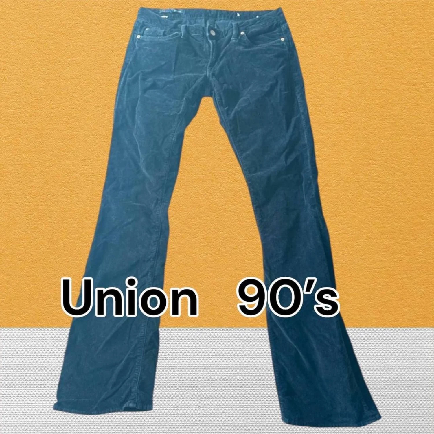Vintage Union brand corduroy pants styled in a nostalgic 90's fashion. These pants feature a classic flare cut with embroidered back pockets. Preloved. Made from 98% cotton and 2% Lycra, offering comfort and a slight stretch. The pants are labeled as size 30 Regular. Perfect for a retro look. Cotton black blend. Low waisted flattering fit. This is a thinner comfortable cord. Not thick so should be pretty quiet if your thighs rub. Care instructions: Machine wash cold inside out, tumble dry low. Tags: #vintage #90s #corduroy #flared