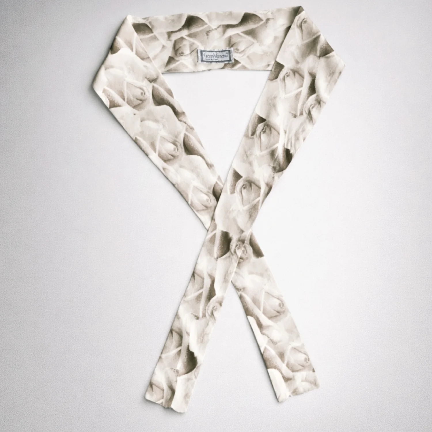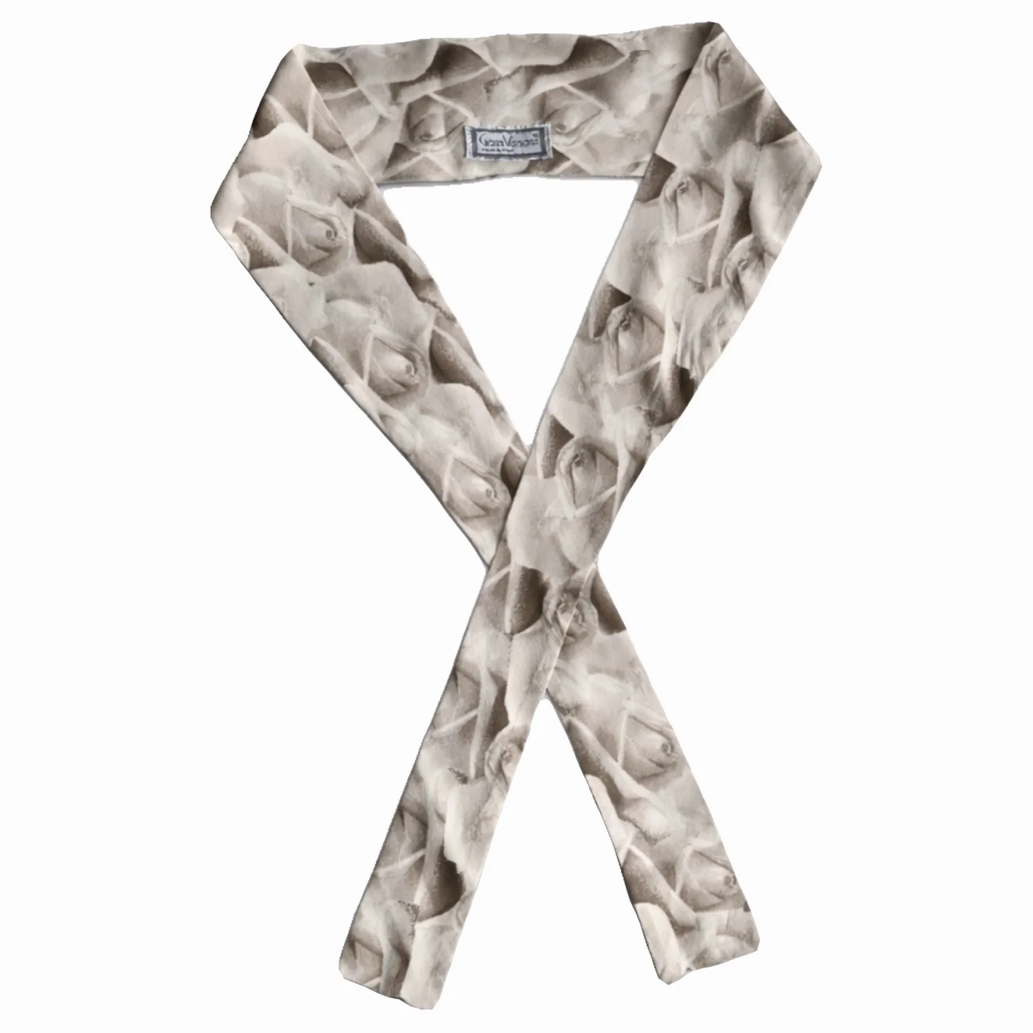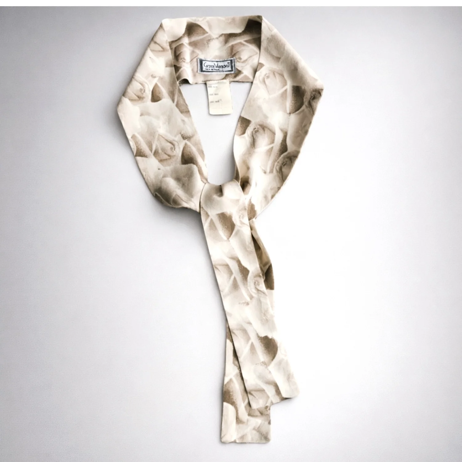 Gianni Versace Vintage 90’ silk tie scarf features a taupe roses prints on a beige background. Measure approximately 54” long / 3.1/2” center width 2” to 3” ends width Excellent condition