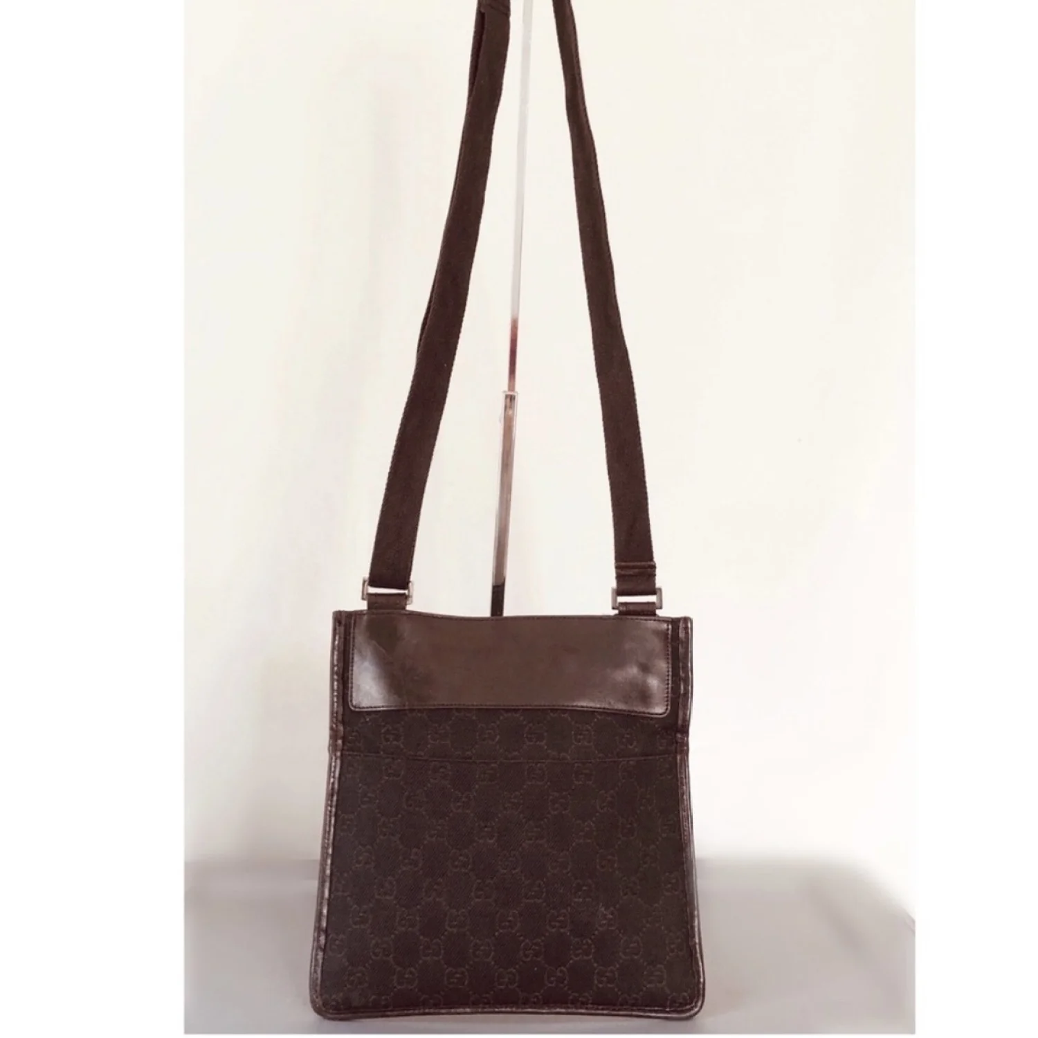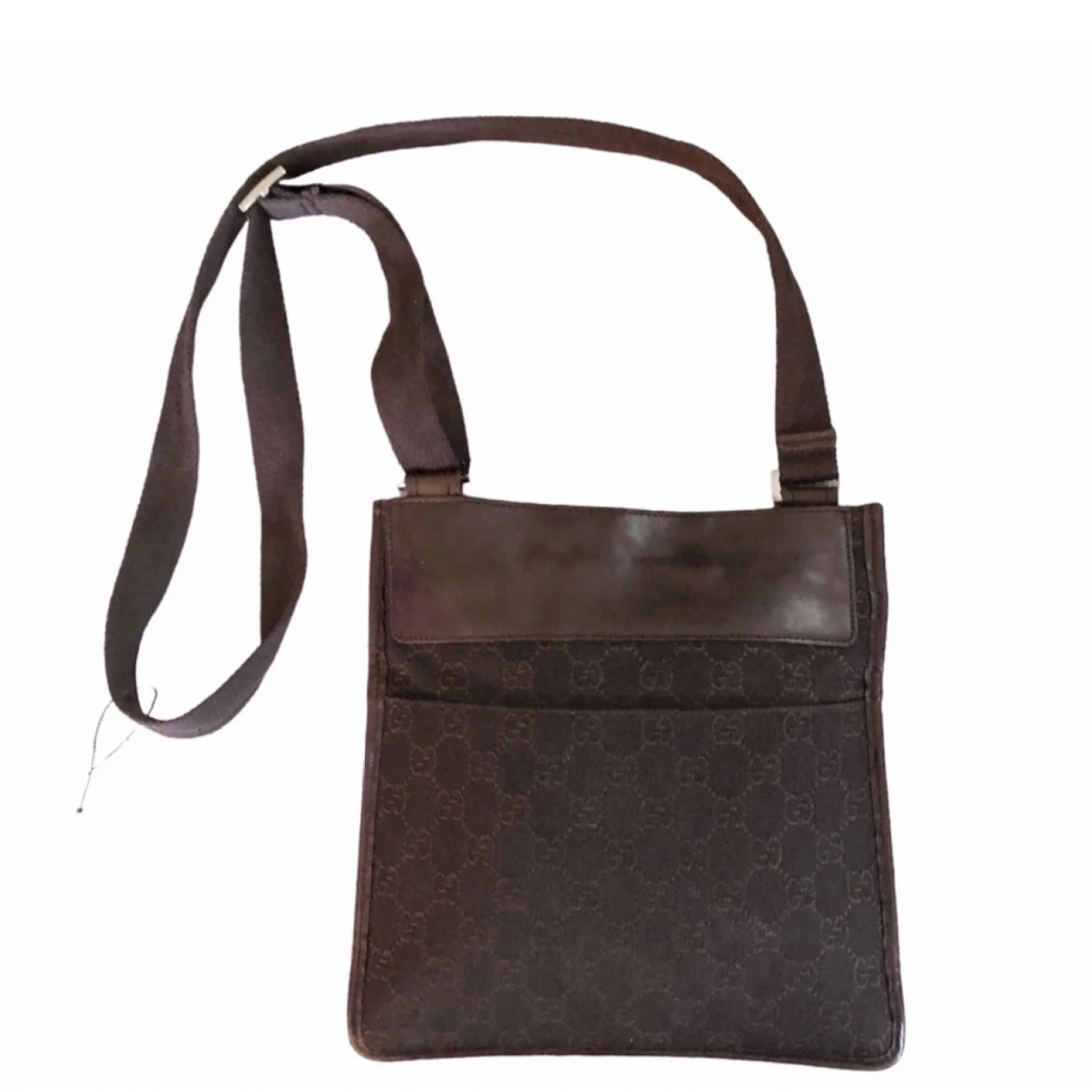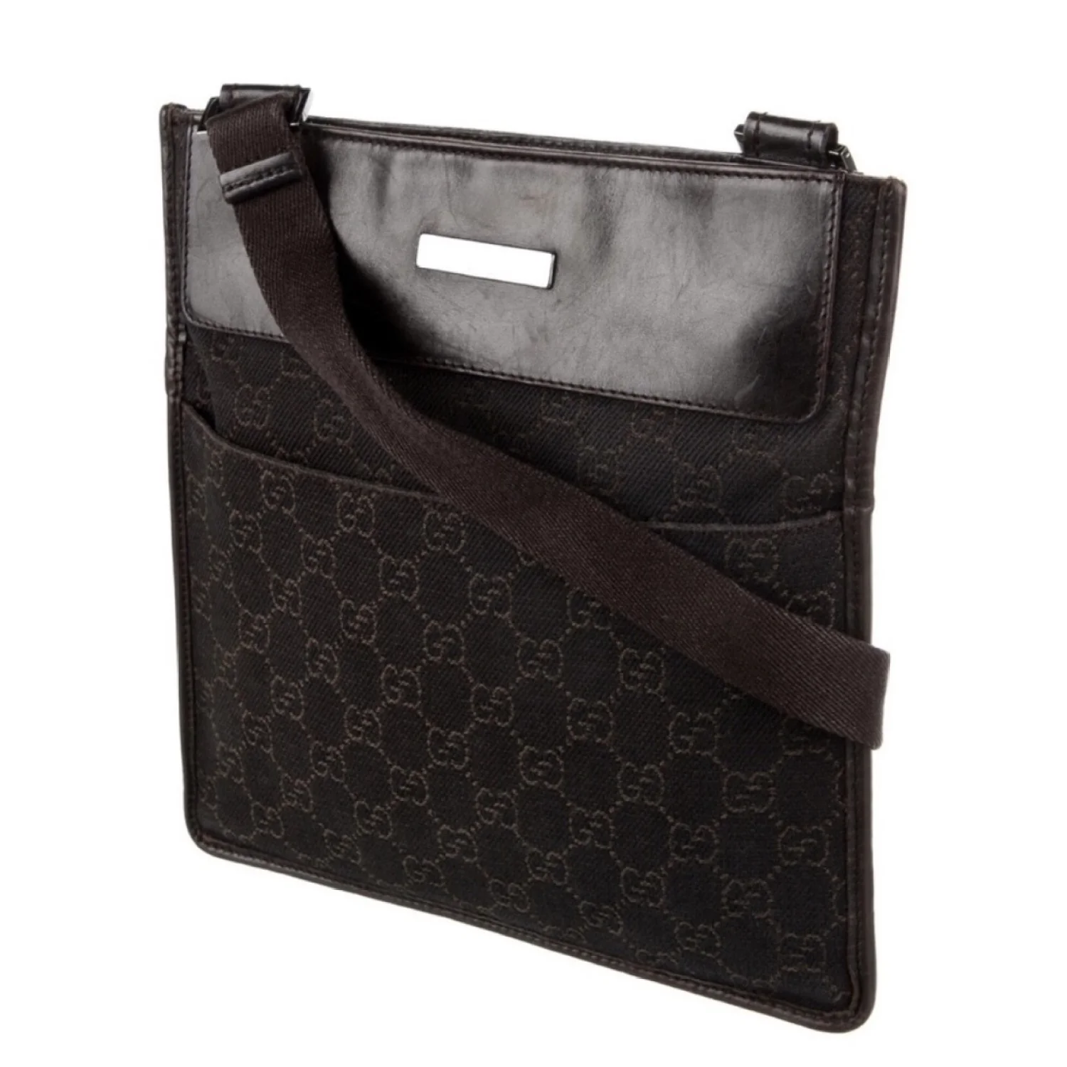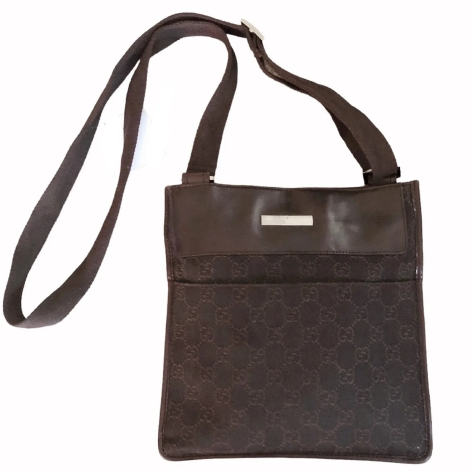 Gucci GG vintage brown canvas & leather crossbody features GG logo print on canvas with leather insert on top, front logo plaque, exterior front and back slip pockets adjustable brown canvas strap, velcro closure spacious interior with 1 zipper pocket, lined with brown fabric with logo print Silver tone hardware Measure approximately 9” W x 9.5” H x 1” D Strap drop 20”/29” Very good condition with just minor scratches on leather parts barely visible