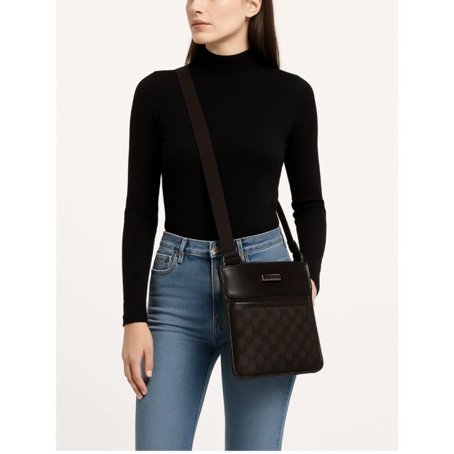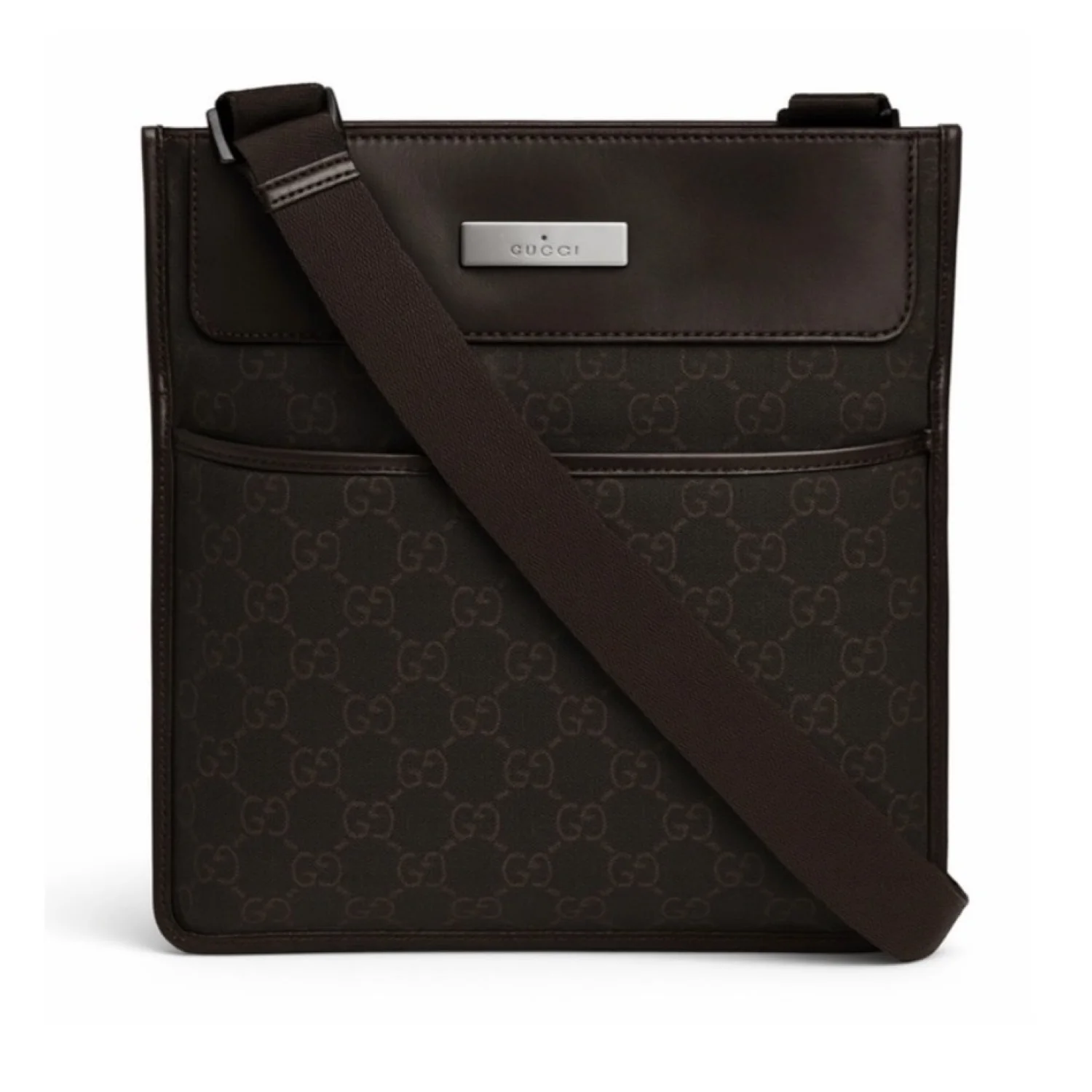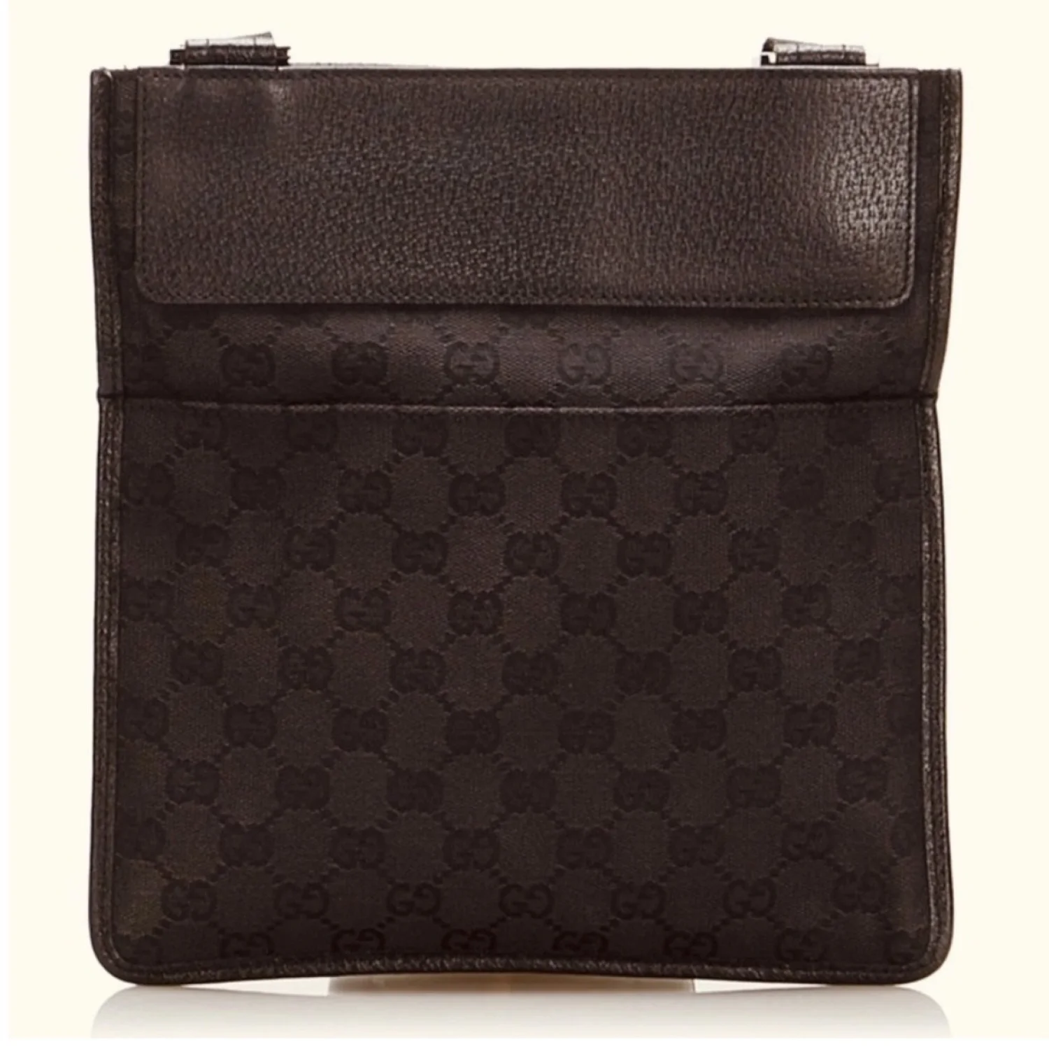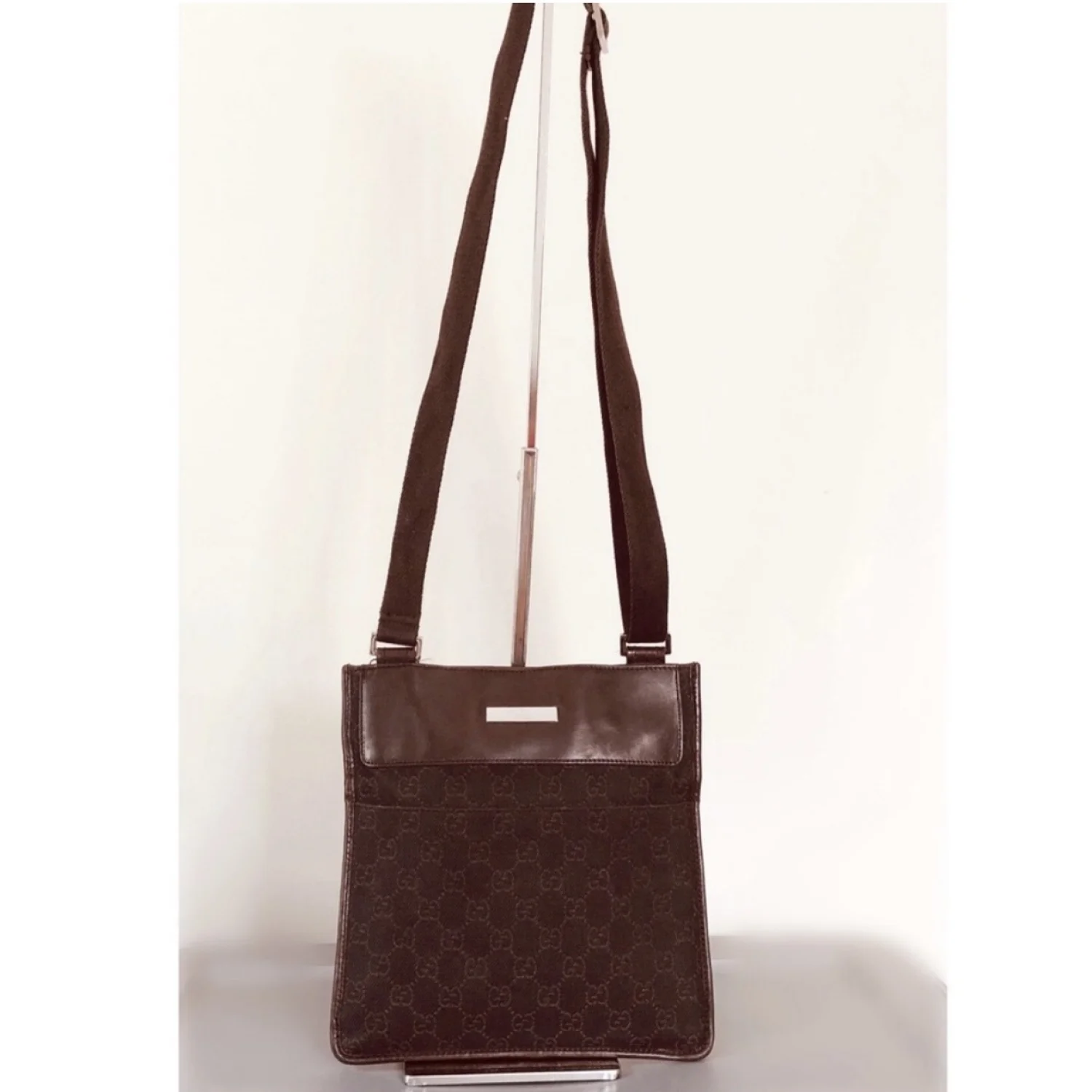 Gucci GG vintage brown canvas & leather crossbody features GG logo print on canvas with leather insert on top, front logo plaque, exterior front and back slip pockets adjustable brown canvas strap, velcro closure spacious interior with 1 zipper pocket, lined with brown fabric with logo print Silver tone hardware Measure approximately 9” W x 9.5” H x 1” D Strap drop 20”/29” Very good condition with just minor scratches on leather parts barely visible