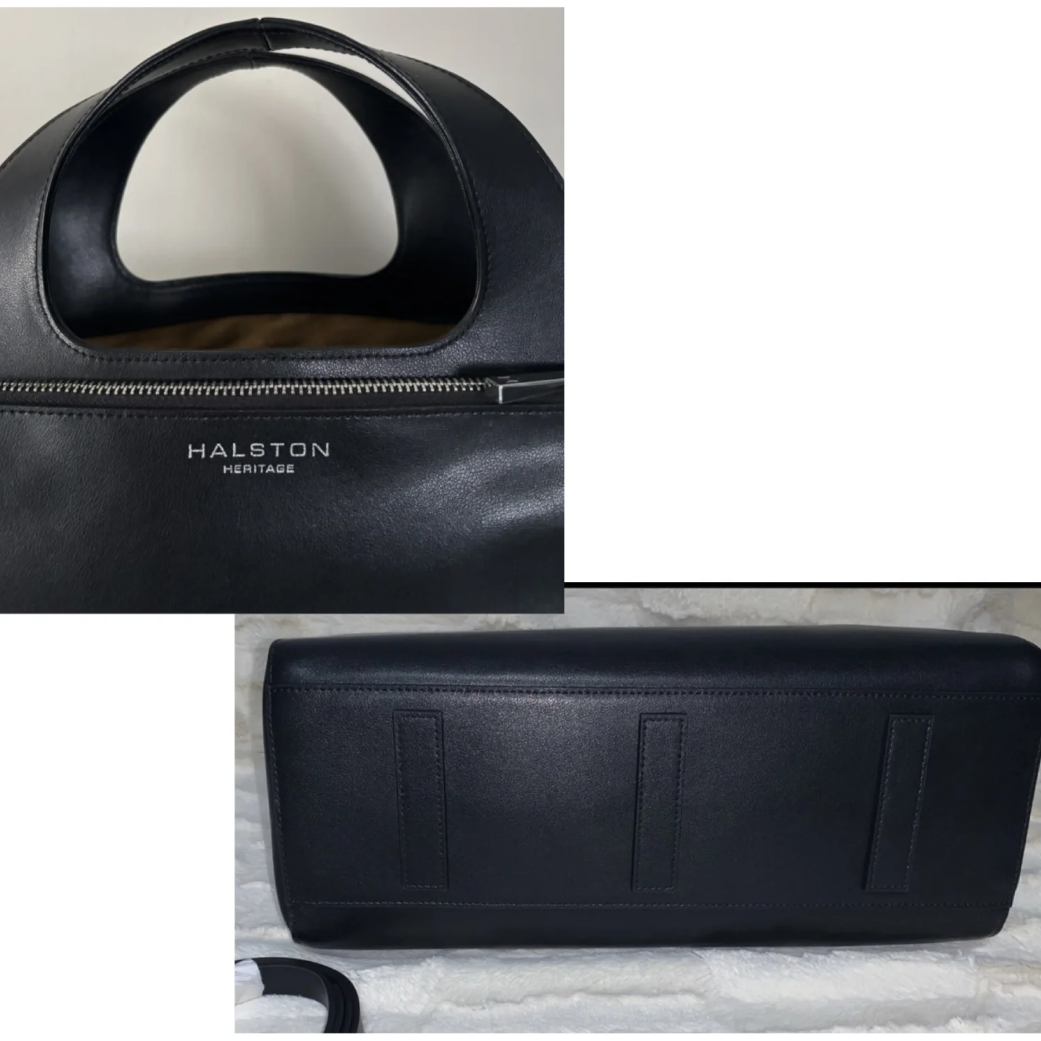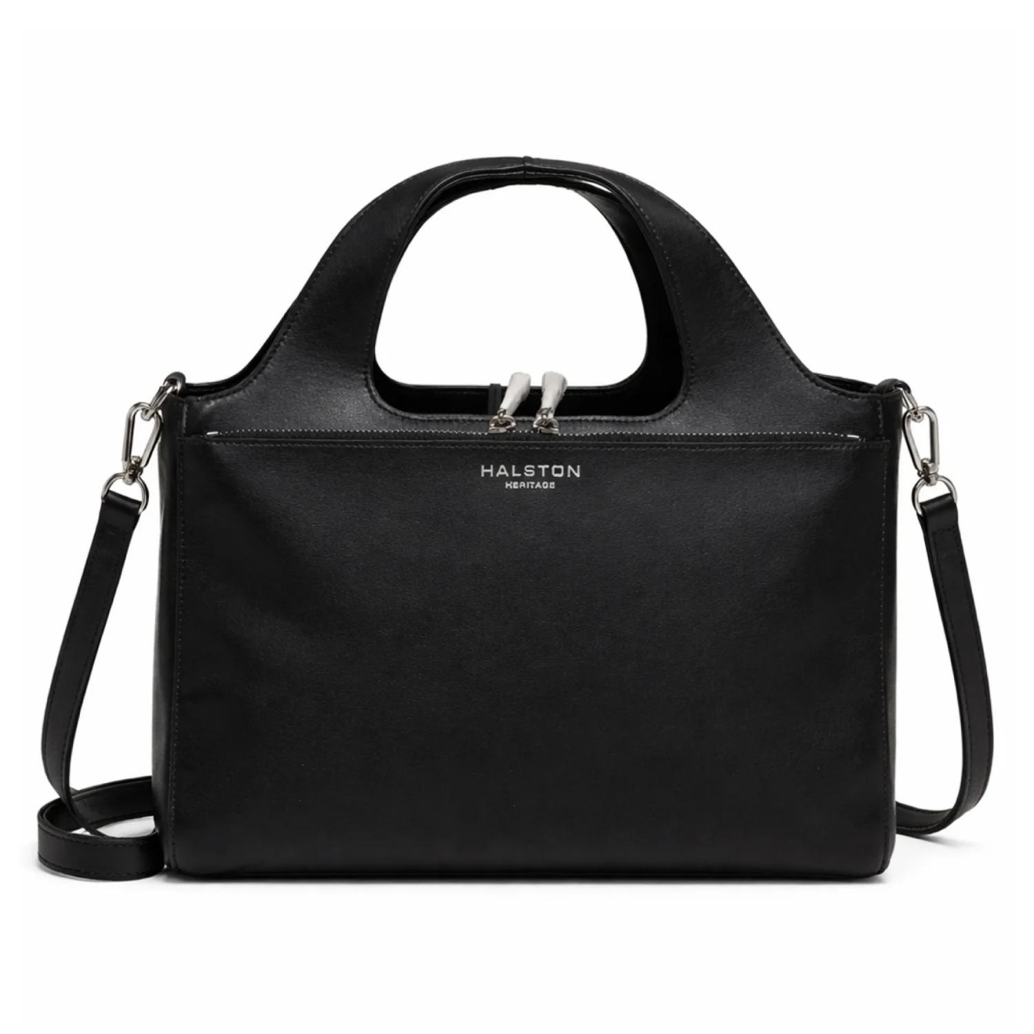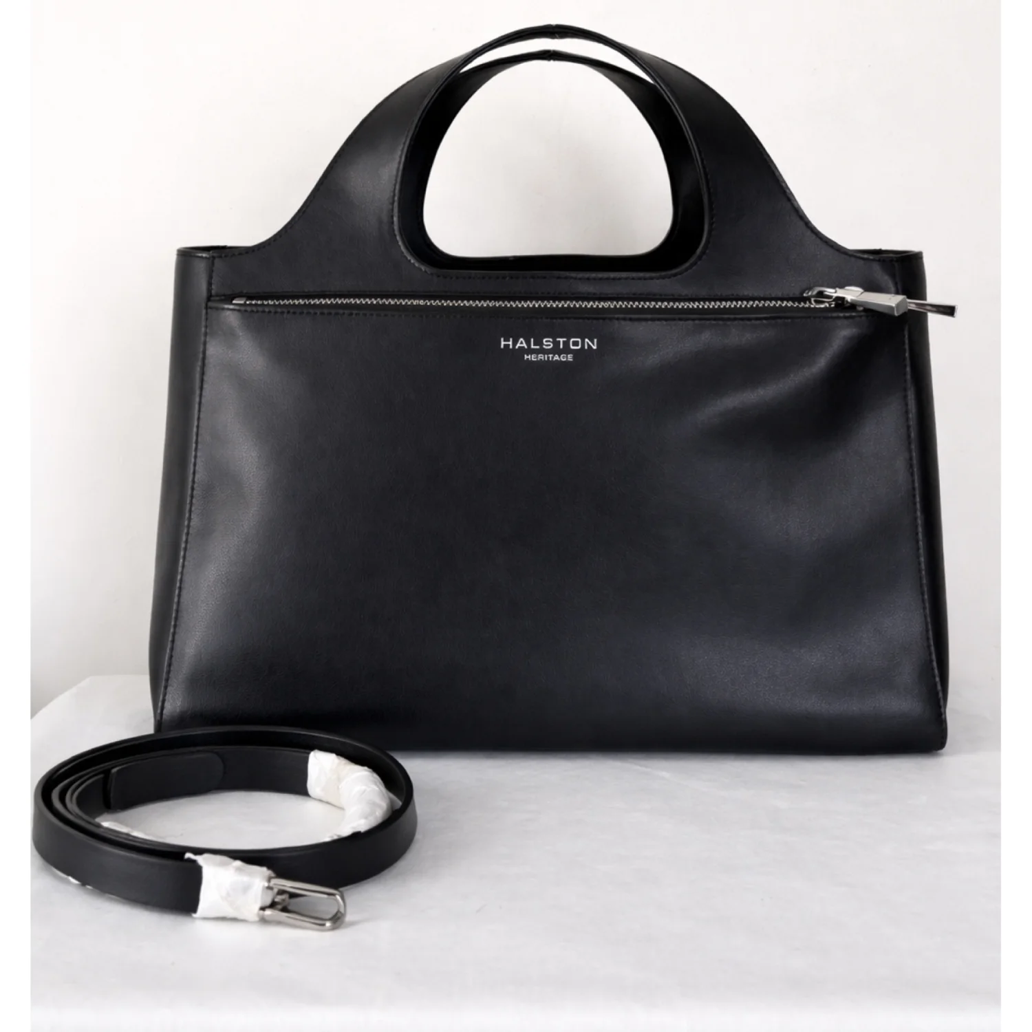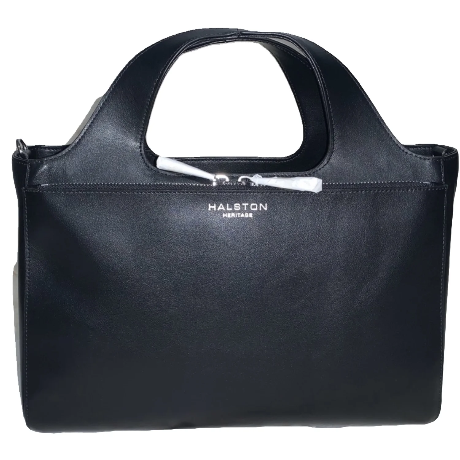 Halston Heritage black leather satchel bag features a structured silhouette with integrated circular top handles and front facing zipper pocket with silver tone logo details Interior lined with suede microfiber fabric 1 zipper pocket and 2 slip pockets Bottom with reinforced tabs Has detachable and removable straps Measure approximately 13.5”W x 8.5”H x 5” W Handle drop 4” Strap up to 24” drop Excellent like new condition