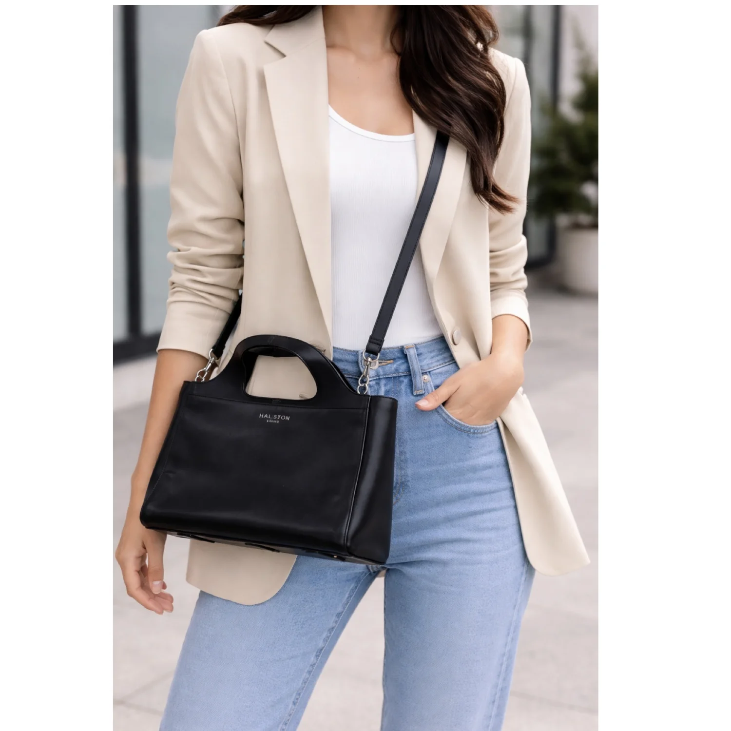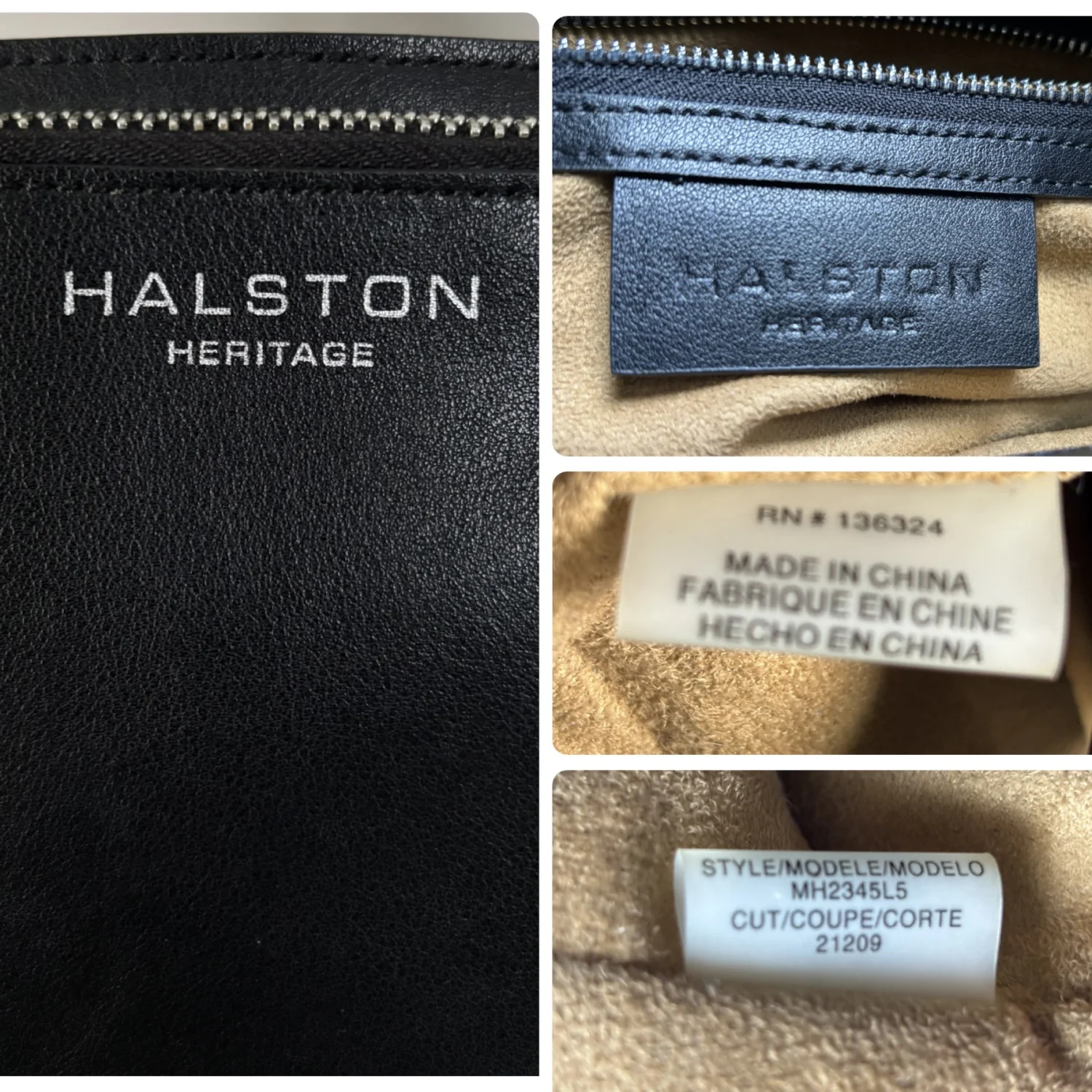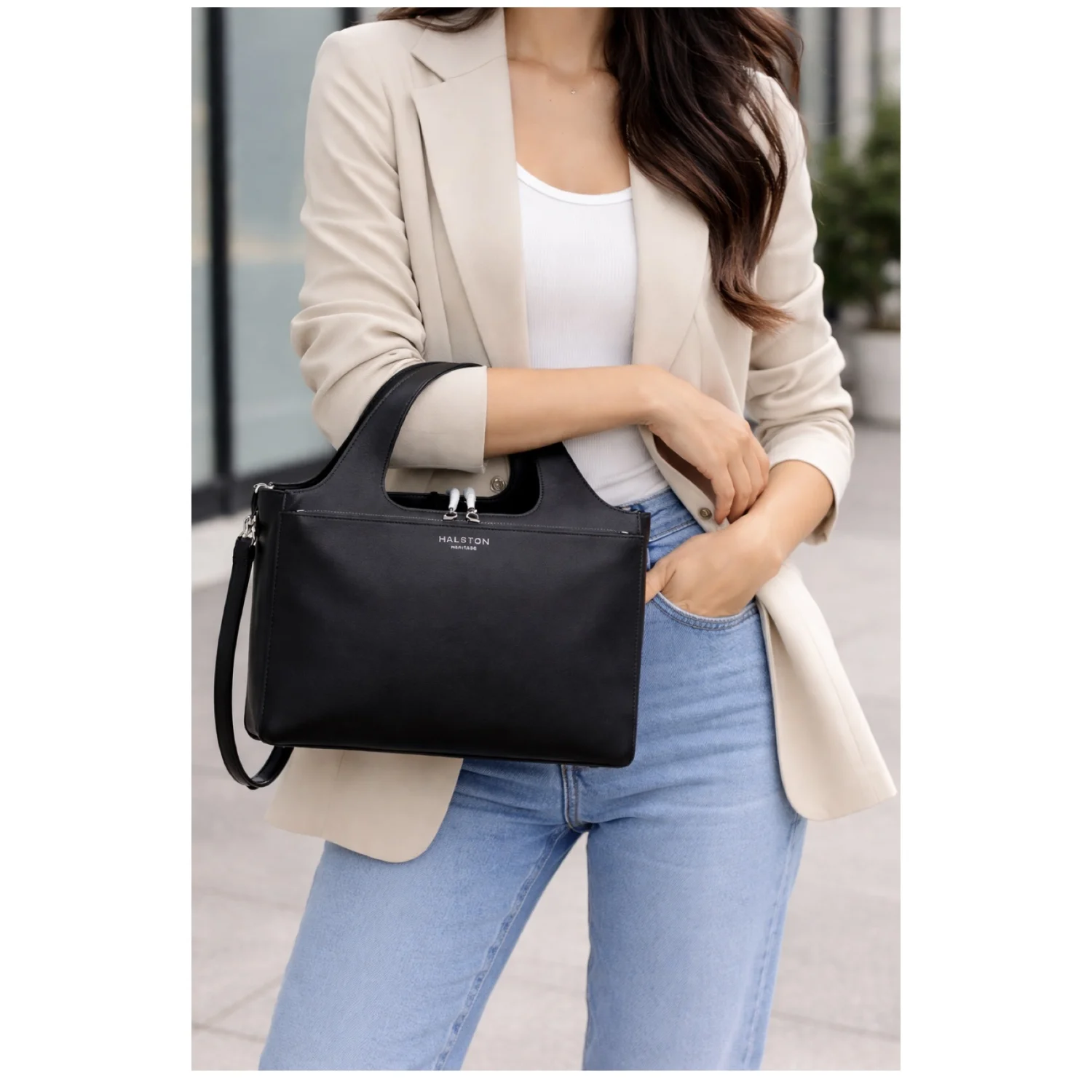 Halston Heritage black leather satchel bag features a structured silhouette with integrated circular top handles and front facing zipper pocket with silver tone logo details Interior lined with suede microfiber fabric 1 zipper pocket and 2 slip pockets Bottom with reinforced tabs Has detachable and removable straps Measure approximately 13.5”W x 8.5”H x 5” W Handle drop 4” Strap up to 24” drop Excellent like new condition