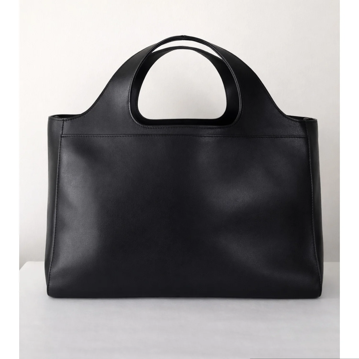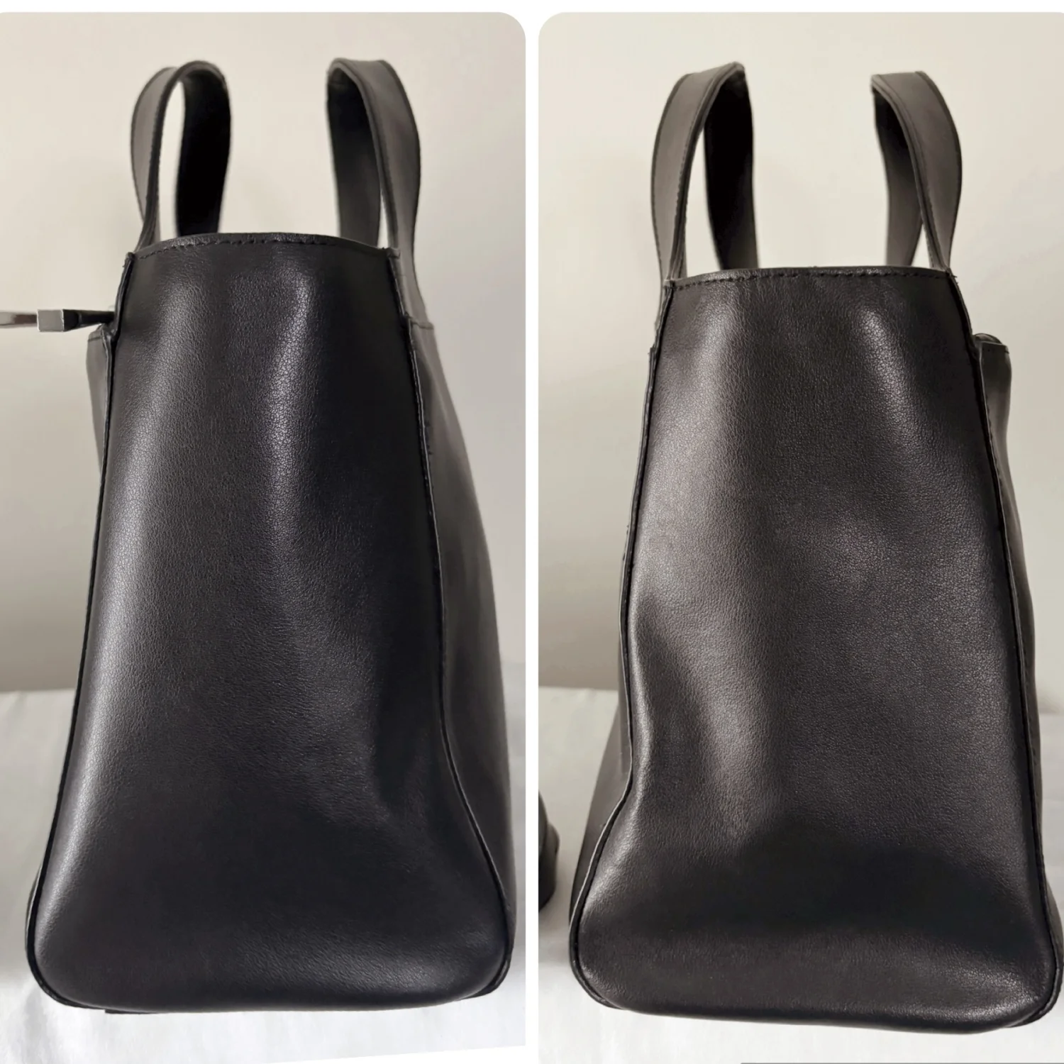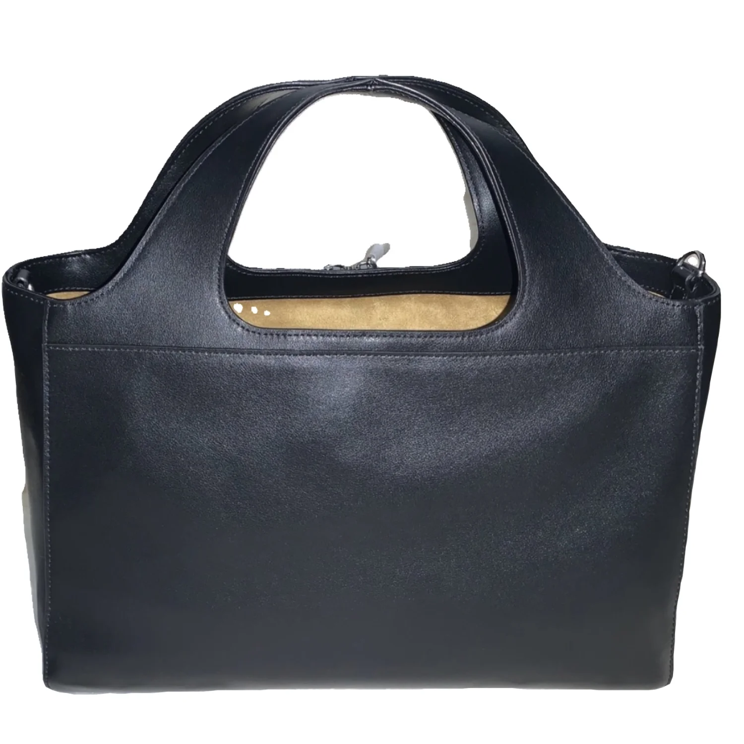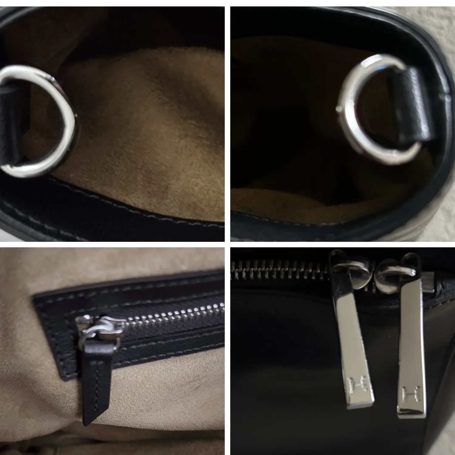 Halston Heritage black leather satchel bag features a structured silhouette with integrated circular top handles and front facing zipper pocket with silver tone logo details Interior lined with suede microfiber fabric 1 zipper pocket and 2 slip pockets Bottom with reinforced tabs Has detachable and removable straps Measure approximately 13.5”W x 8.5”H x 5” W Handle drop 4” Strap up to 24” drop Excellent like new condition