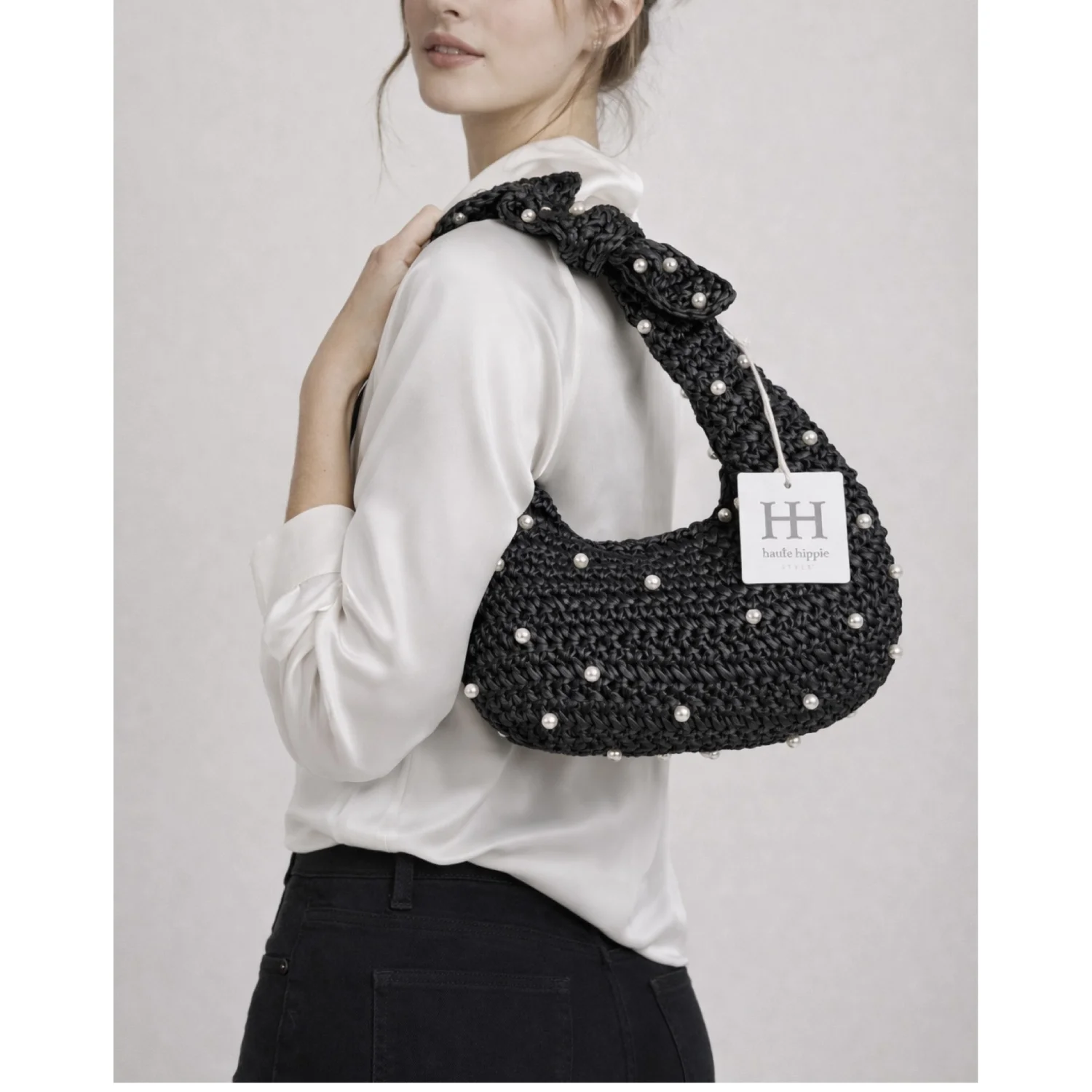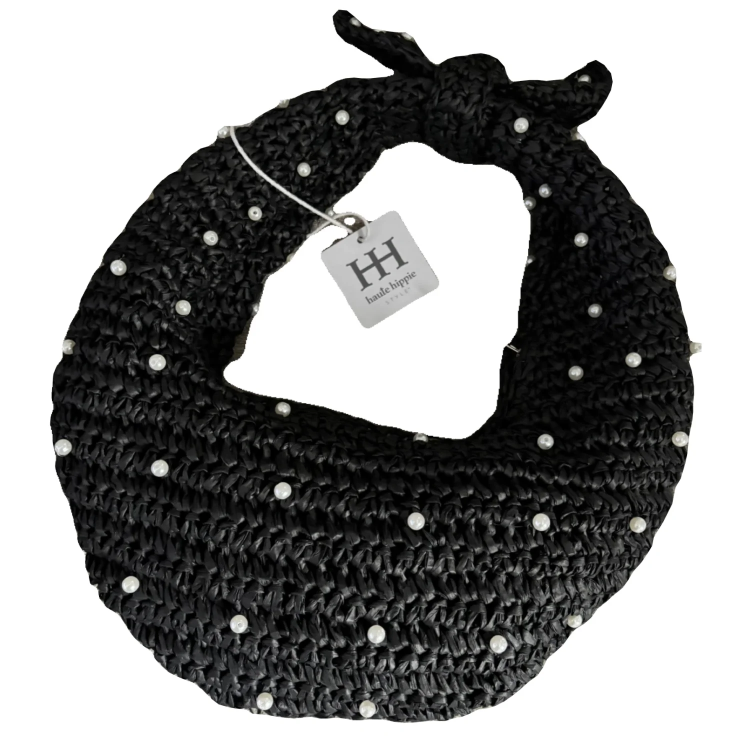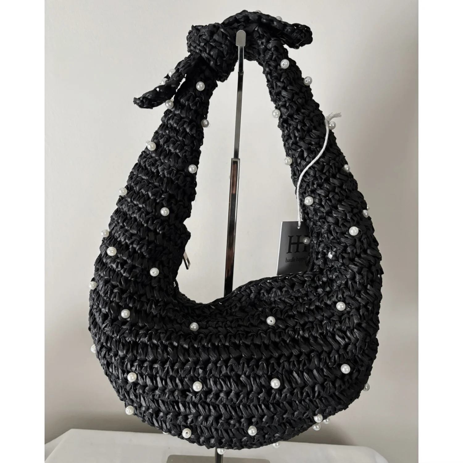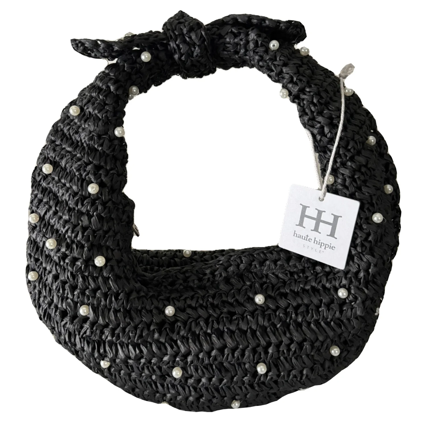 Haute Hippie black raffia crescent shaped hobo style shoulder/handbag Crafted with a meticulous woven design and all over pearl embellishments and a knotted top handle accent Has zipper closure at top, fabric lined interior with 1 zipper pocket Measure approximately 13”W x 8”H x 2”W Strap drop 8” New with tag