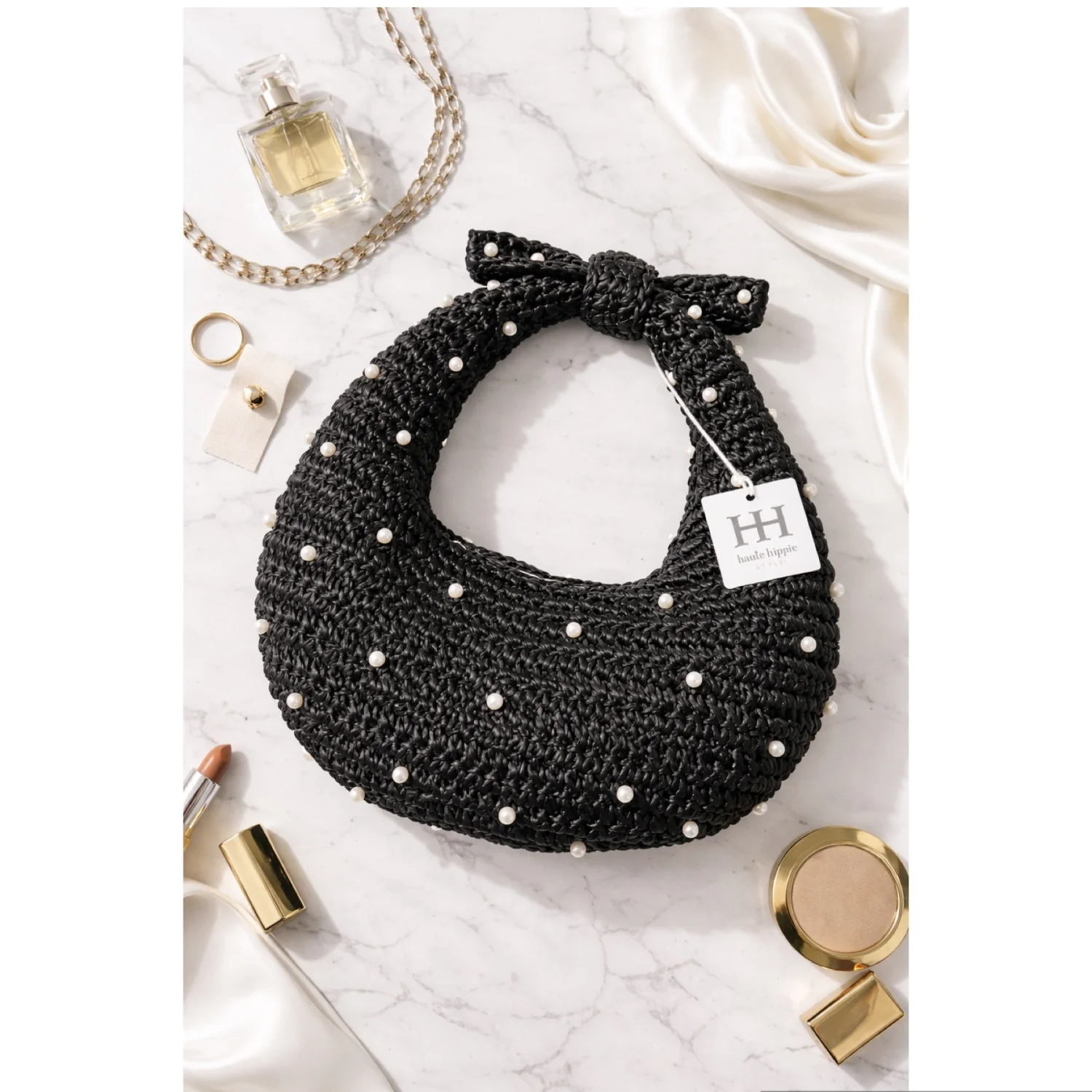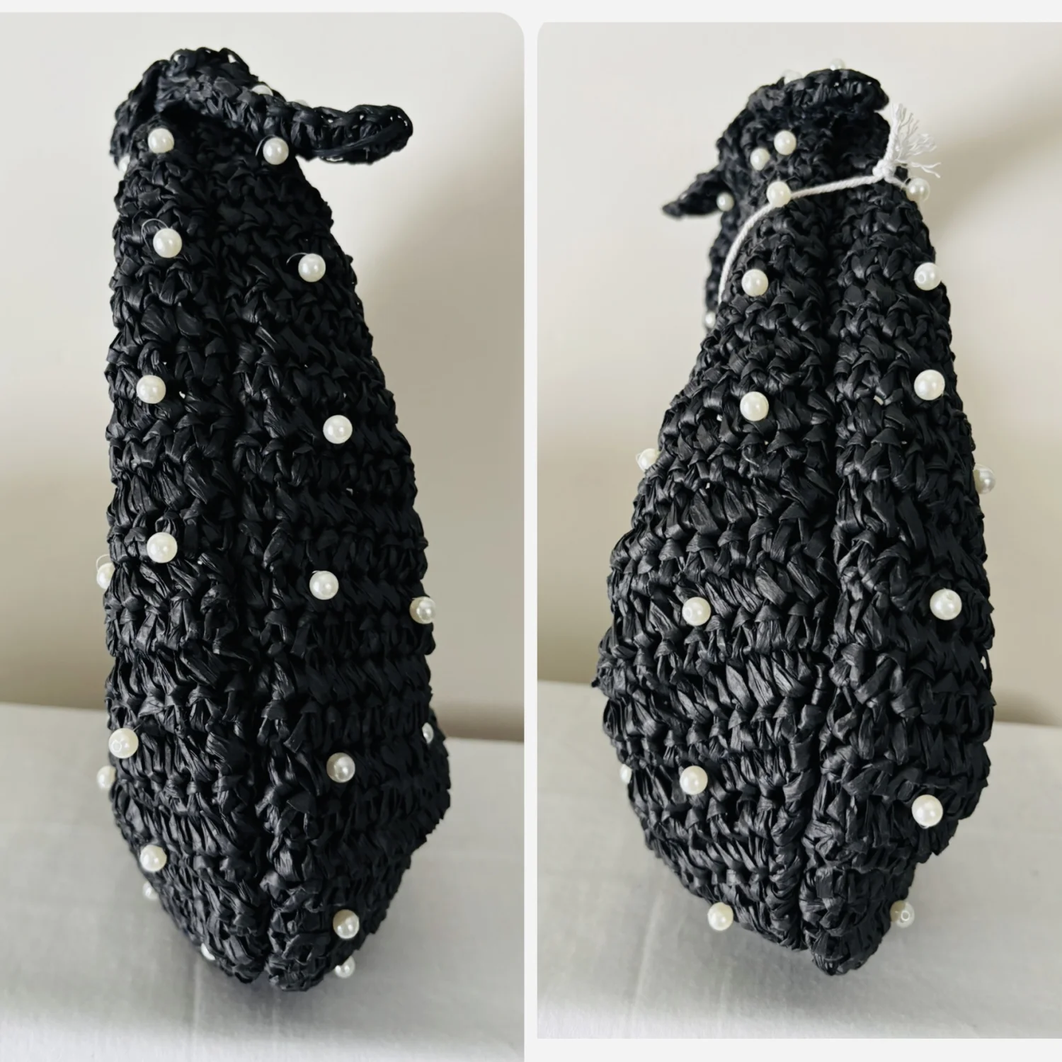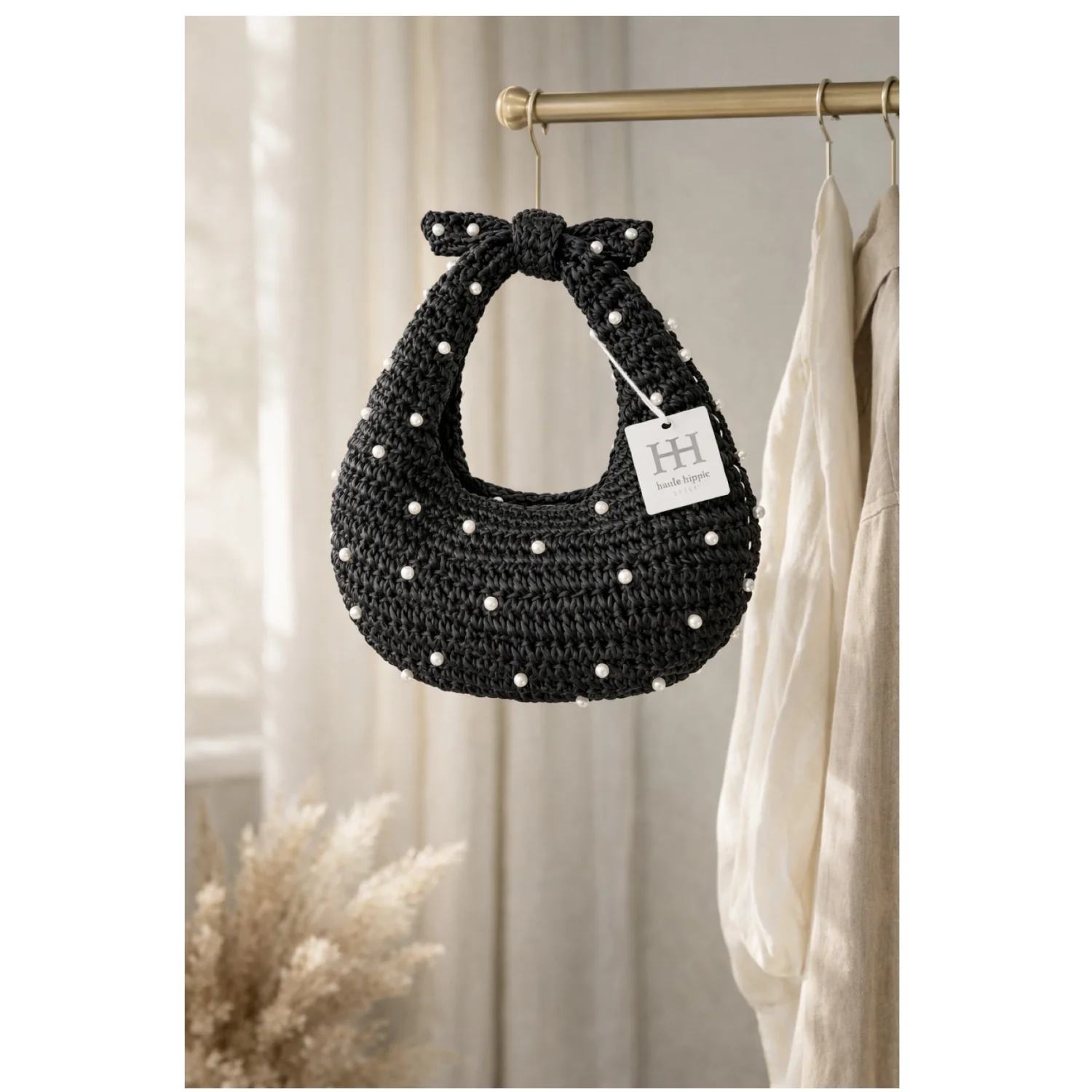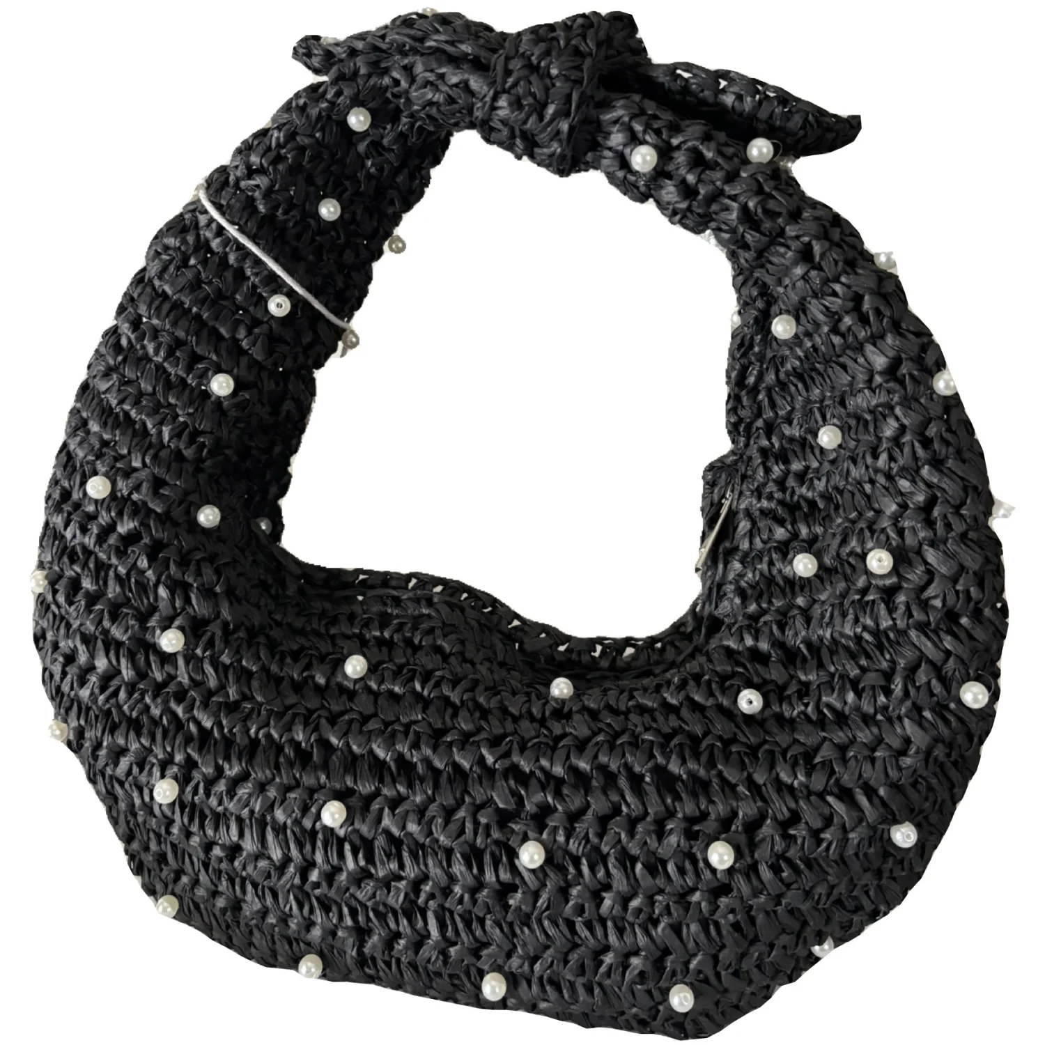 Haute Hippie black raffia crescent shaped hobo style shoulder/handbag Crafted with a meticulous woven design and all over pearl embellishments and a knotted top handle accent Has zipper closure at top, fabric lined interior with 1 zipper pocket Measure approximately 13”W x 8”H x 2”W Strap drop 8” New with tag