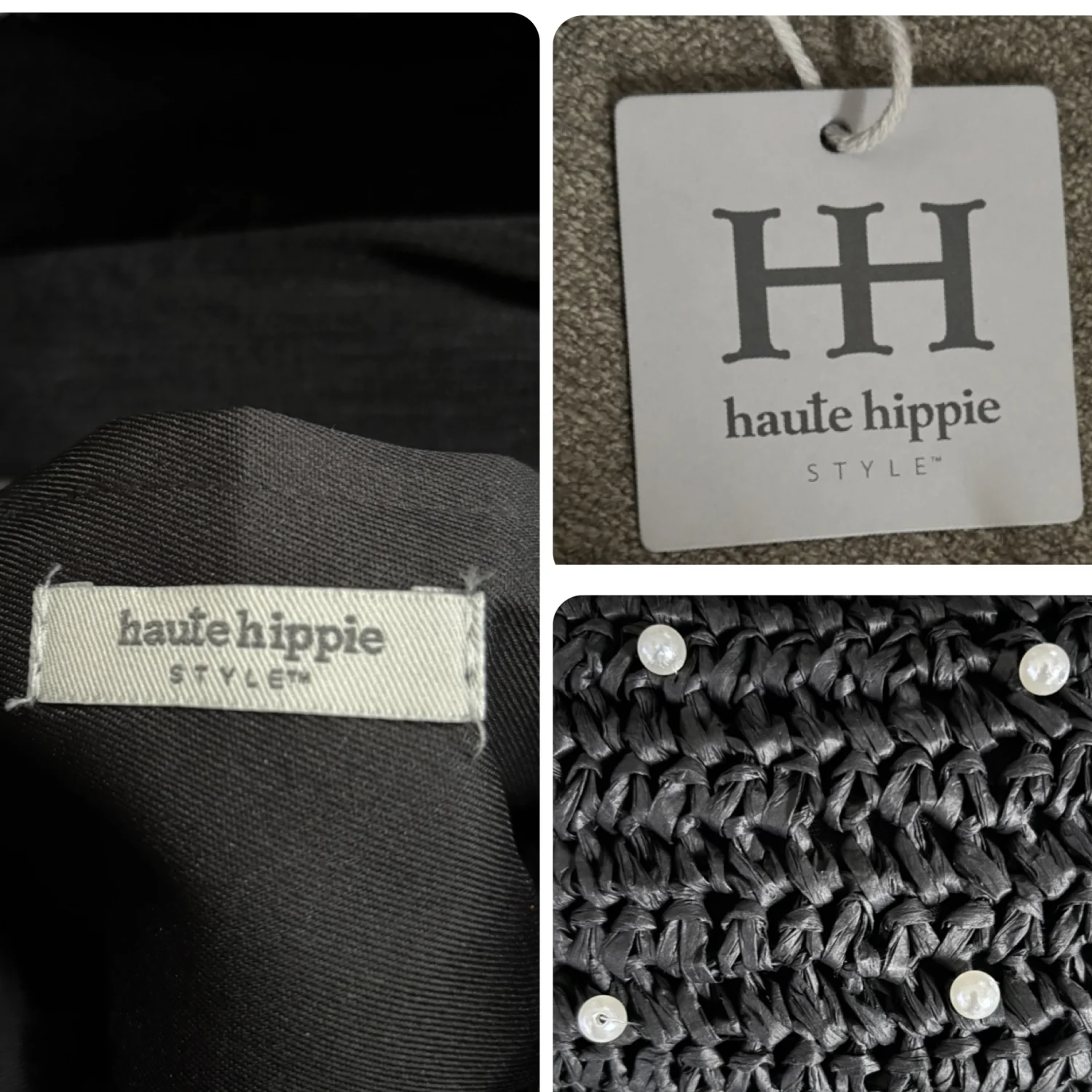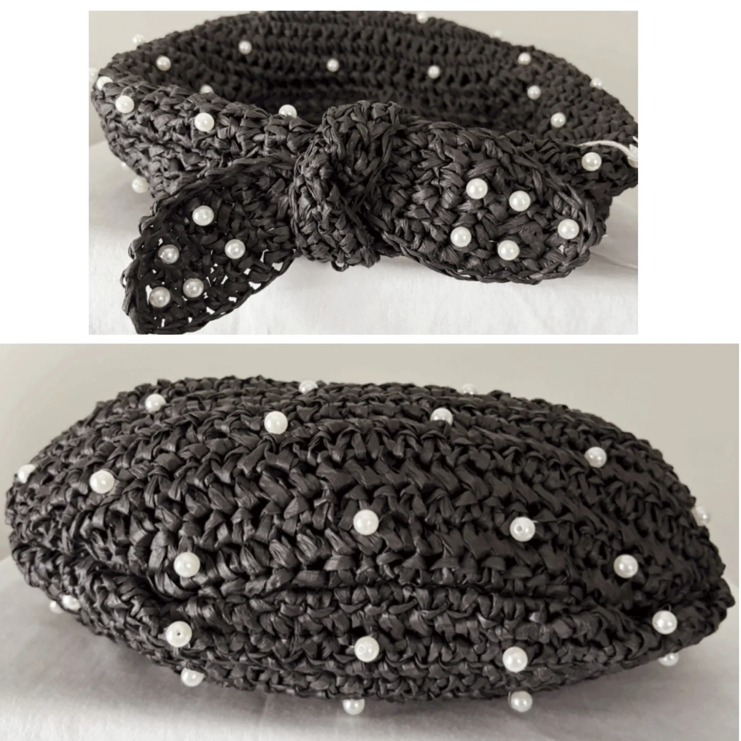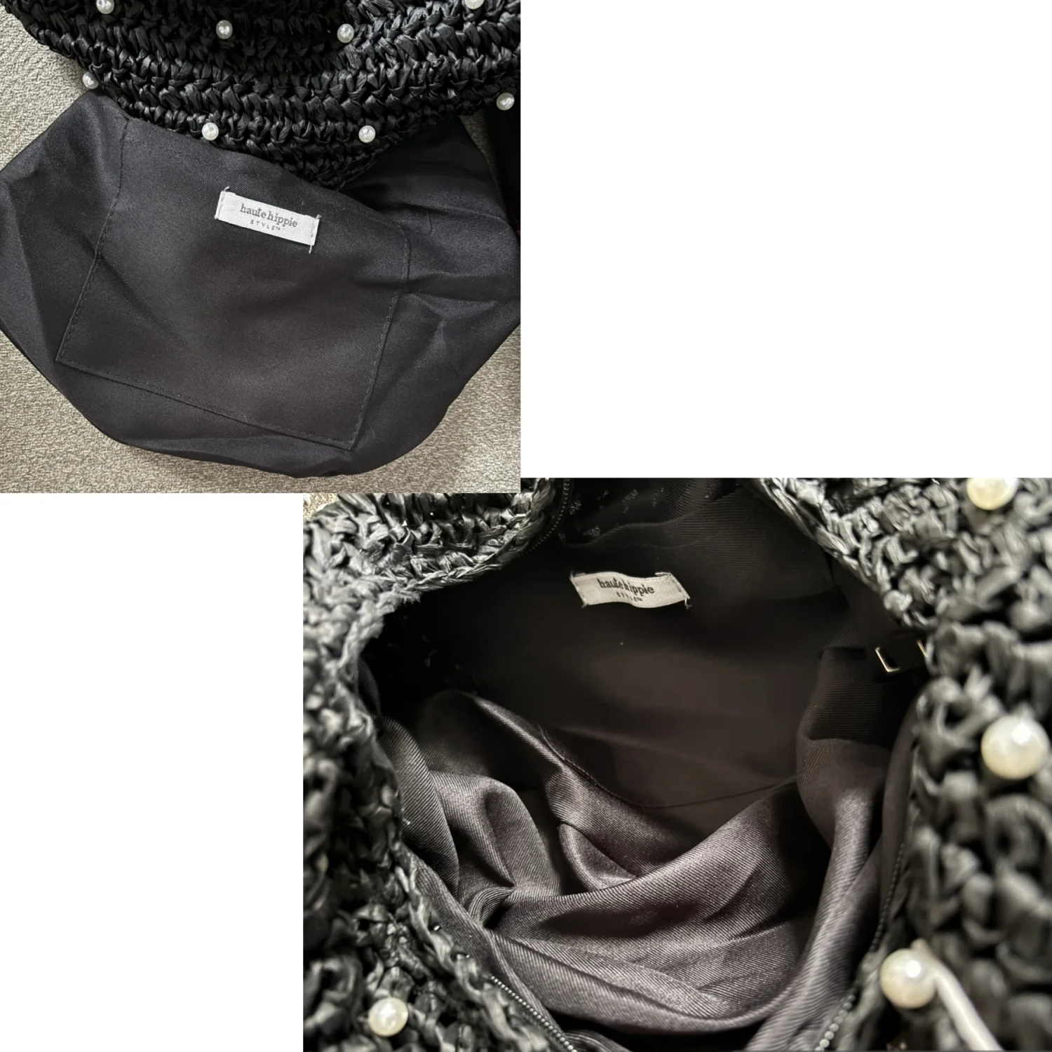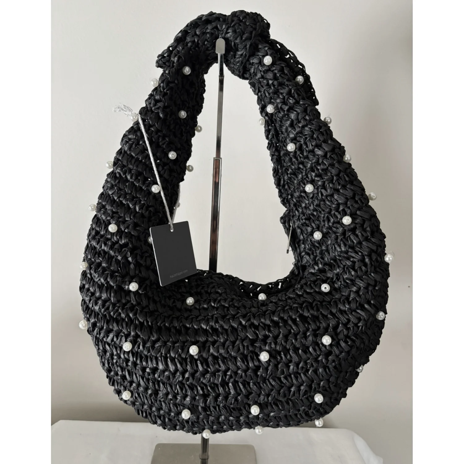 Haute Hippie black raffia crescent shaped hobo style shoulder/handbag Crafted with a meticulous woven design and all over pearl embellishments and a knotted top handle accent Has zipper closure at top, fabric lined interior with 1 zipper pocket Measure approximately 13”W x 8”H x 2”W Strap drop 8” New with tag