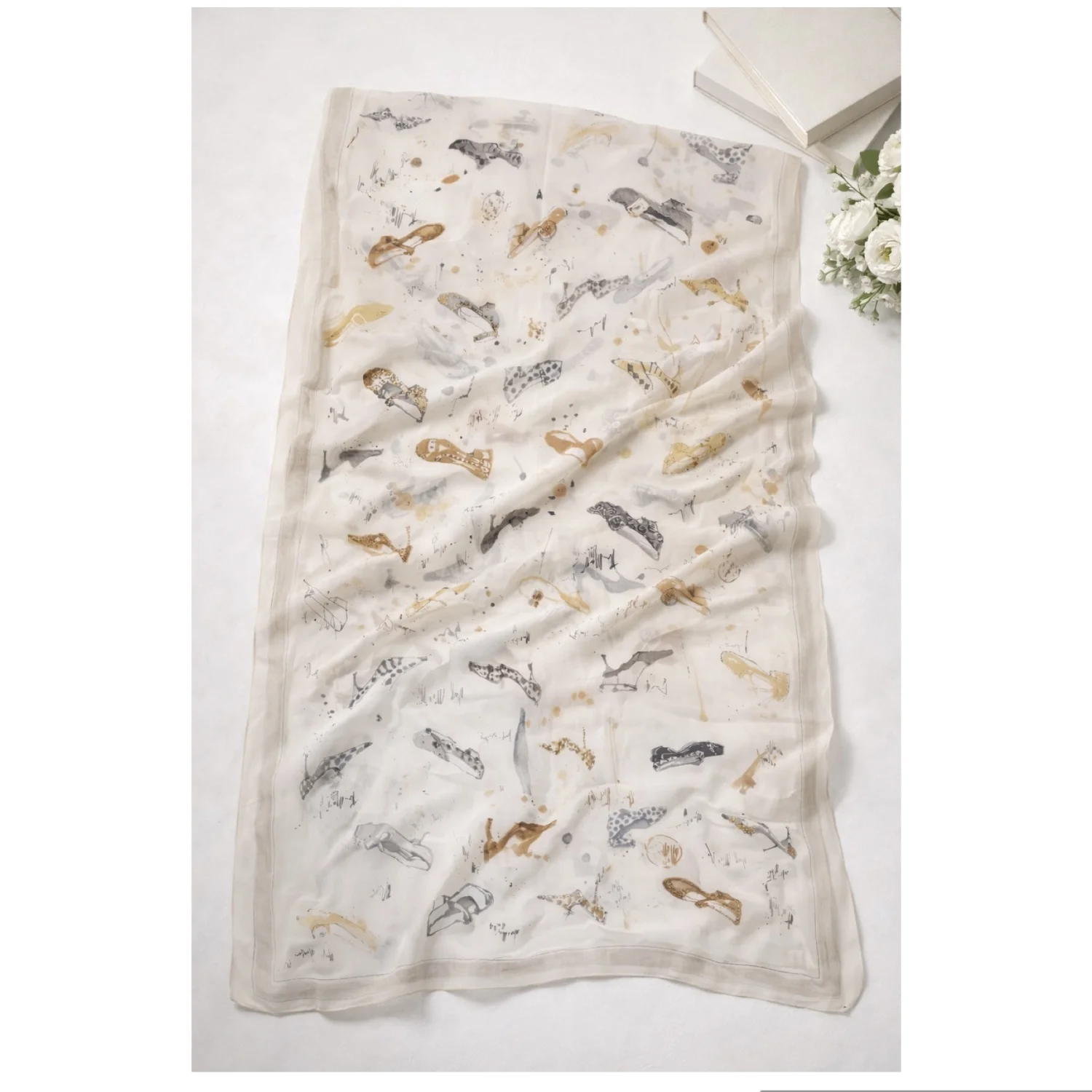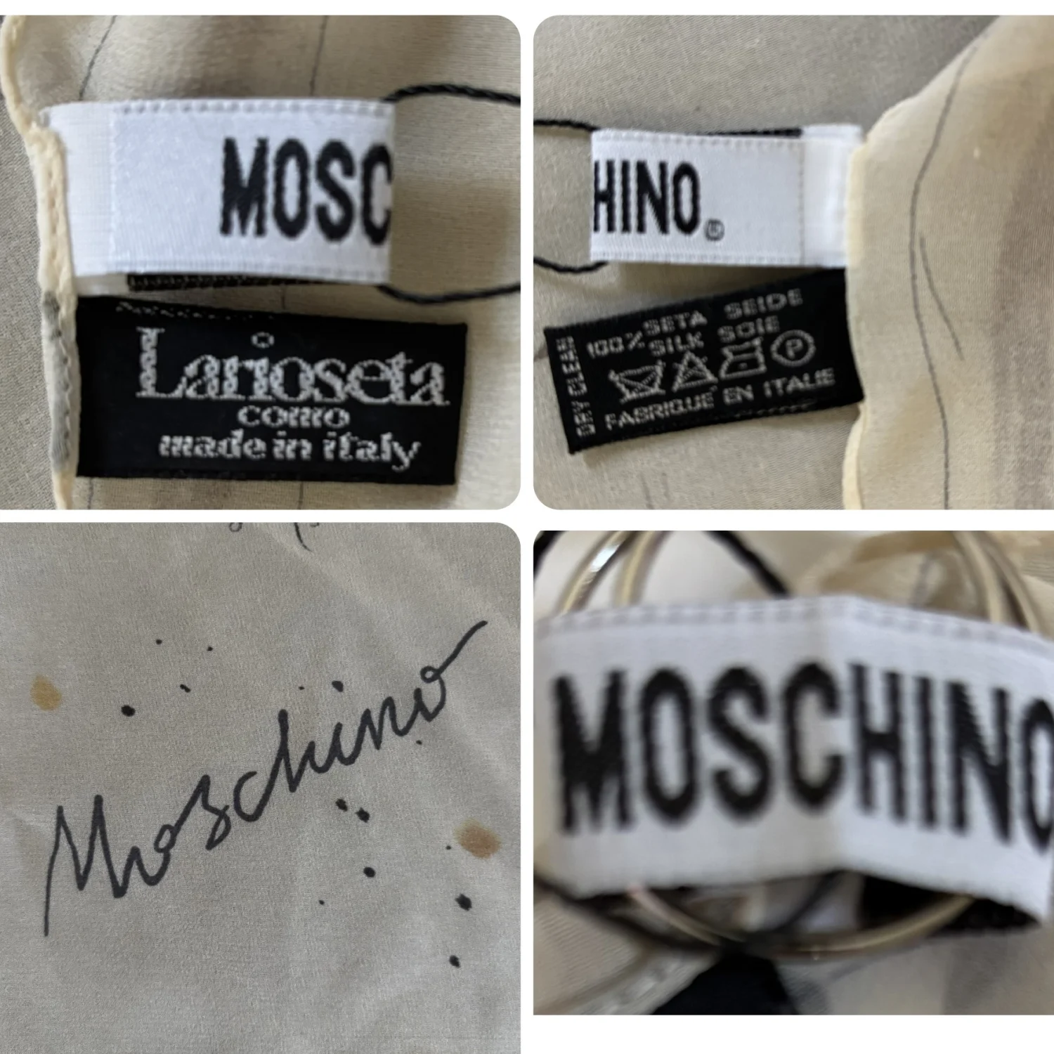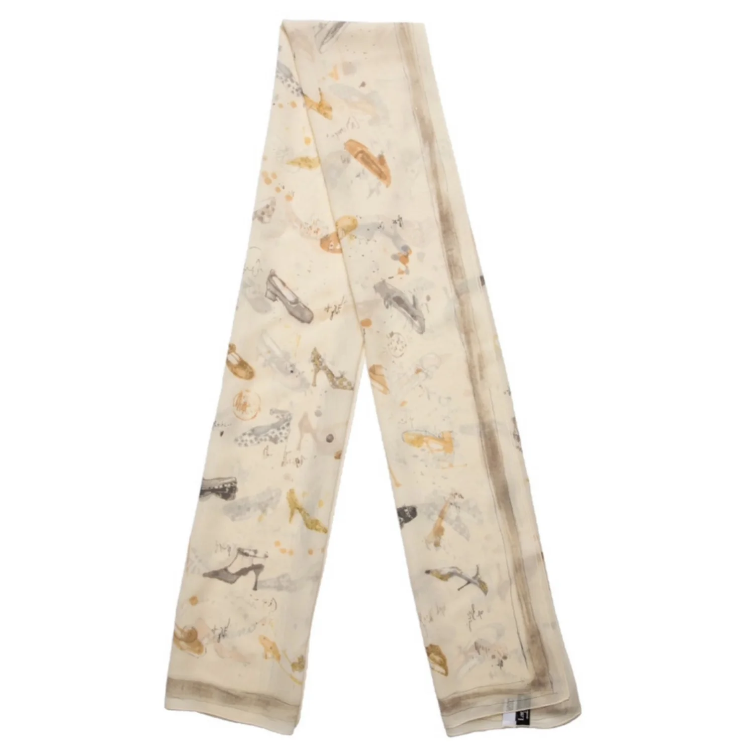 Moschino silk sheer scarf in a soft cream tone Features all over shoes print and black handwritten logo script. Scattered neutral tan spots add character. Lightweight and elegant for styling as a scarf or over the shoulder shawl Measure approximately 56”long X 12” W Excellent condition