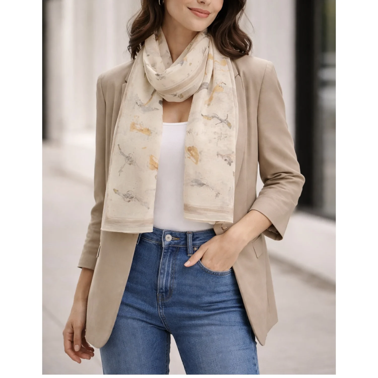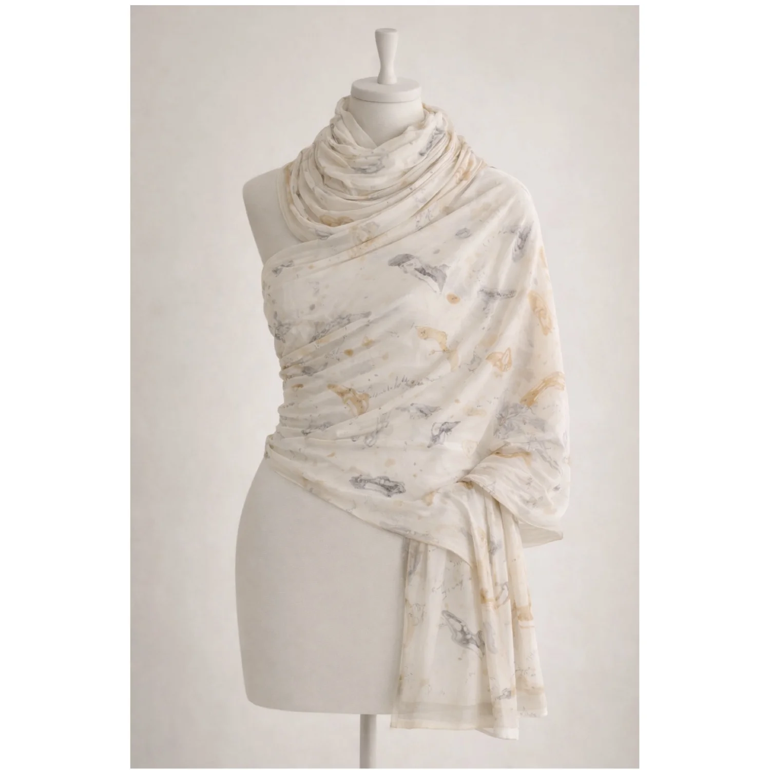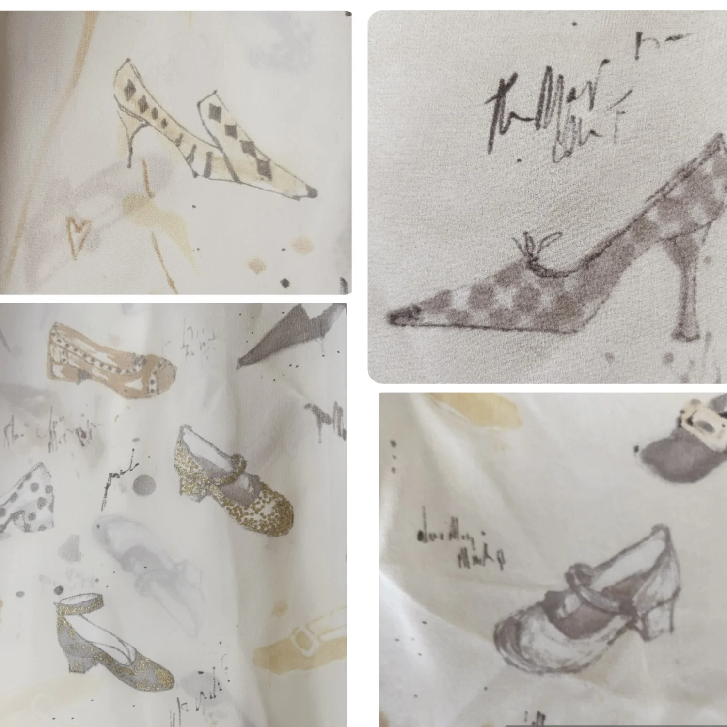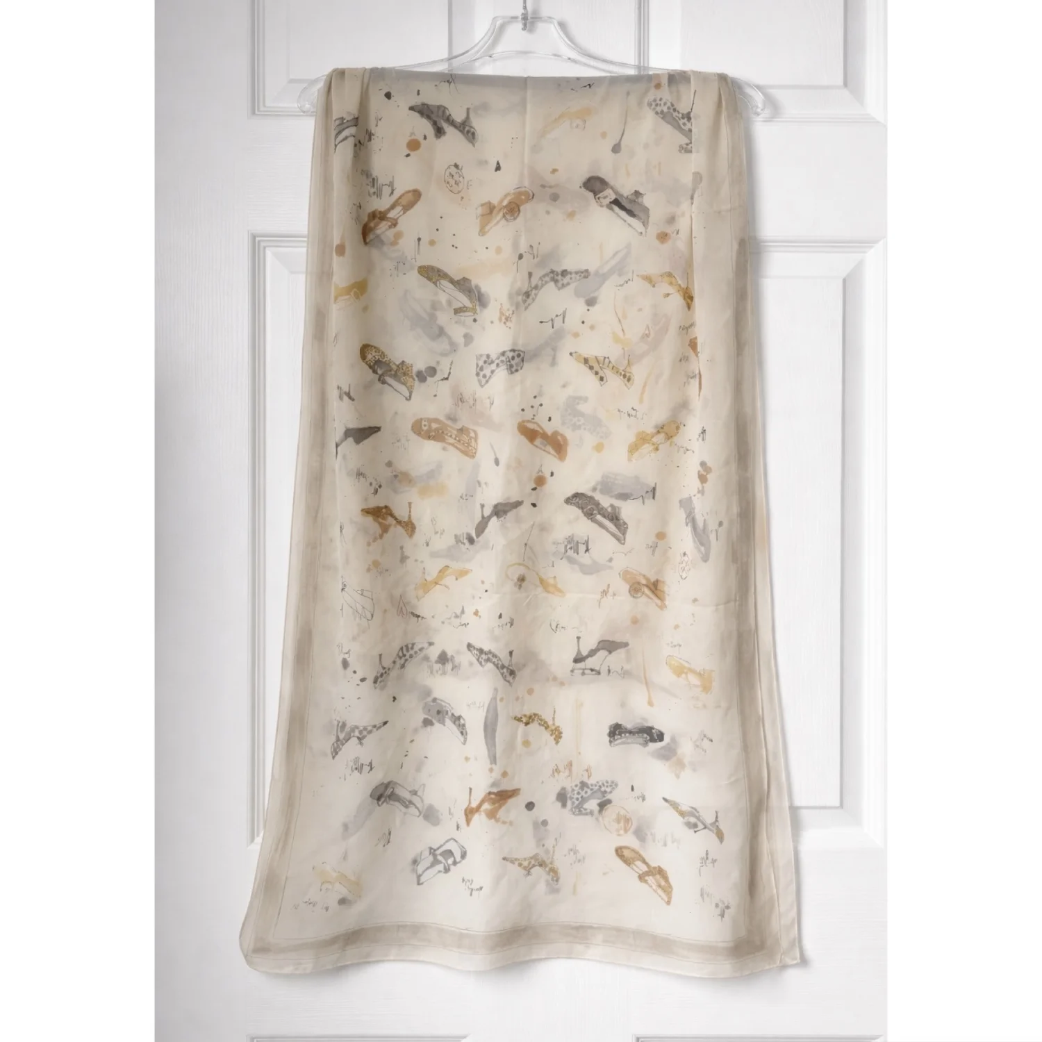 Moschino silk sheer scarf in a soft cream tone Features all over shoes print and black handwritten logo script. Scattered neutral tan spots add character. Lightweight and elegant for styling as a scarf or over the shoulder shawl Measure approximately 56”long X 12” W Excellent condition