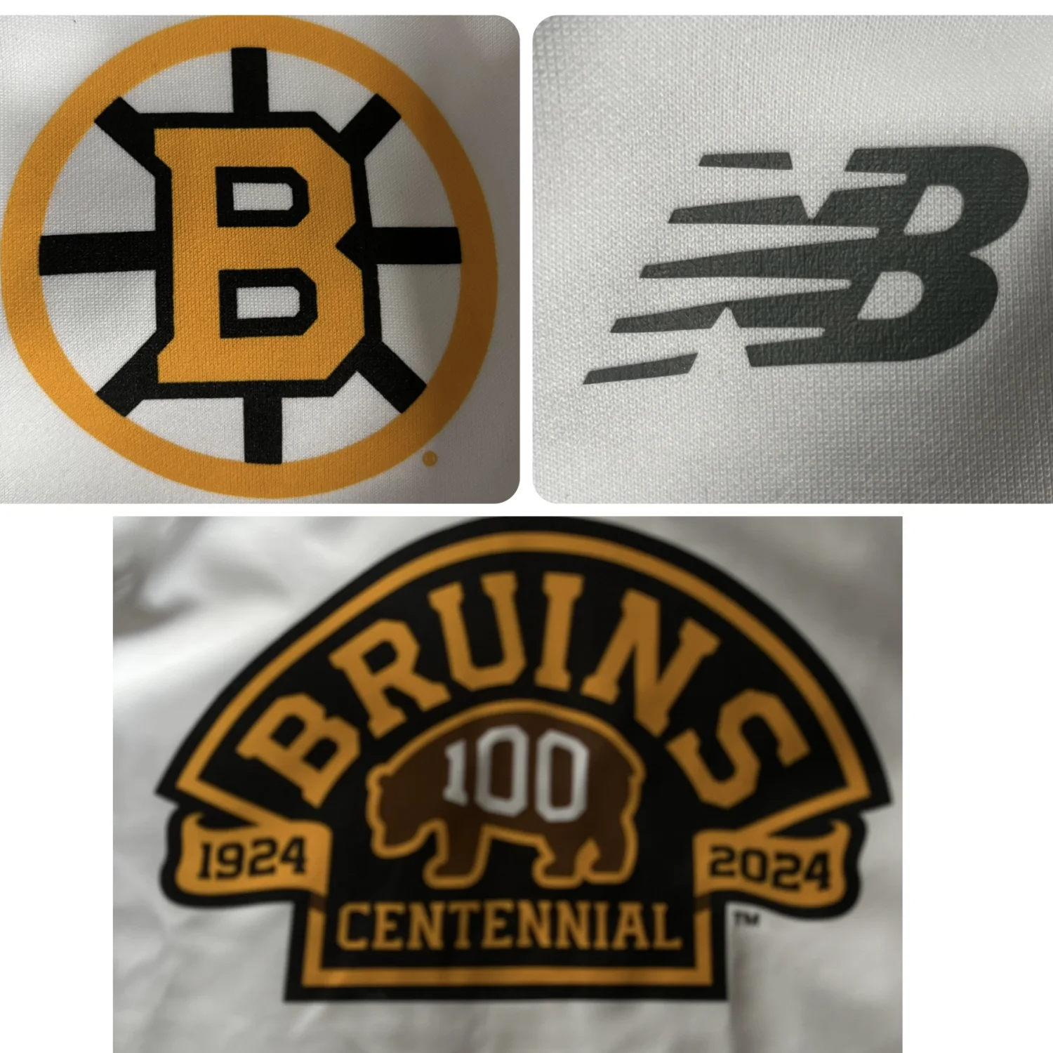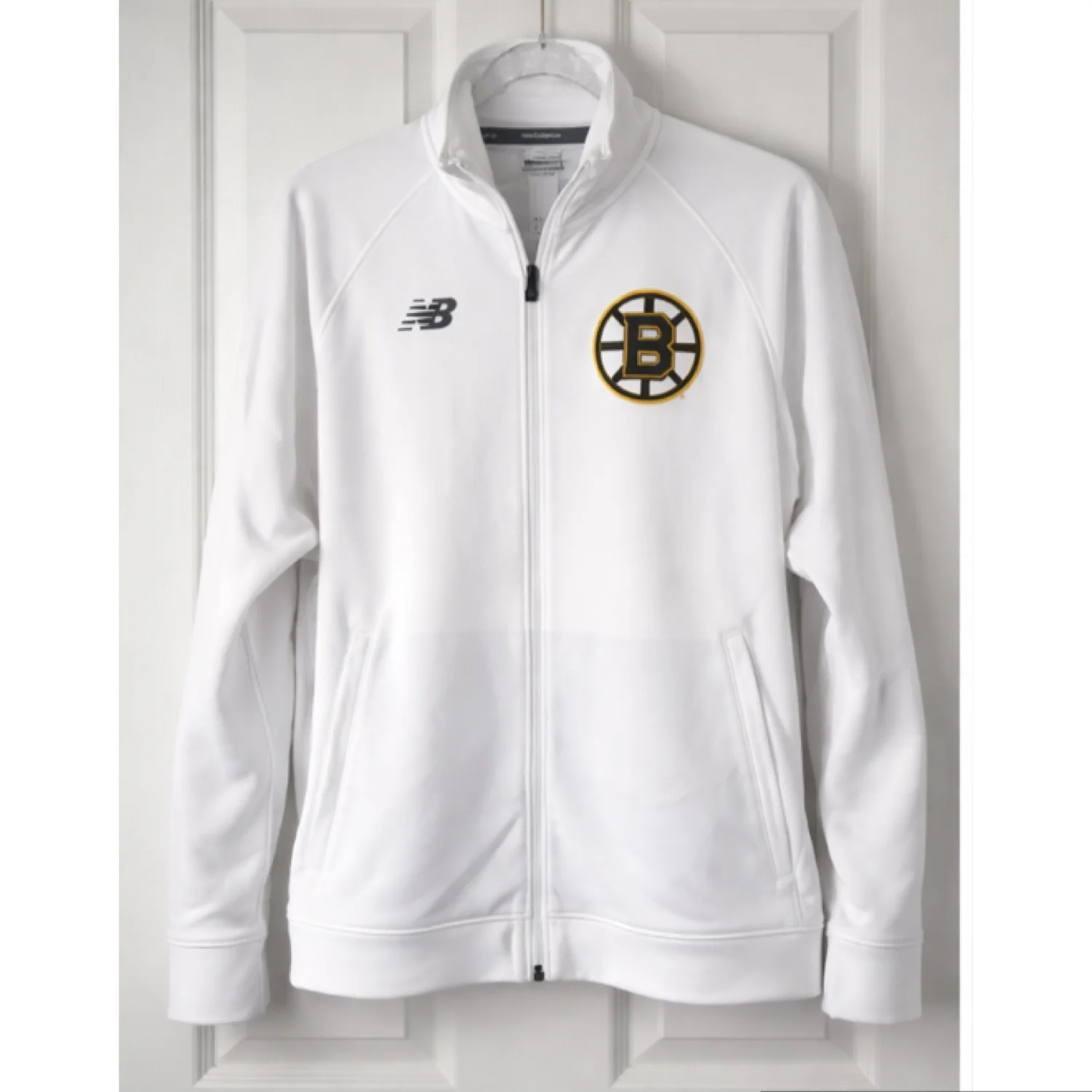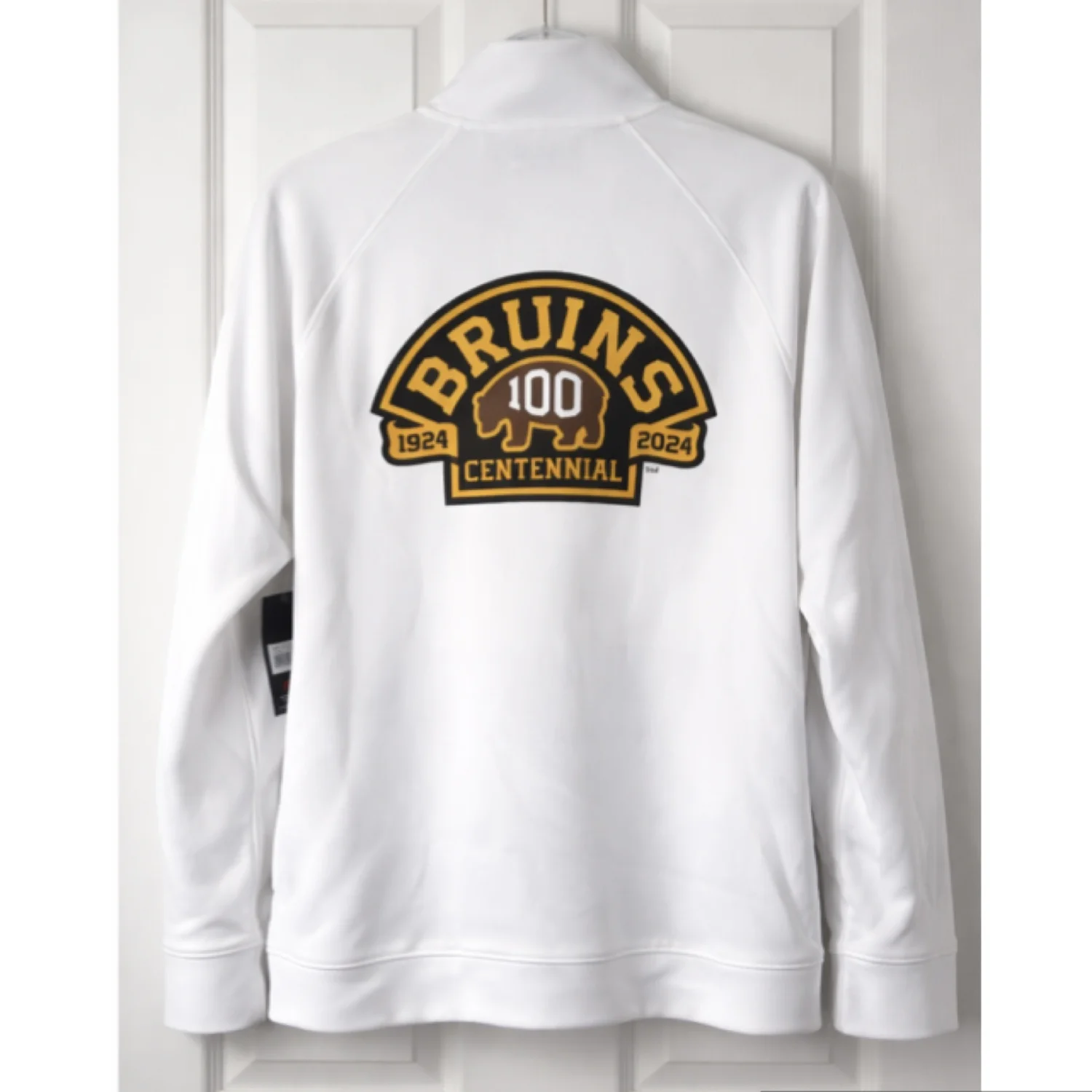 New Balance men’s Limited Edition white zip-up jersey jacket featuring bold Bruins Centennial 100 graphics with gold and black team logo on back and matching chest emblem. Stands up collar and side pockets Moisture wicking Made of cotton & poly blend Sporty fan style with prominent branding. Size L Measure approximately 29” length 23” pit to pit/ 28” sleeve New with tag
