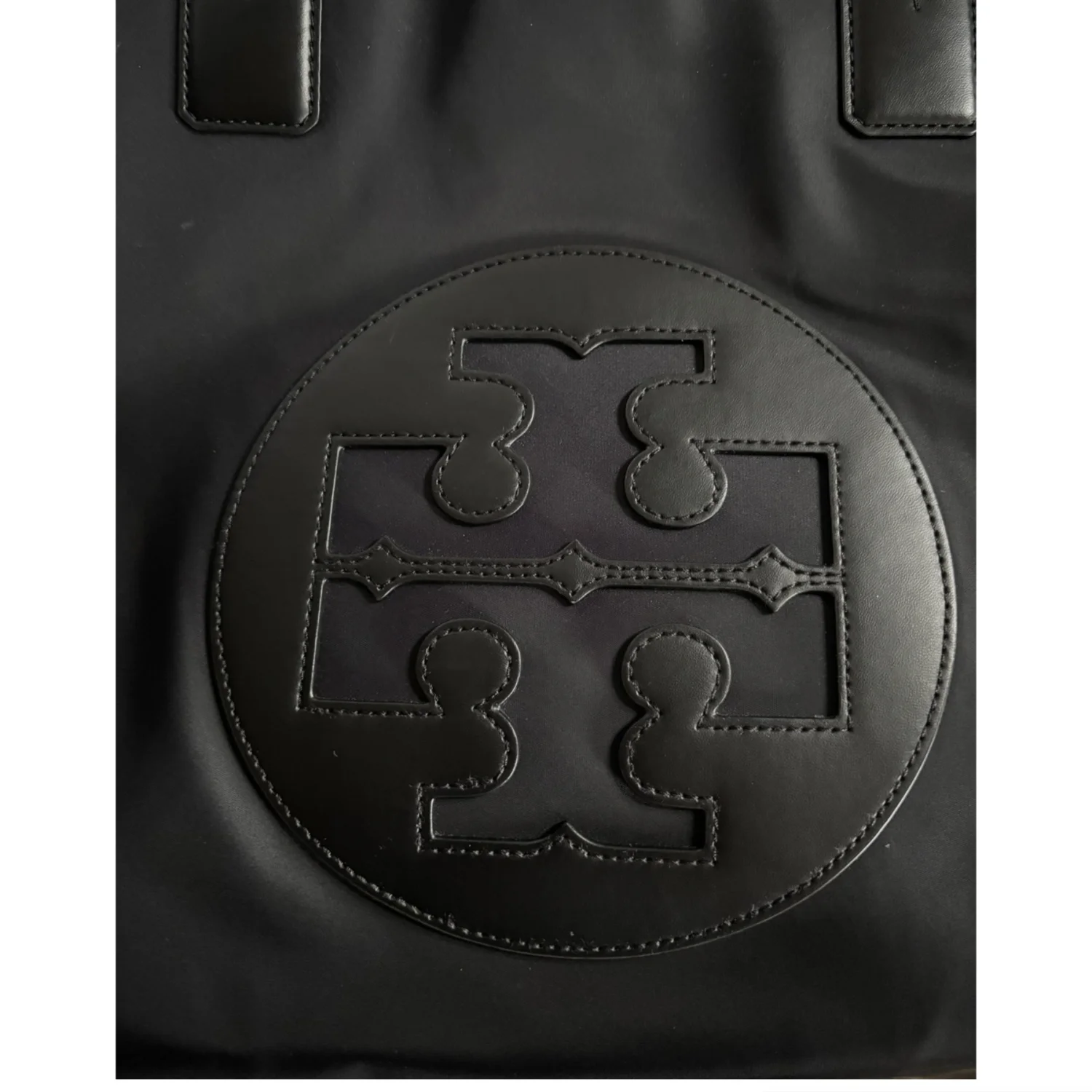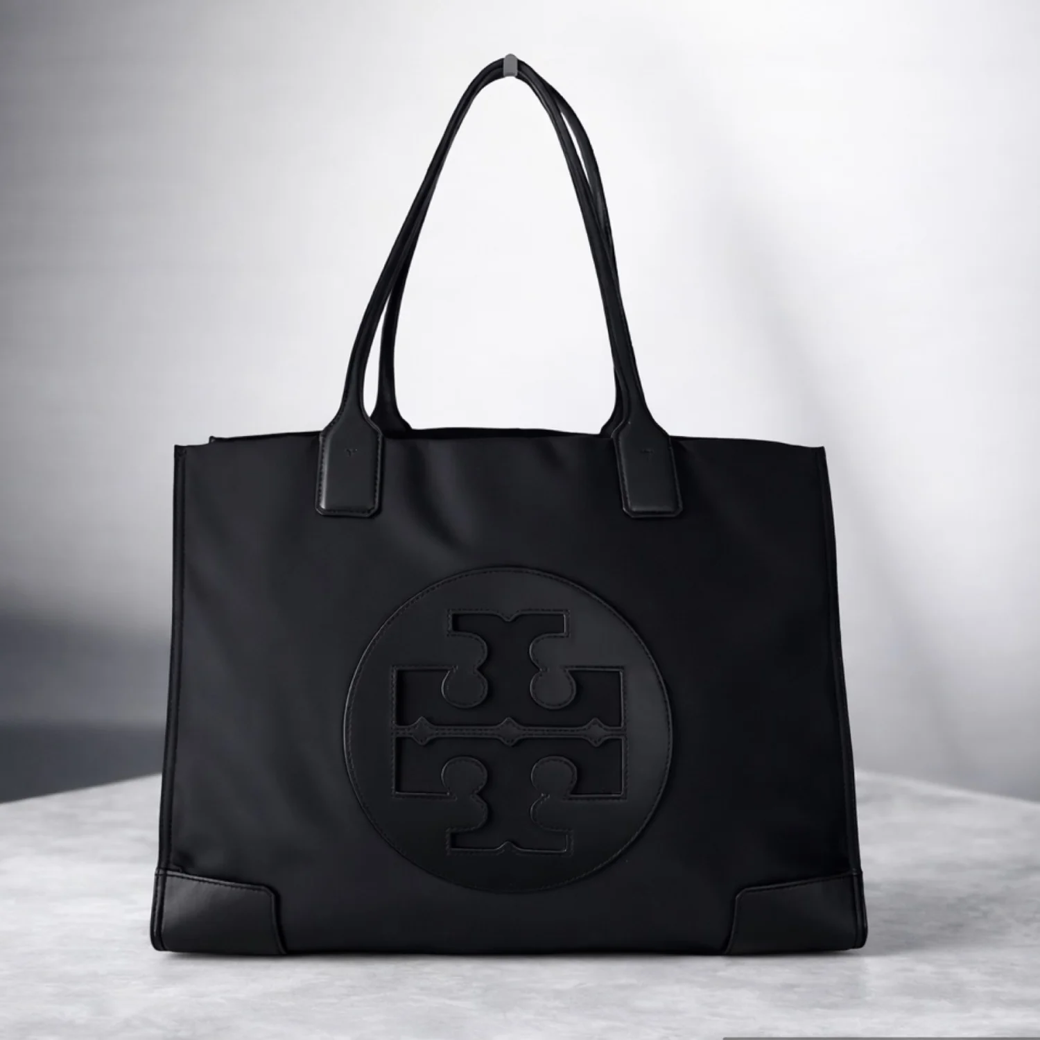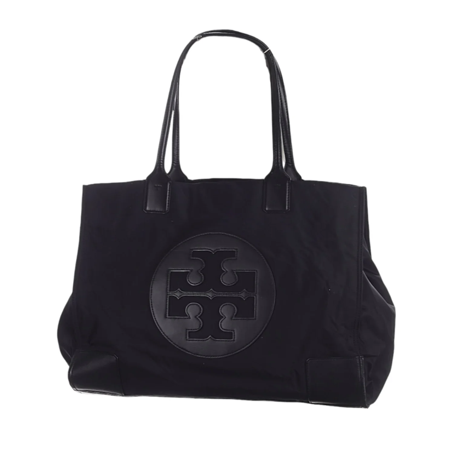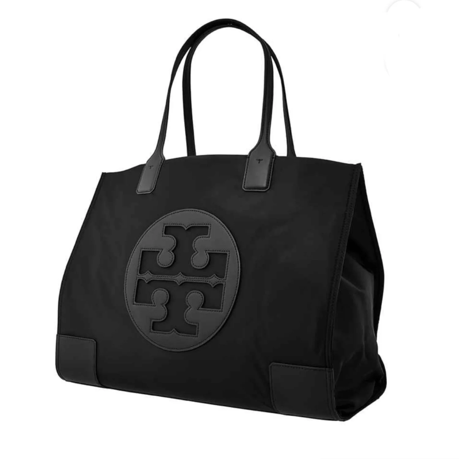 Tory Burch Ella black large tote made of nylon and leather, features a classic silhouette with a centered stacked T-logo medallion and double handles Has sides gusset snaps to expand bag width and top magnetic closure Spacious interior lined with cotton logo jacquard fabric, has 1 zipper and 1 slip pocket Gold tone hardware Measure approximately 17”W x 12”H x 6”D Handles drop 9” Very good condition