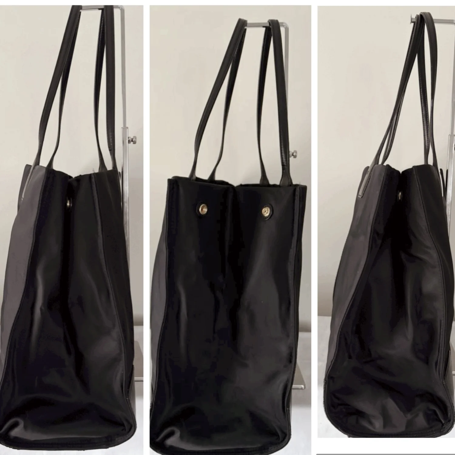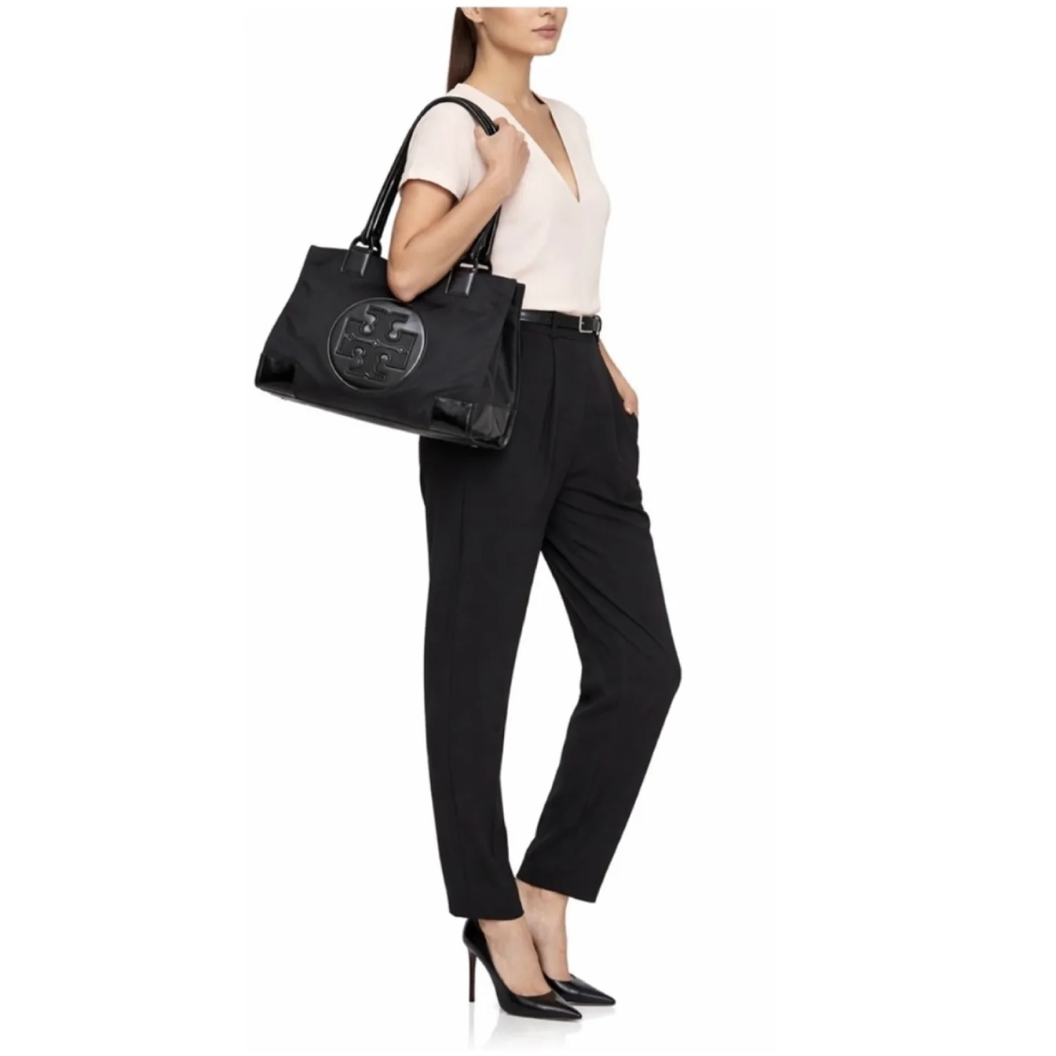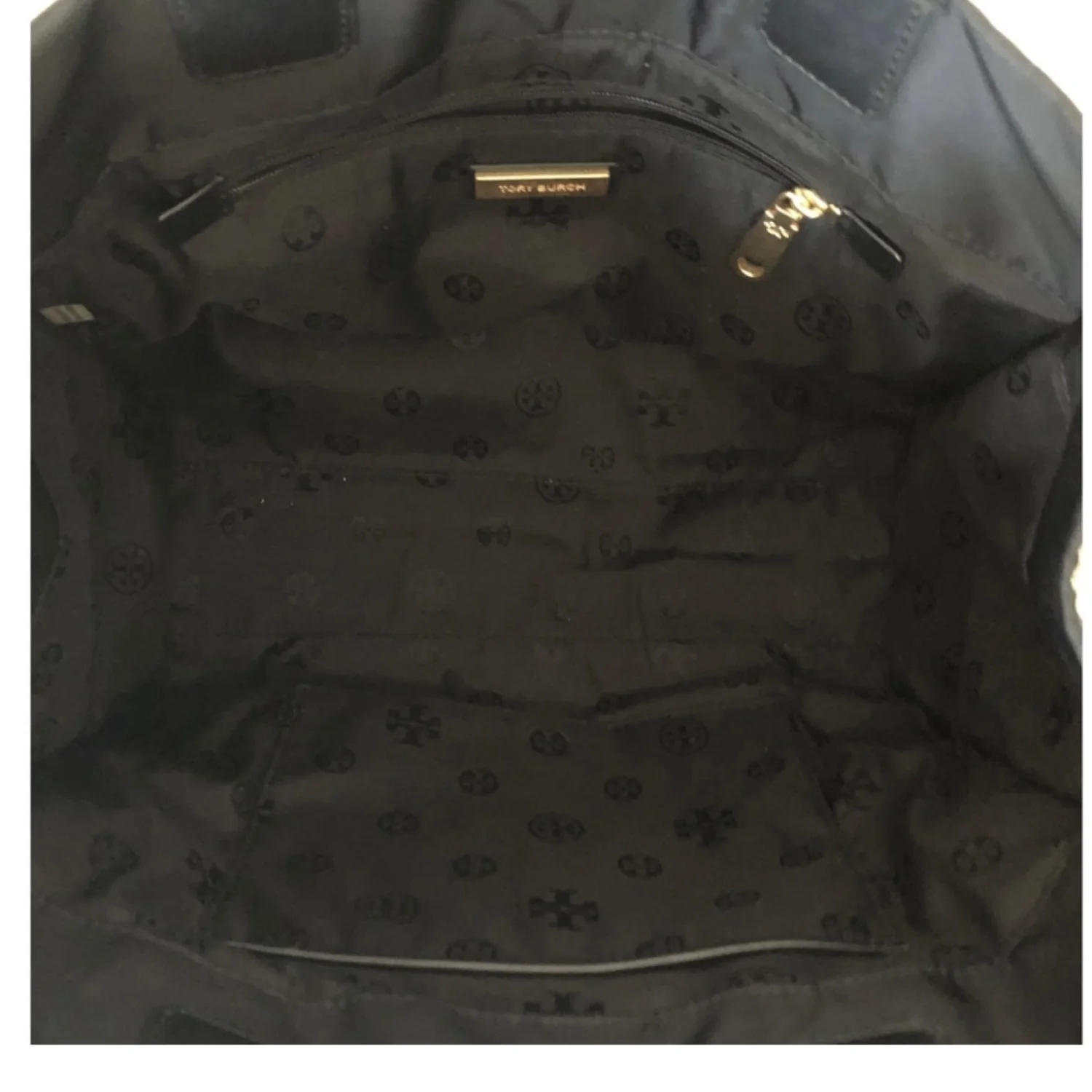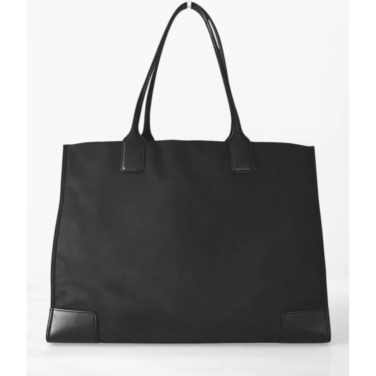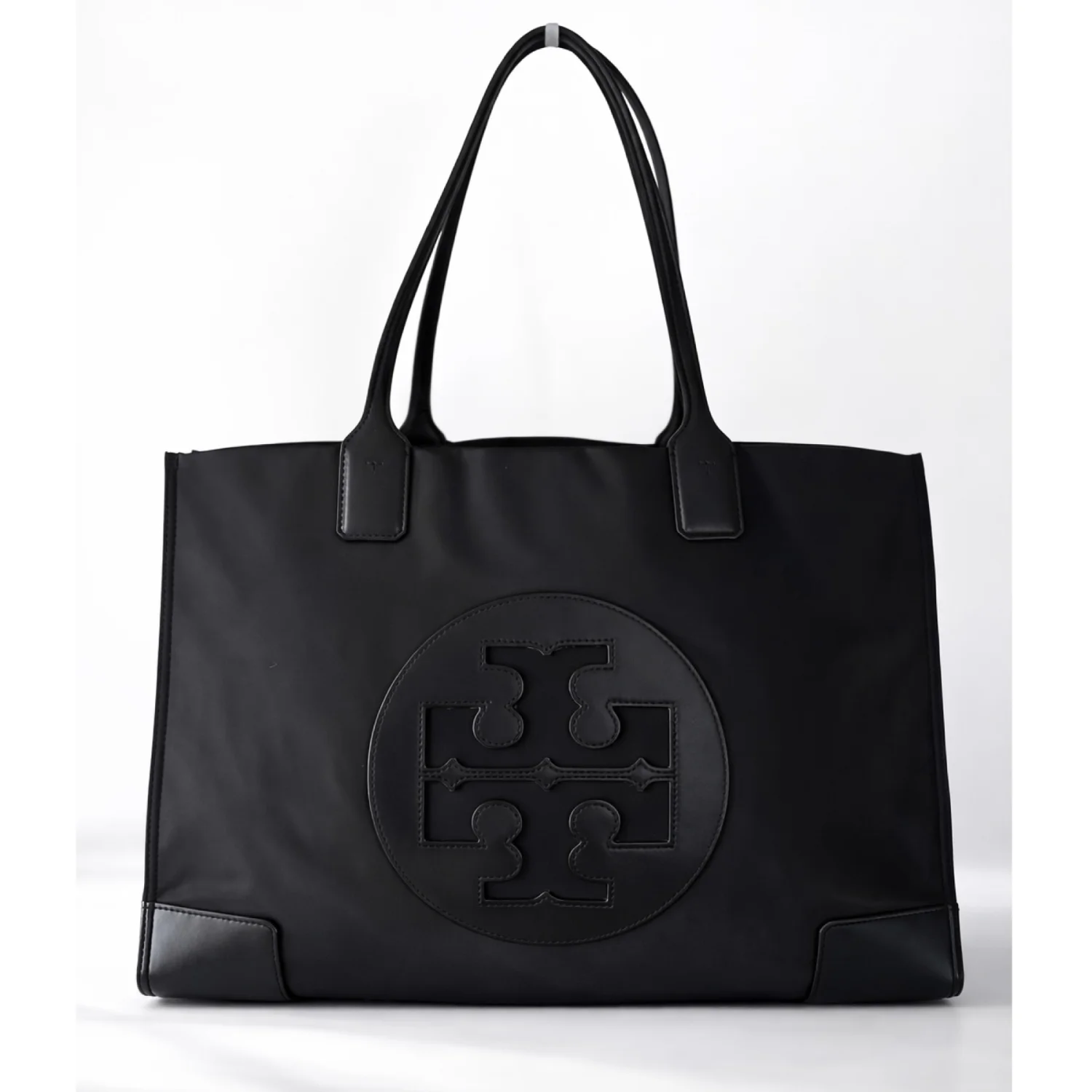 Tory Burch Ella black large tote made of nylon and leather, features a classic silhouette with a centered stacked T-logo medallion and double handles Has sides gusset snaps to expand bag width and top magnetic closure Spacious interior lined with cotton logo jacquard fabric, has 1 zipper and 1 slip pocket Gold tone hardware Measure approximately 17”W x 12”H x 6”D Handles drop 9” Very good condition