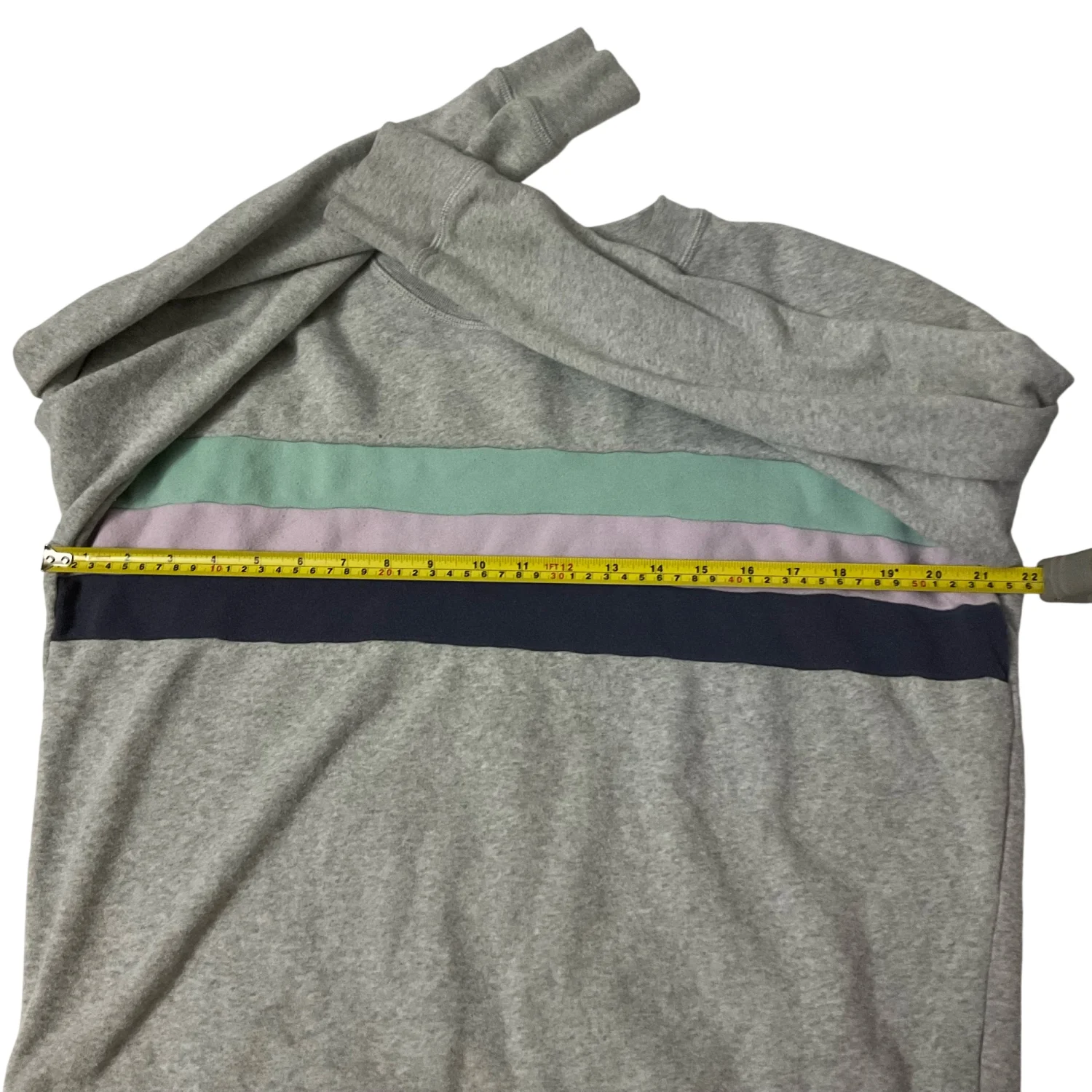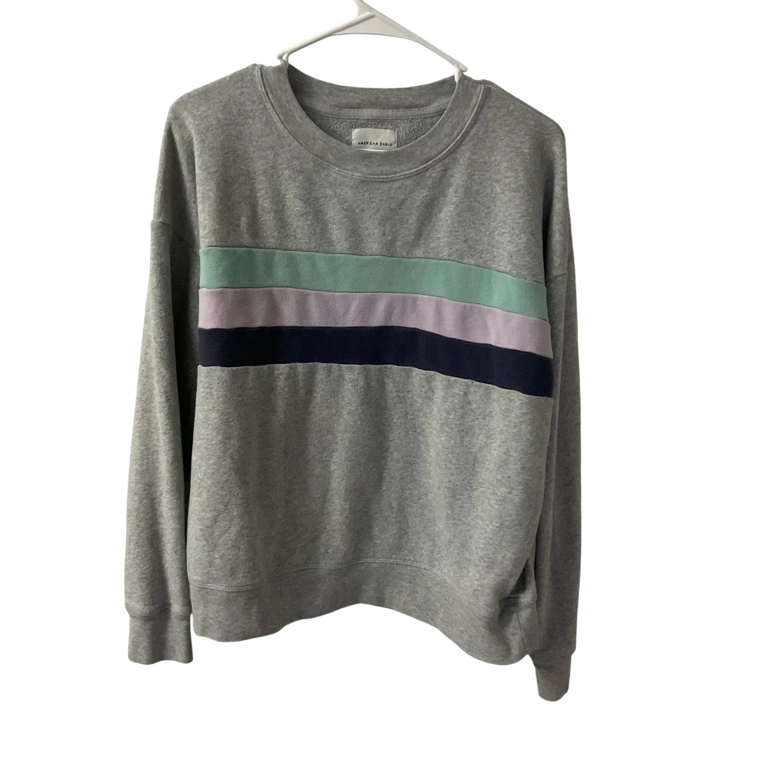 Style: Long sleeve crewneck sweatshirt with colorblock stripes Color: Gray/Multi Size: M Armpit: 21" Length: 22" Sleeves: 19" Condition: Good, has small stain on sleeve as pictured 60% Cotton 40% Polyester Machine wash