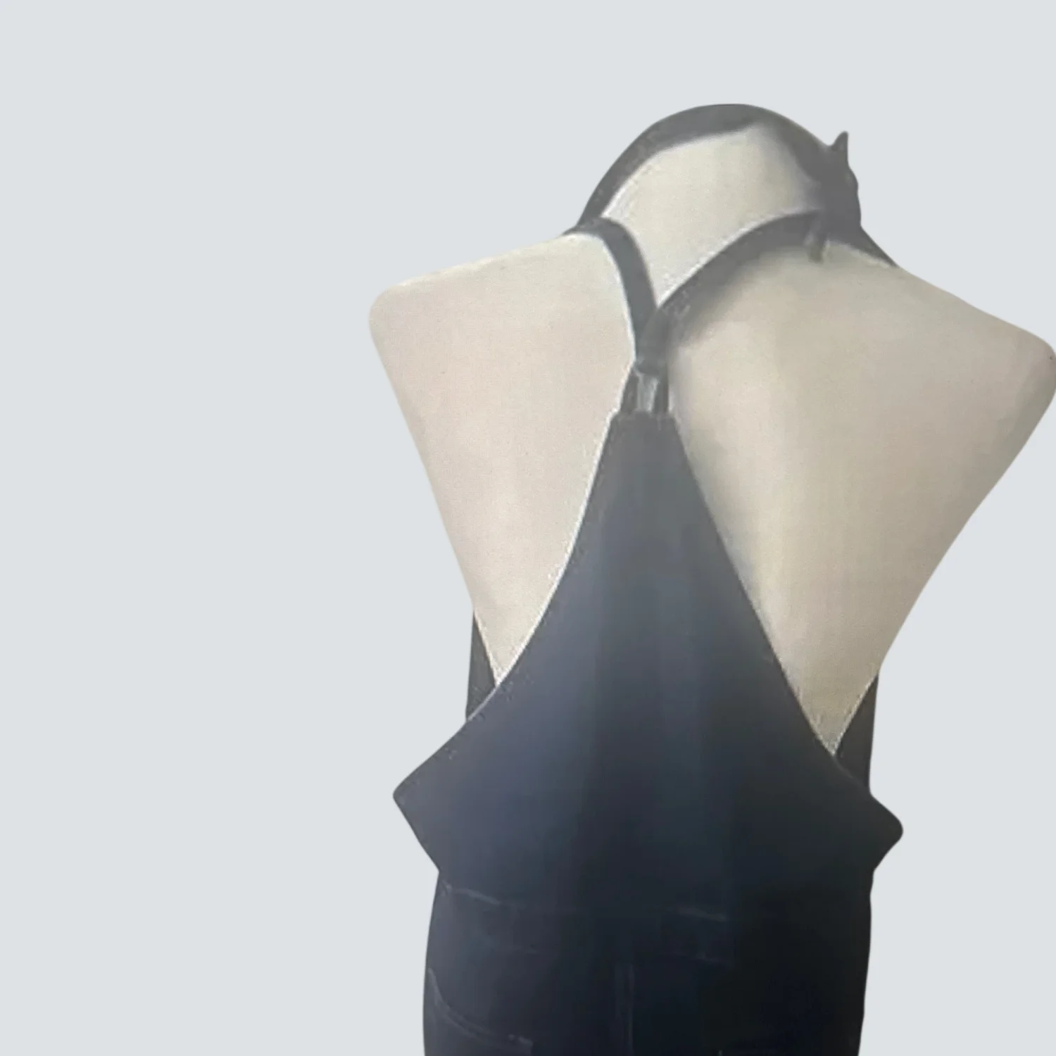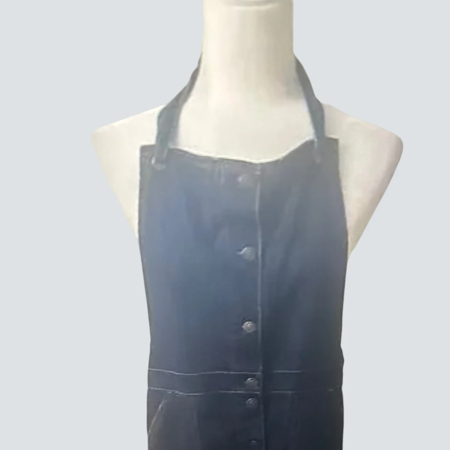 Style: Buttondown Raw Hem Halter Dress, with four pockets Color: Blue Size: L Waist: 19” Length: 27” Condition: New without tags 100% Cotton Machine wash