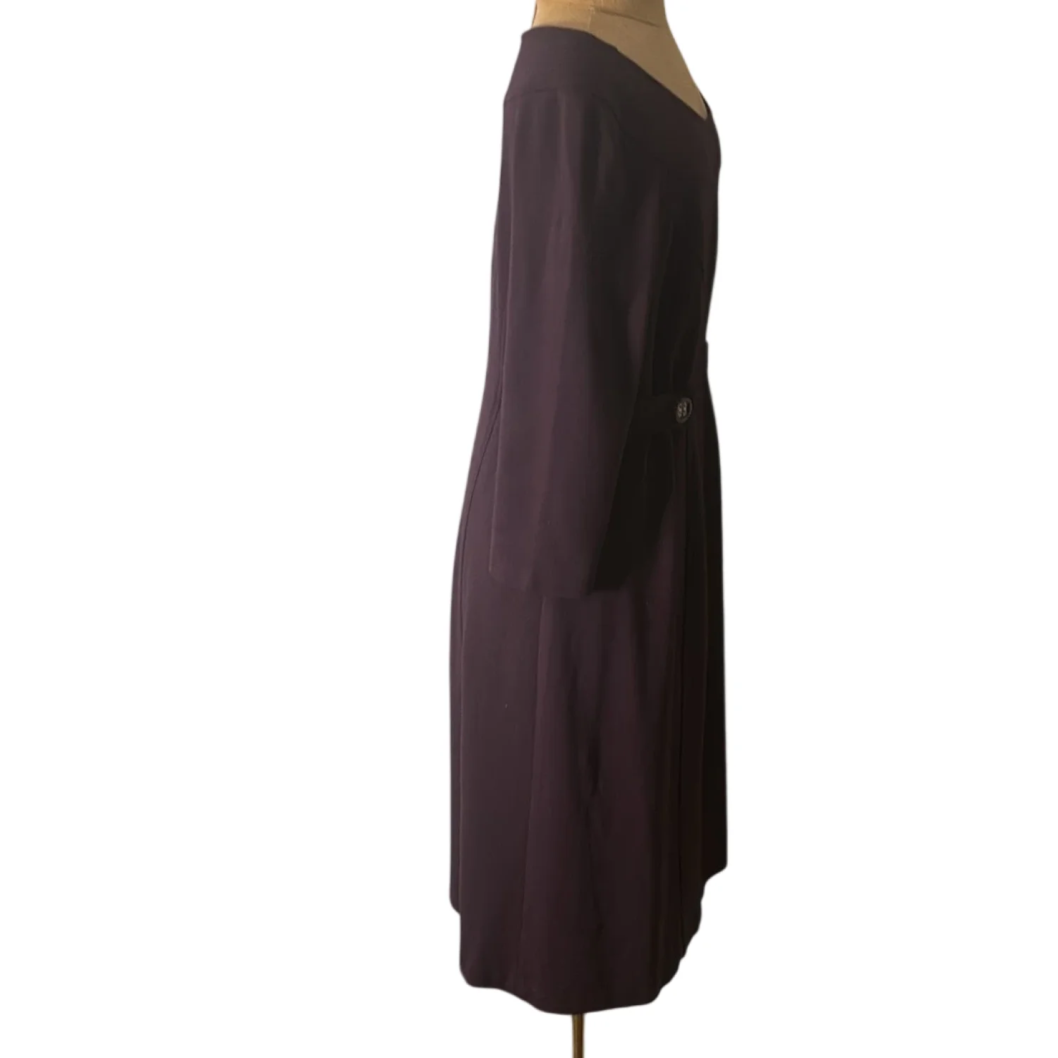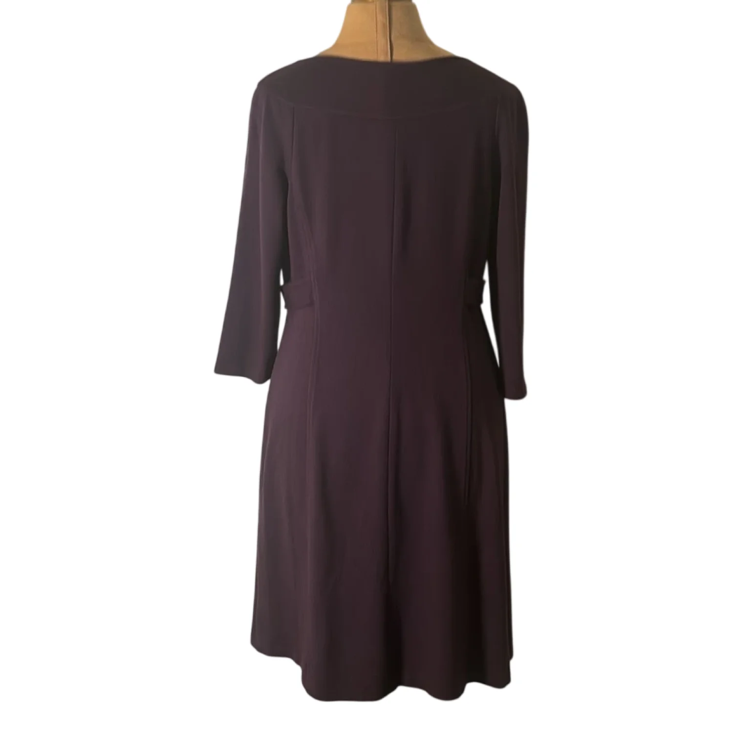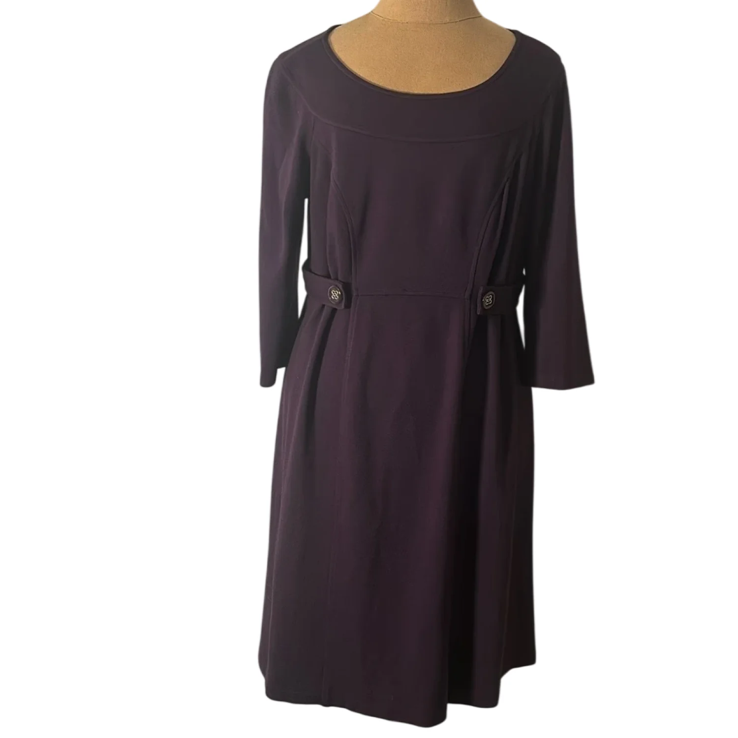 Style: Midi dress with button detail at waist Color: Purple Size: M Armpit: 16” Waist: 15” Length: 37” Condition: Good 74% Rayon 22% Nylon 4% Spandex Dry Clean Only