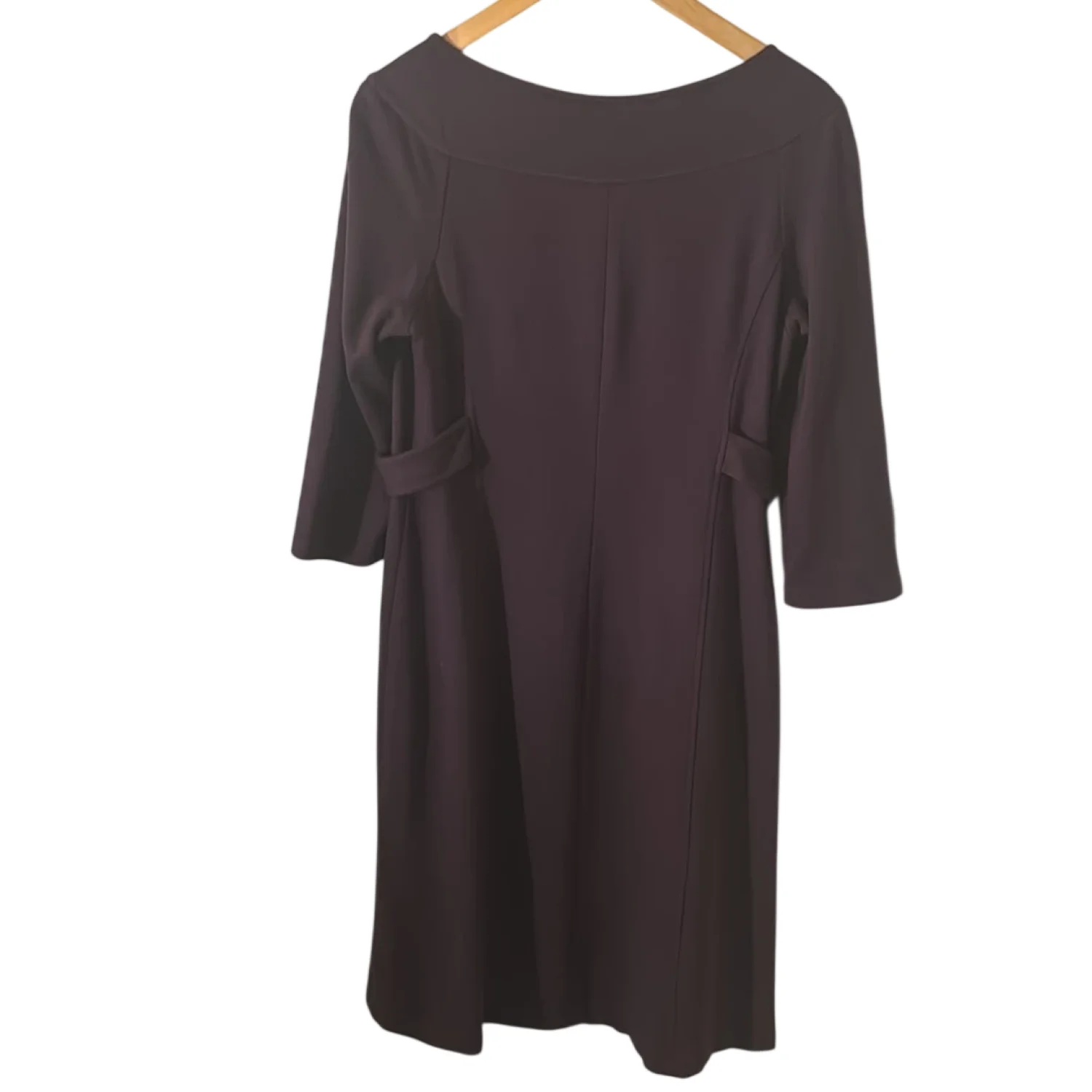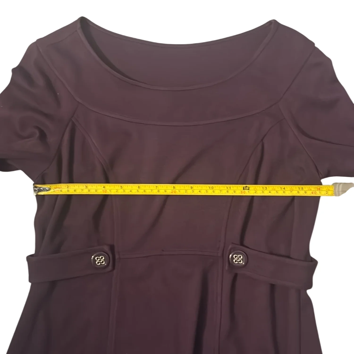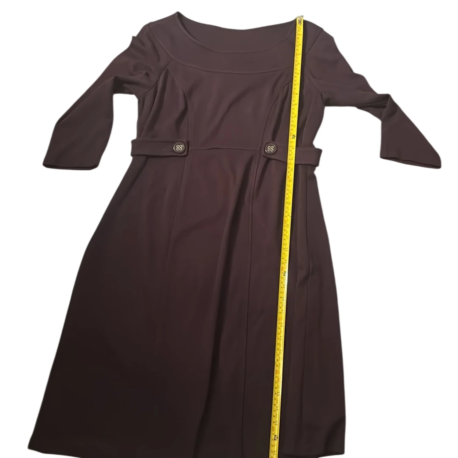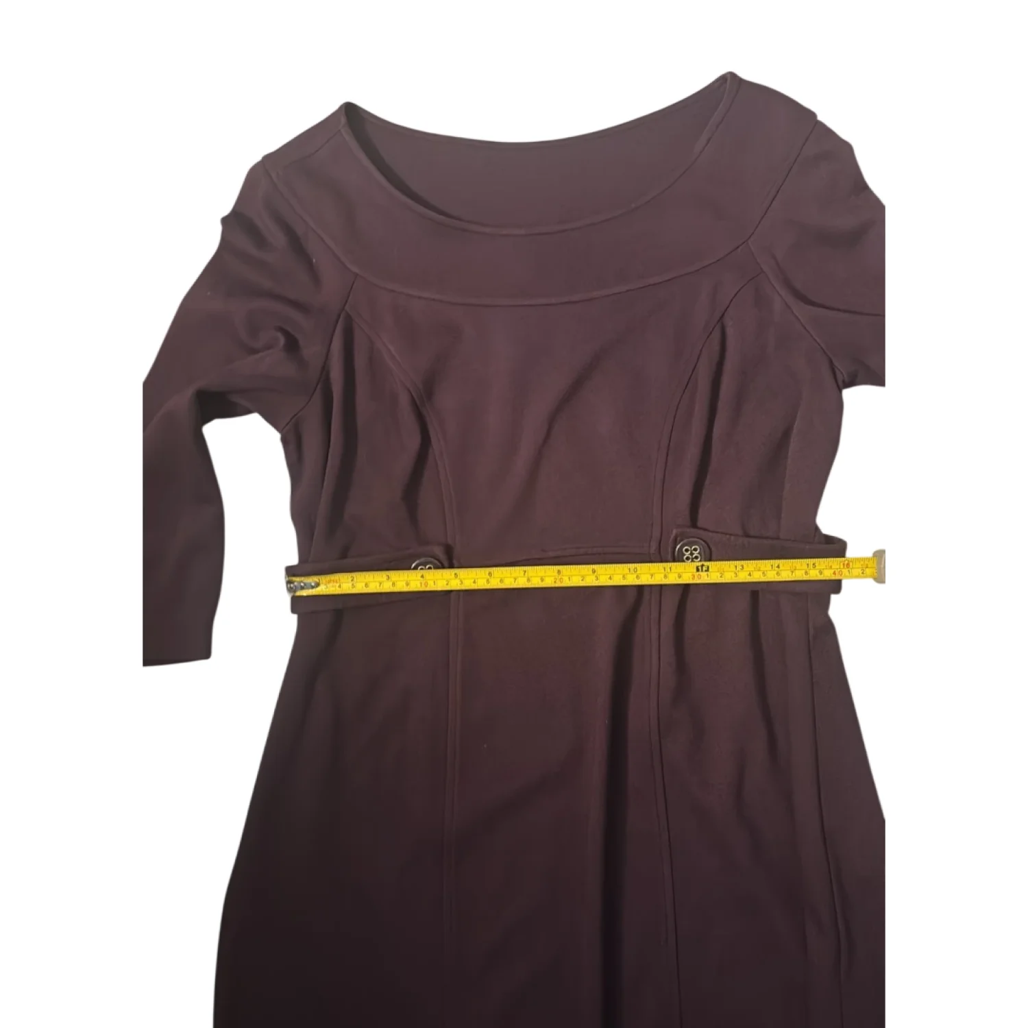 Style: Midi dress with button detail at waist Color: Purple Size: M Armpit: 16” Waist: 15” Length: 37” Condition: Good 74% Rayon 22% Nylon 4% Spandex Dry Clean Only