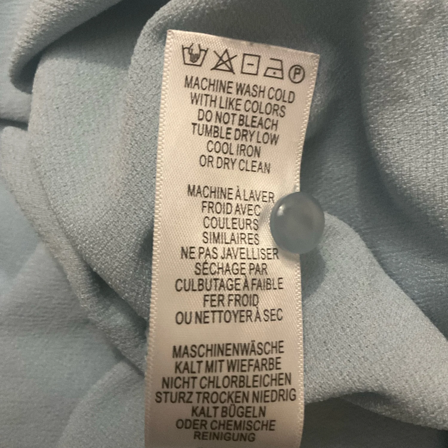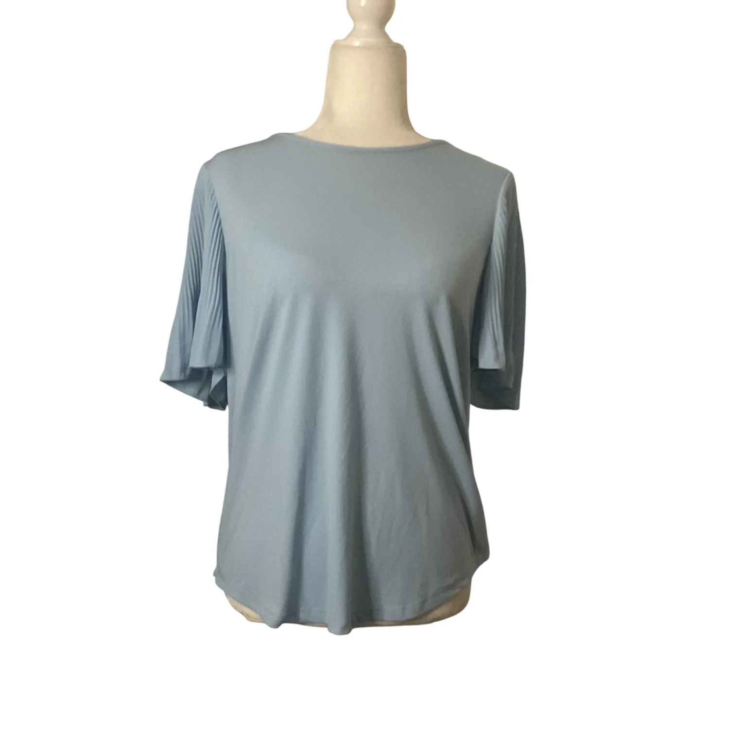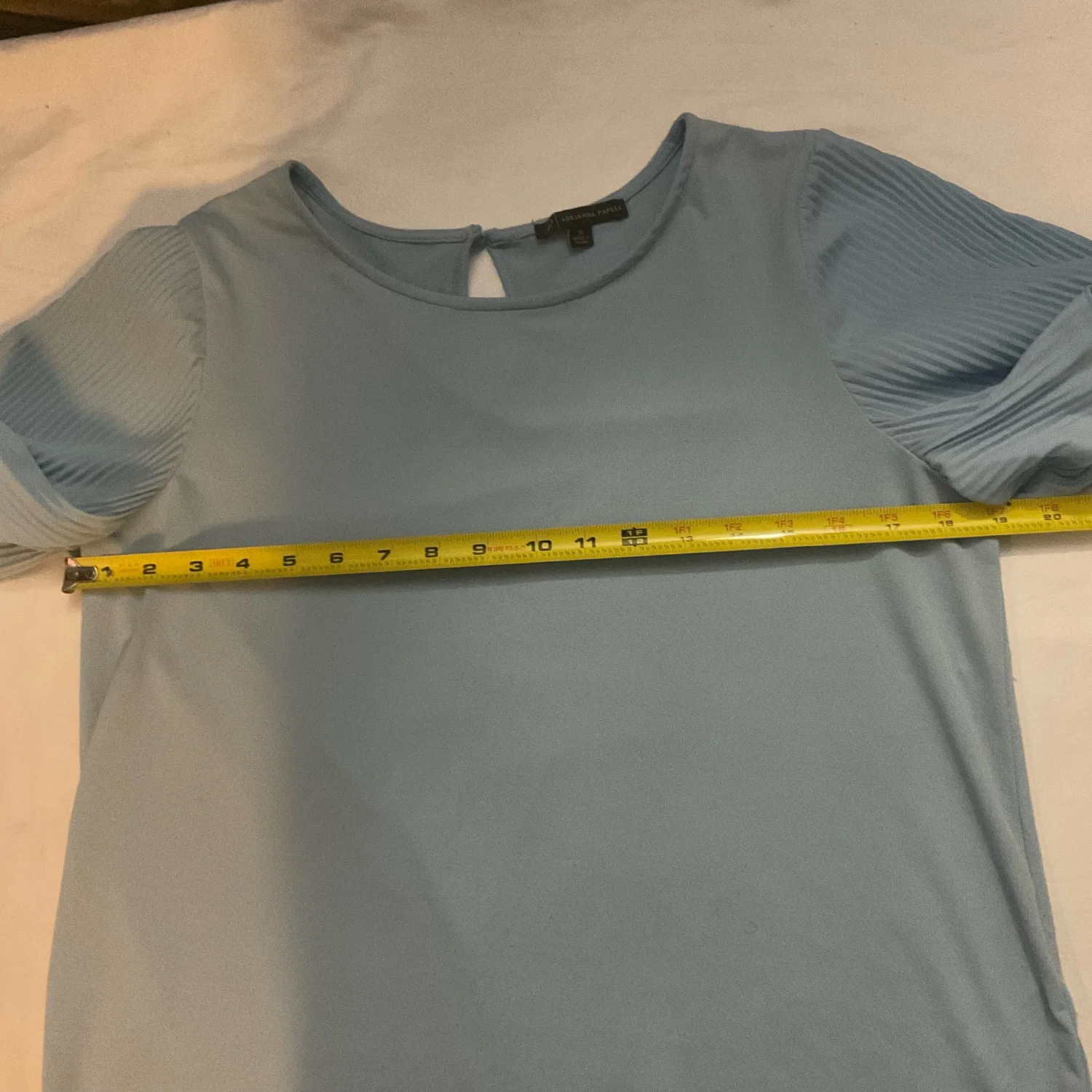 Style: Round neck blouse with pleated sleeves Color: Powder blue Size: M Armpit: 19" Length: 22" Condition: pilling on front as pictured 93% Polyester 7% Elastane Machine wash cold
