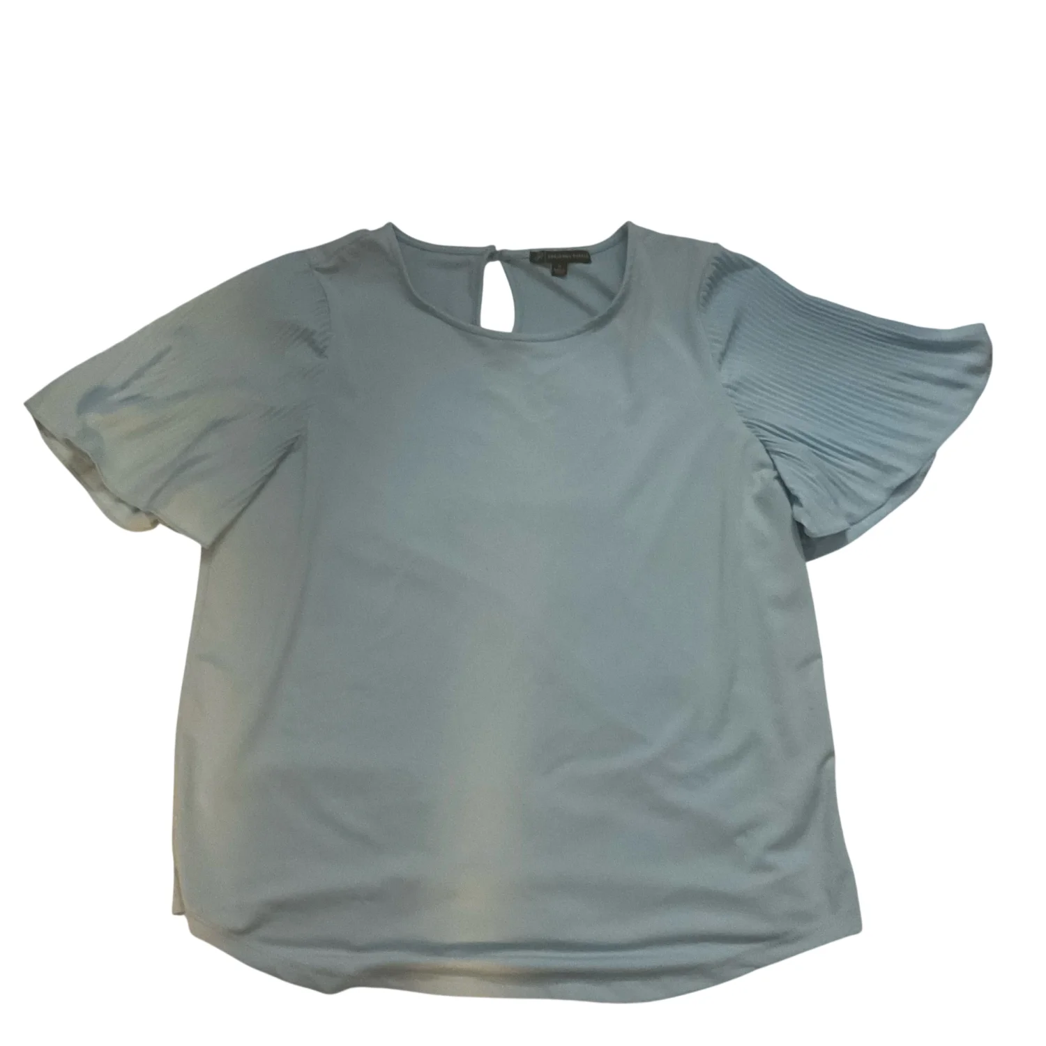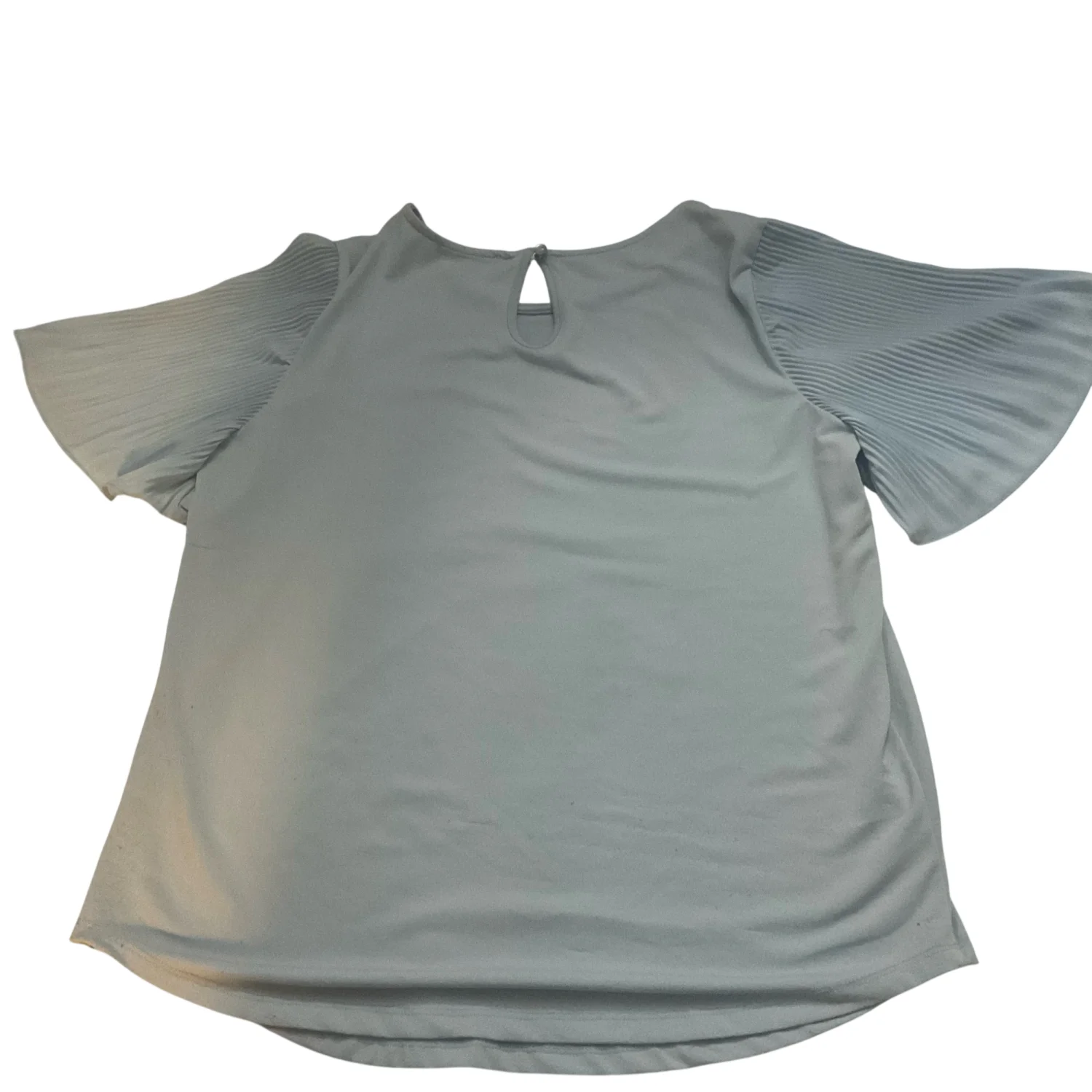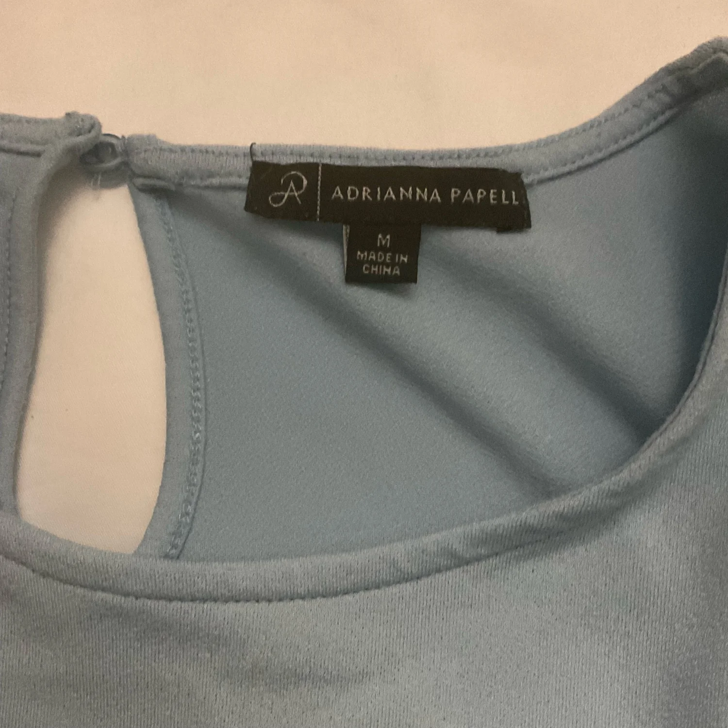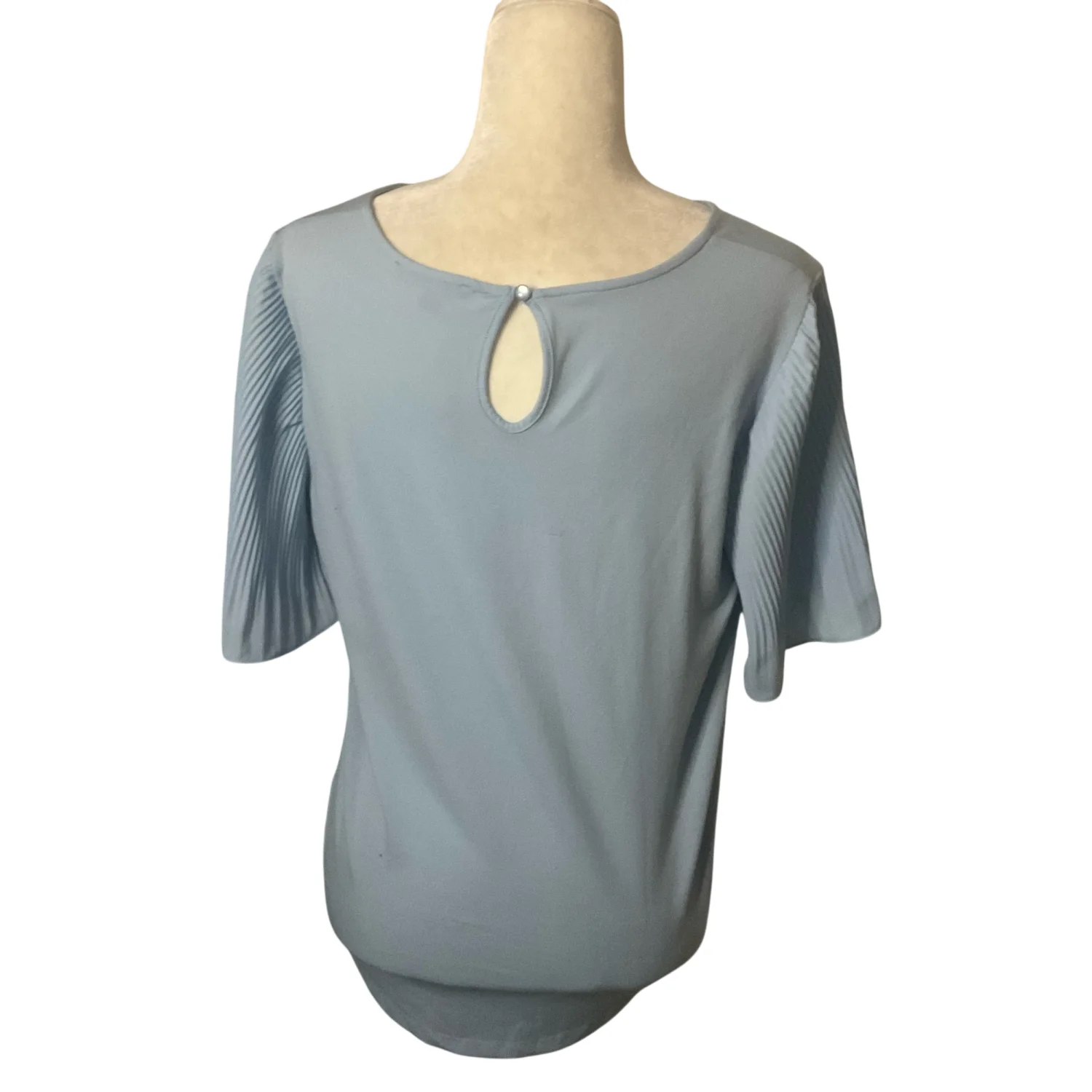 Style: Round neck blouse with pleated sleeves Color: Powder blue Size: M Armpit: 19" Length: 22" Condition: pilling on front as pictured 93% Polyester 7% Elastane Machine wash cold