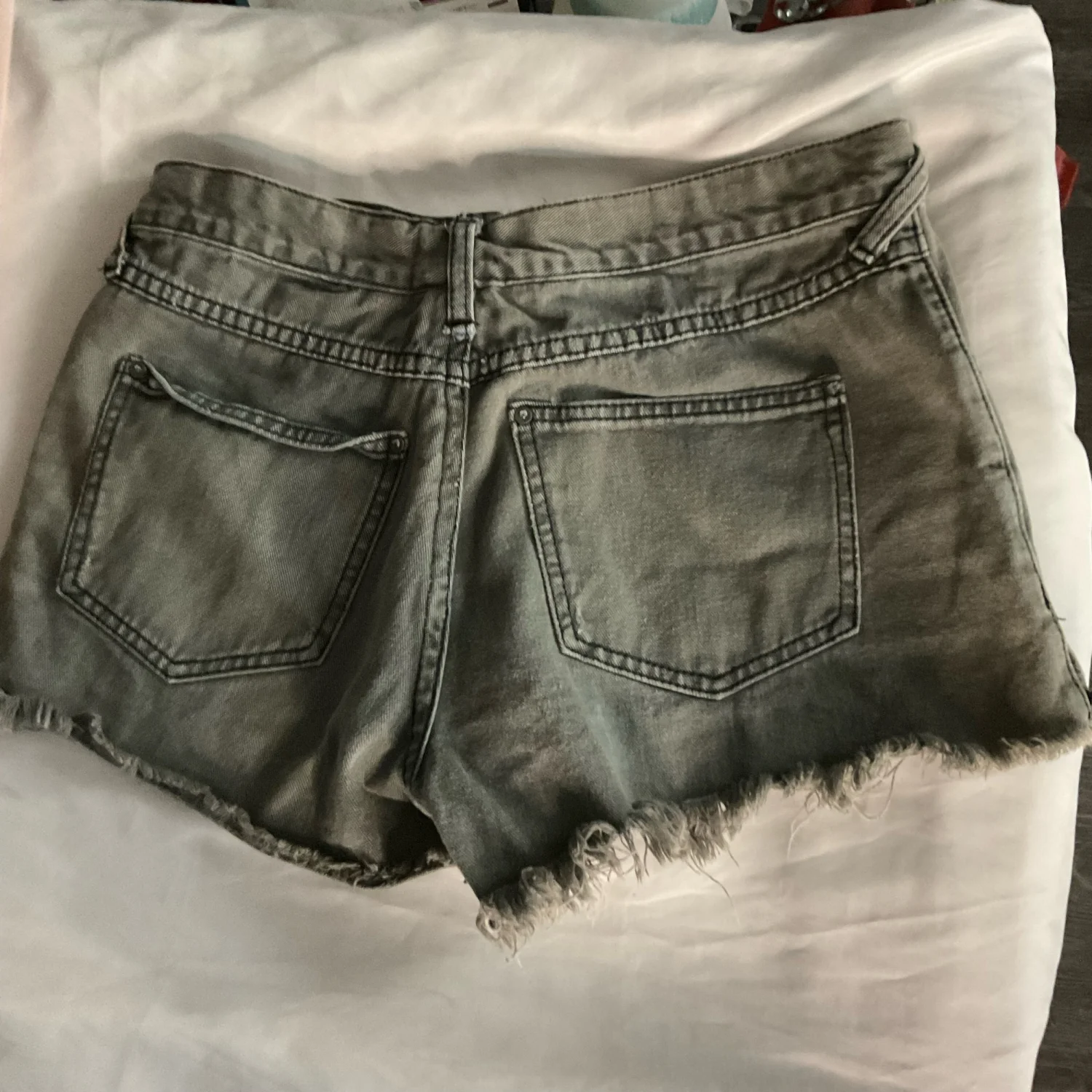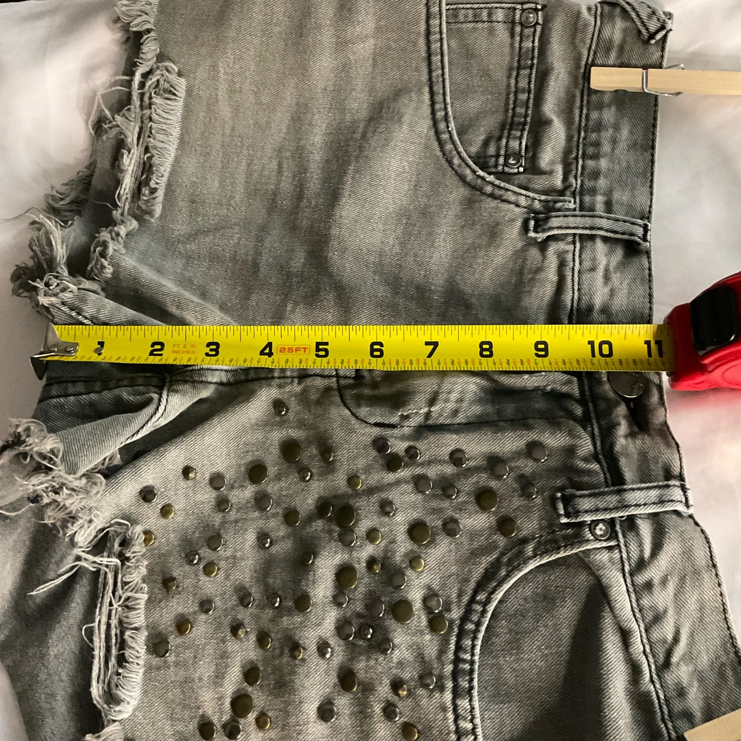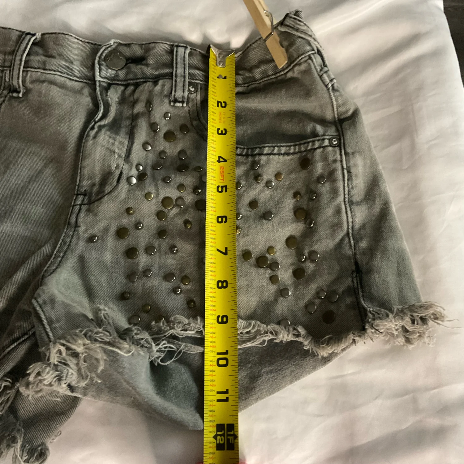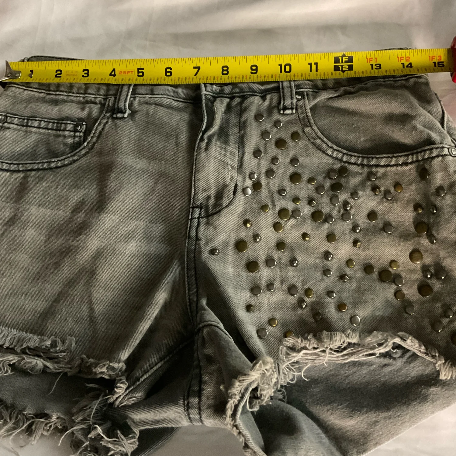 Style Frayed raw hem denim short with embellishhments Color: Gray Size: No size tag W: 14” Rise: 11 Length: 12 Condition: Good, no size tag Machine wash cold