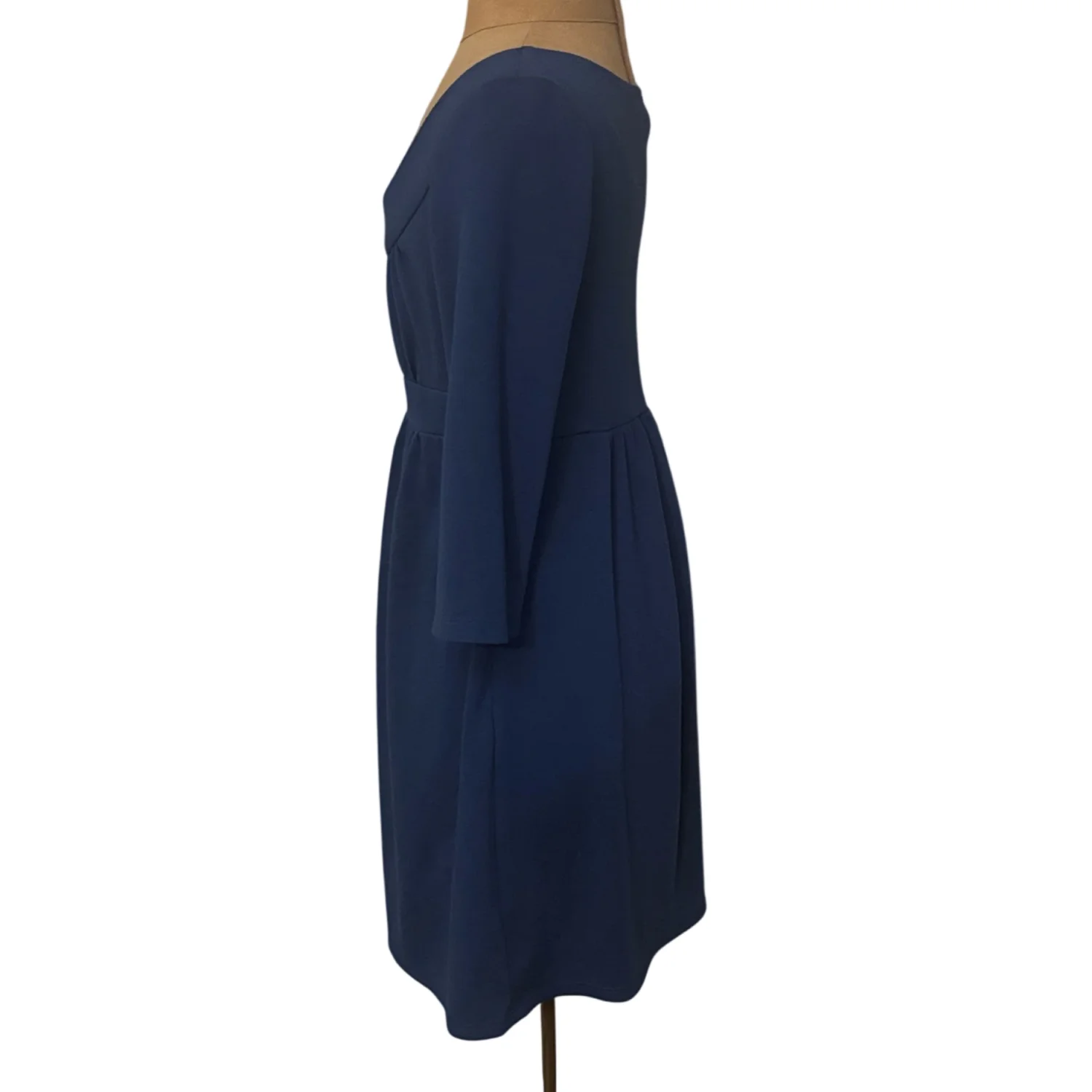 Style: Three quarter length sleeve, mini dress with side zip closure Color: Navy Size: 4P Armpit; 14" Waist: 14" Length: 30" Condition: Good, preowned 78% Polyester 22% Rayon Machine wash cold