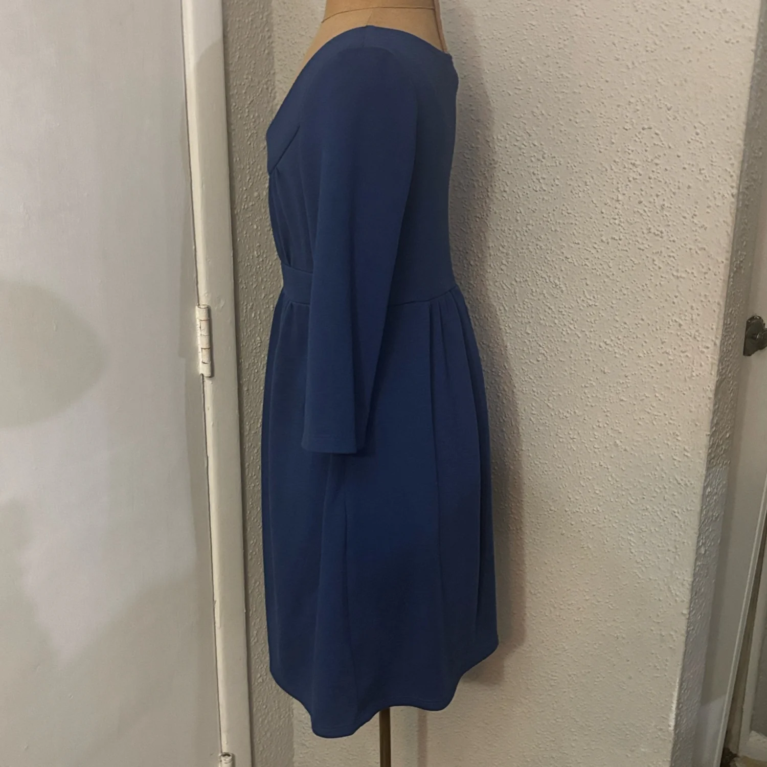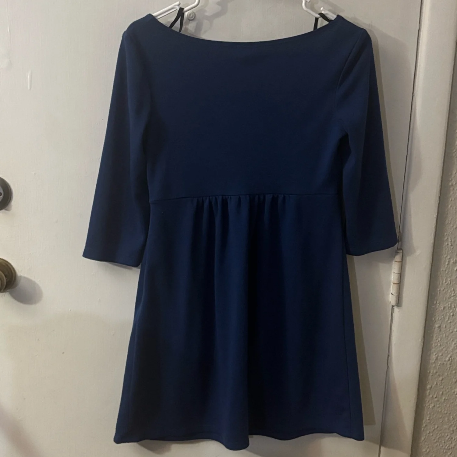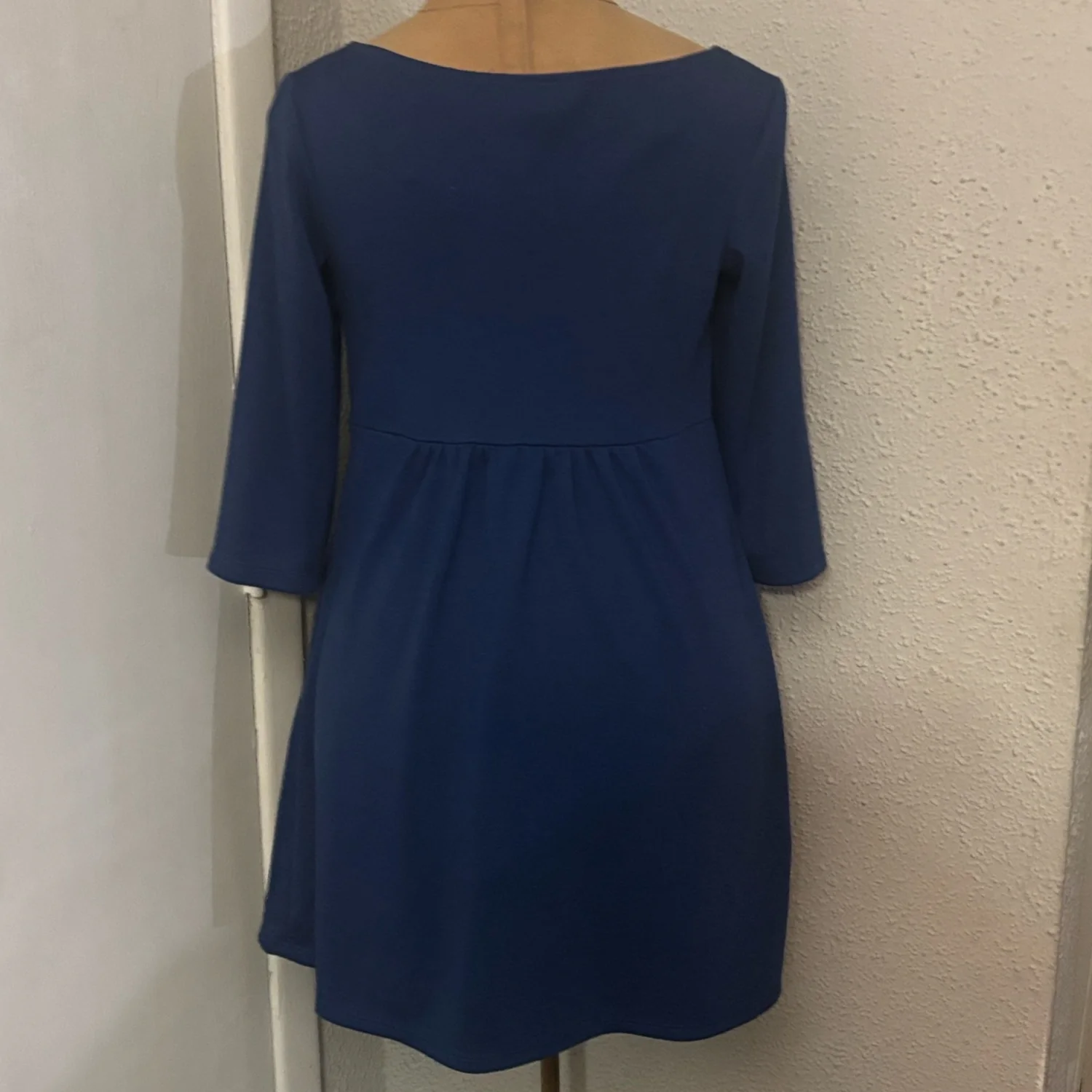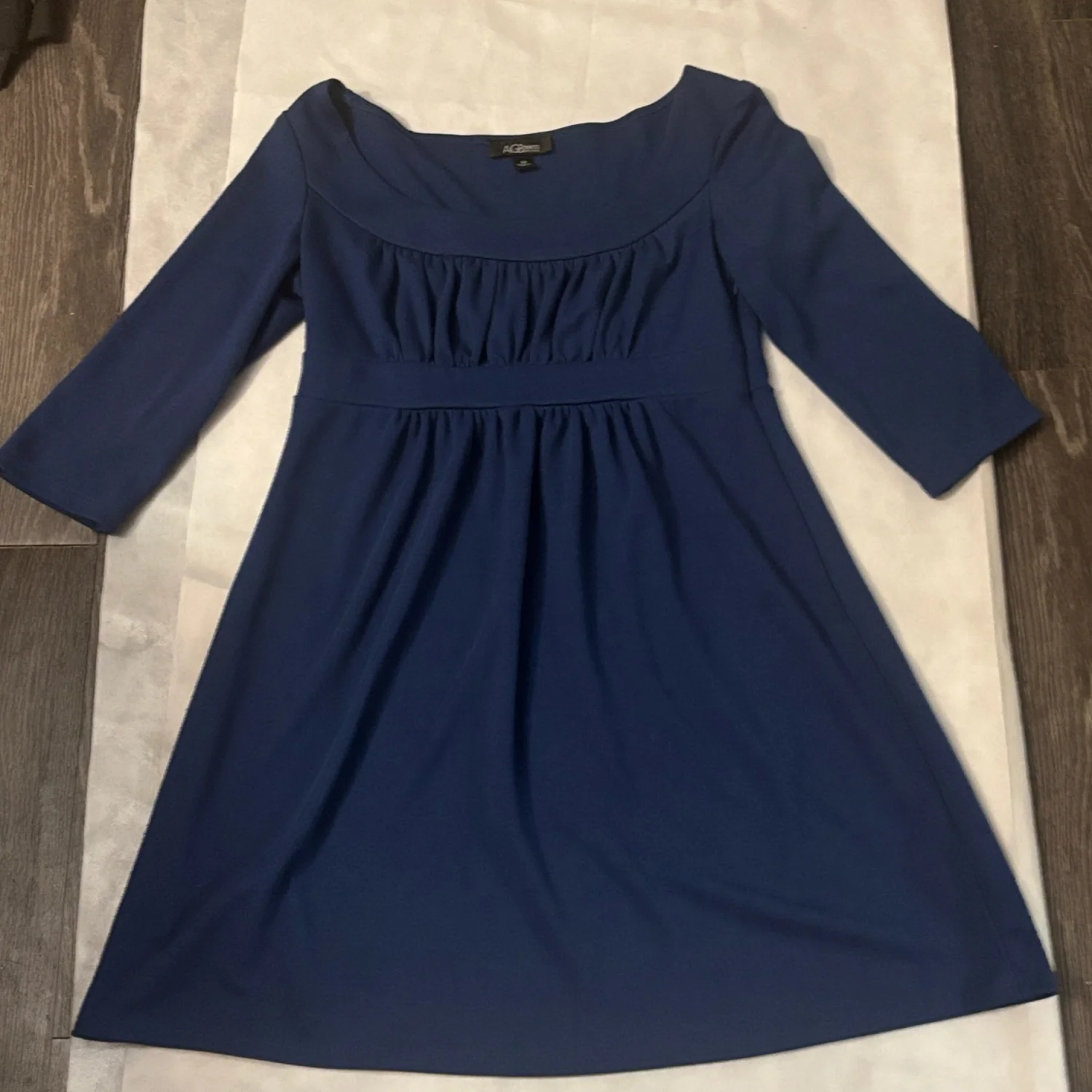 Style: Three quarter length sleeve, mini dress with side zip closure Color: Navy Size: 4P Armpit; 14" Waist: 14" Length: 30" Condition: Good, preowned 78% Polyester 22% Rayon Machine wash cold