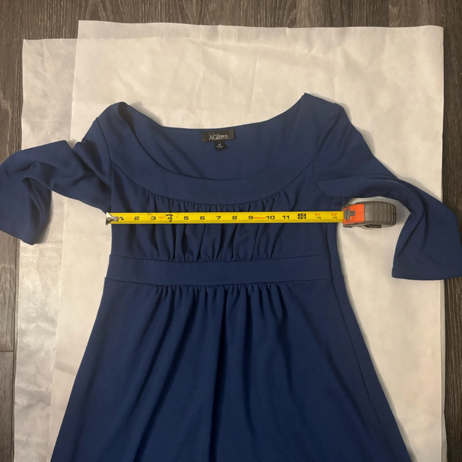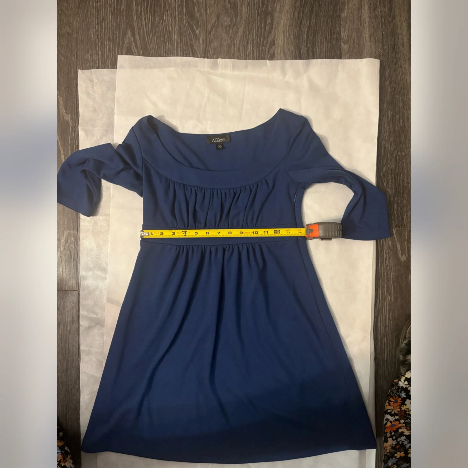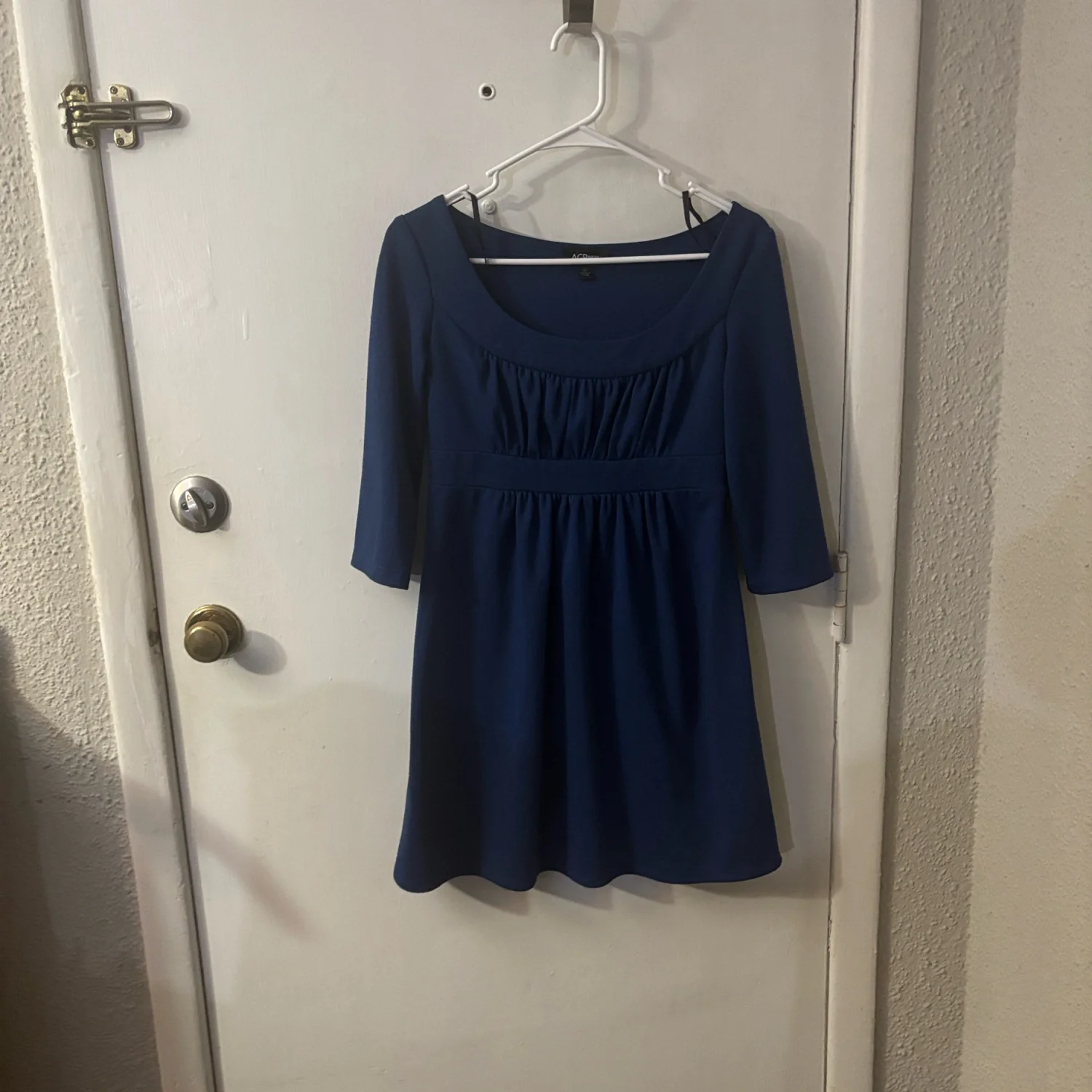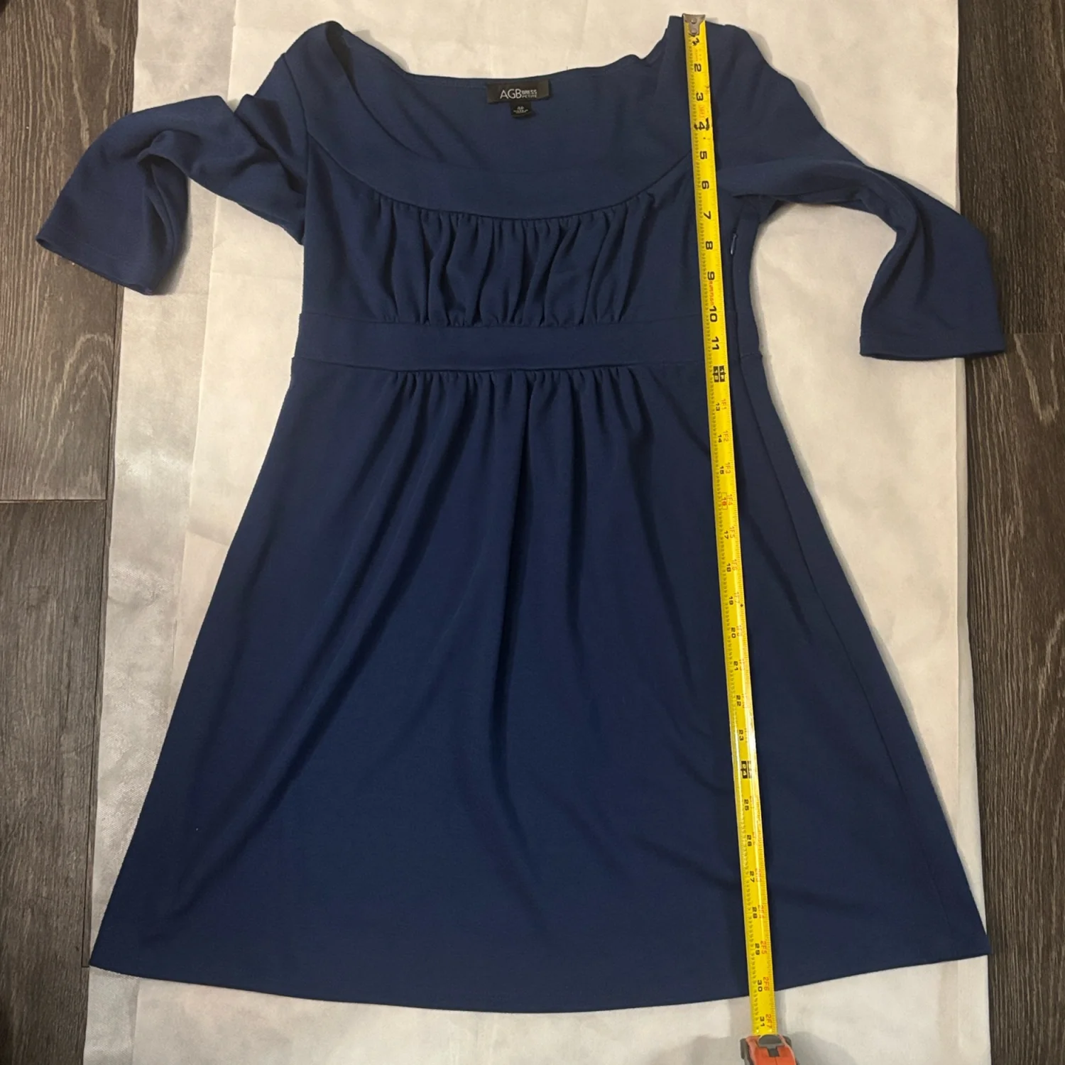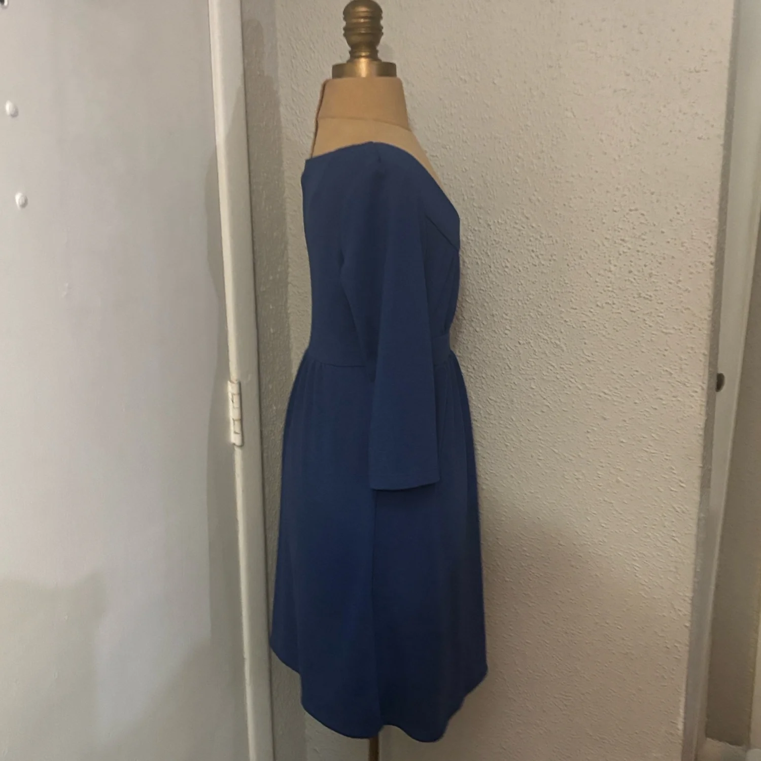 Style: Three quarter length sleeve, mini dress with side zip closure Color: Navy Size: 4P Armpit; 14" Waist: 14" Length: 30" Condition: Good, preowned 78% Polyester 22% Rayon Machine wash cold