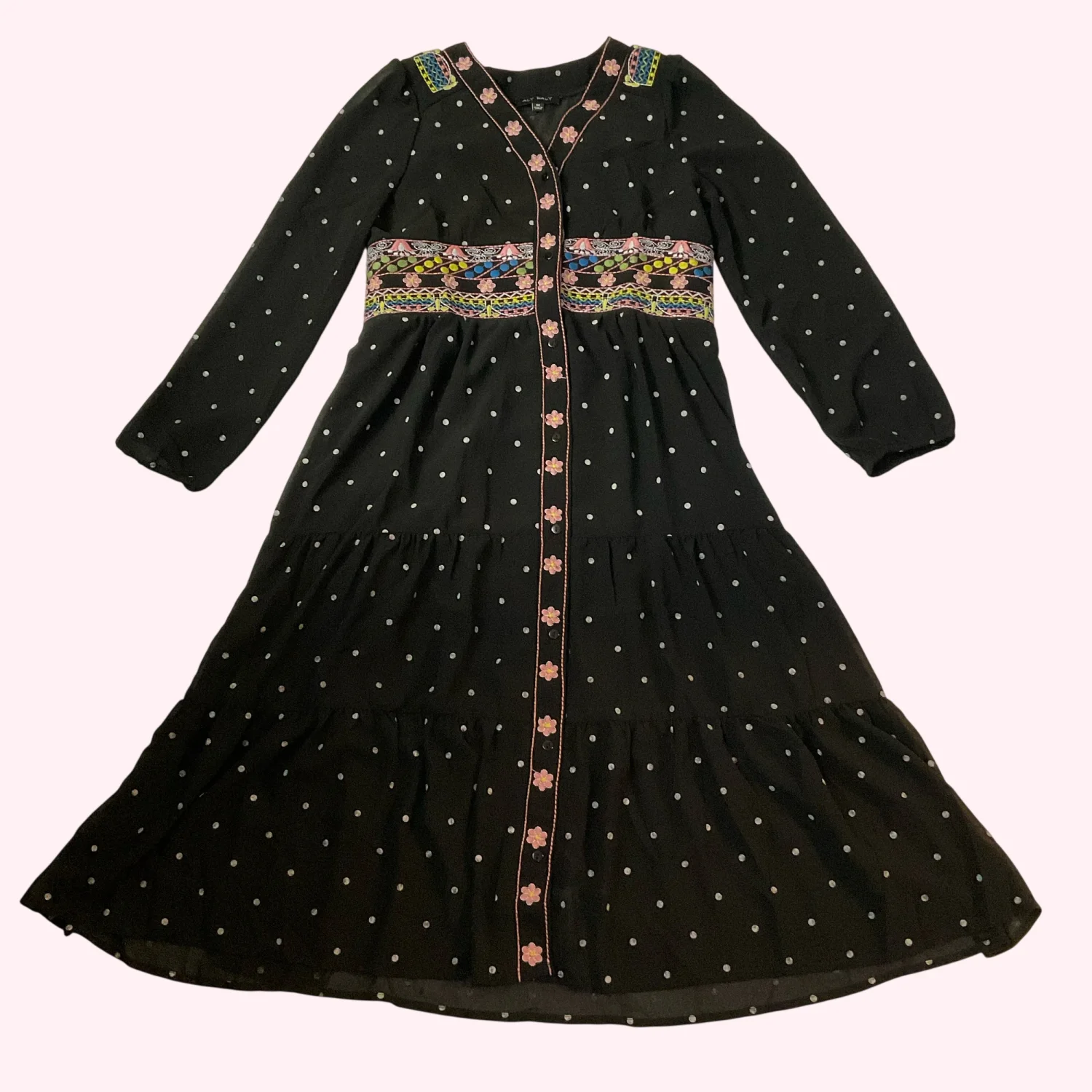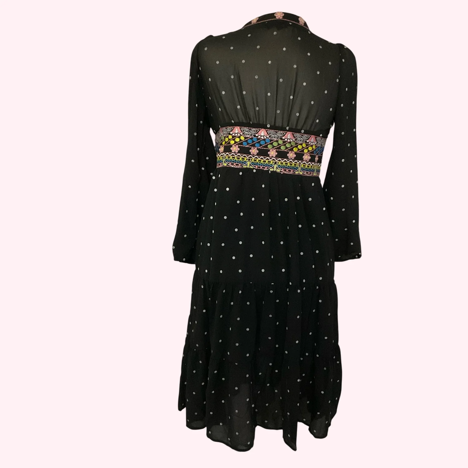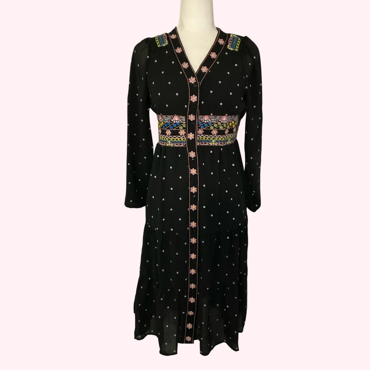 Style: Embroidered Midi Dress with lining and long sleeves Color:Pink/Yellow/Blue Size: M Armpit: 16" Sleeve: 20" Length: 39" Condition; Good 65% Cotton 35% Polyester Machine wash