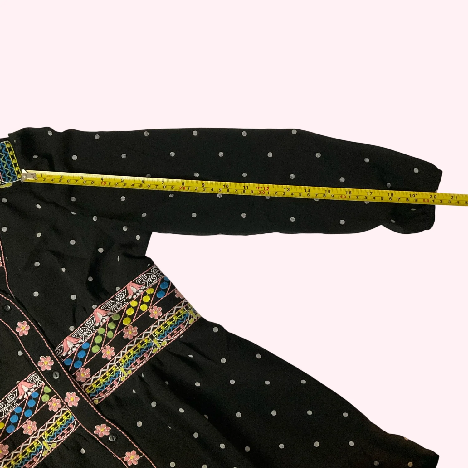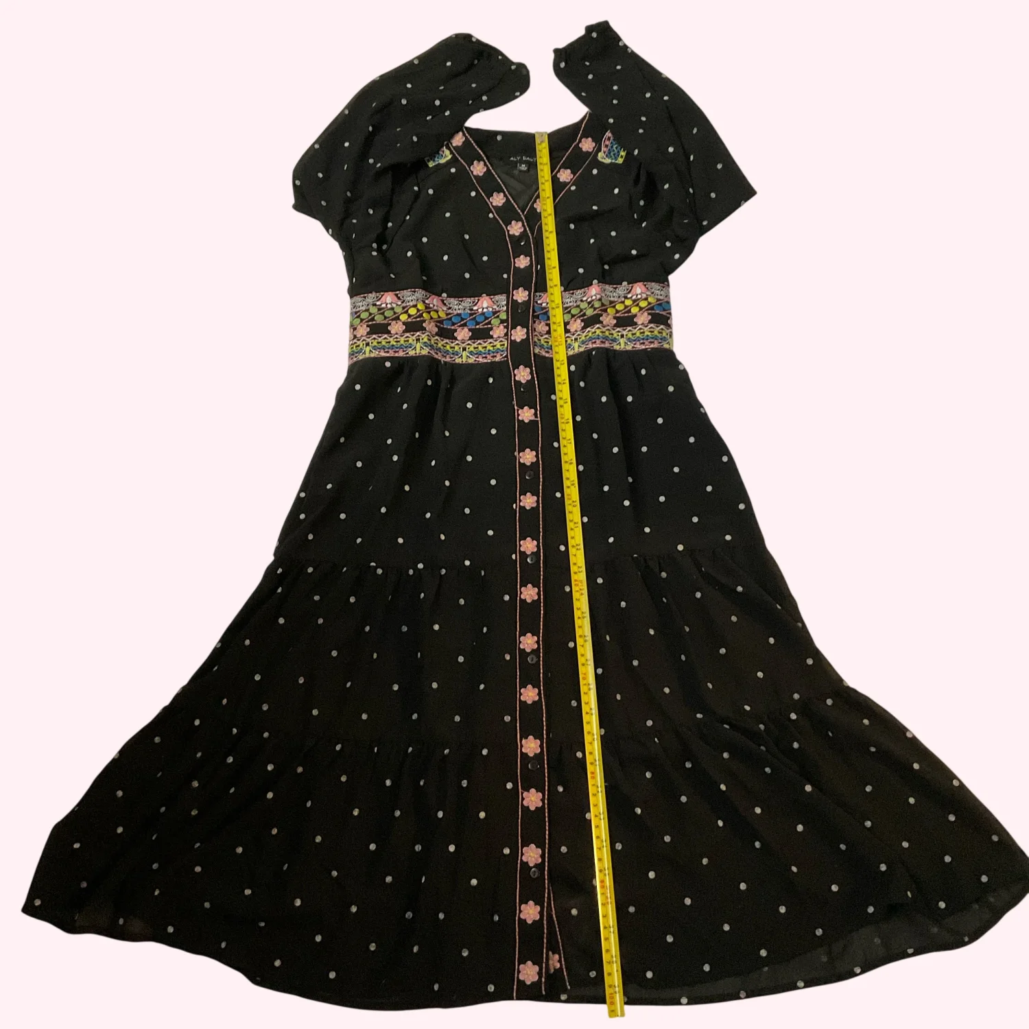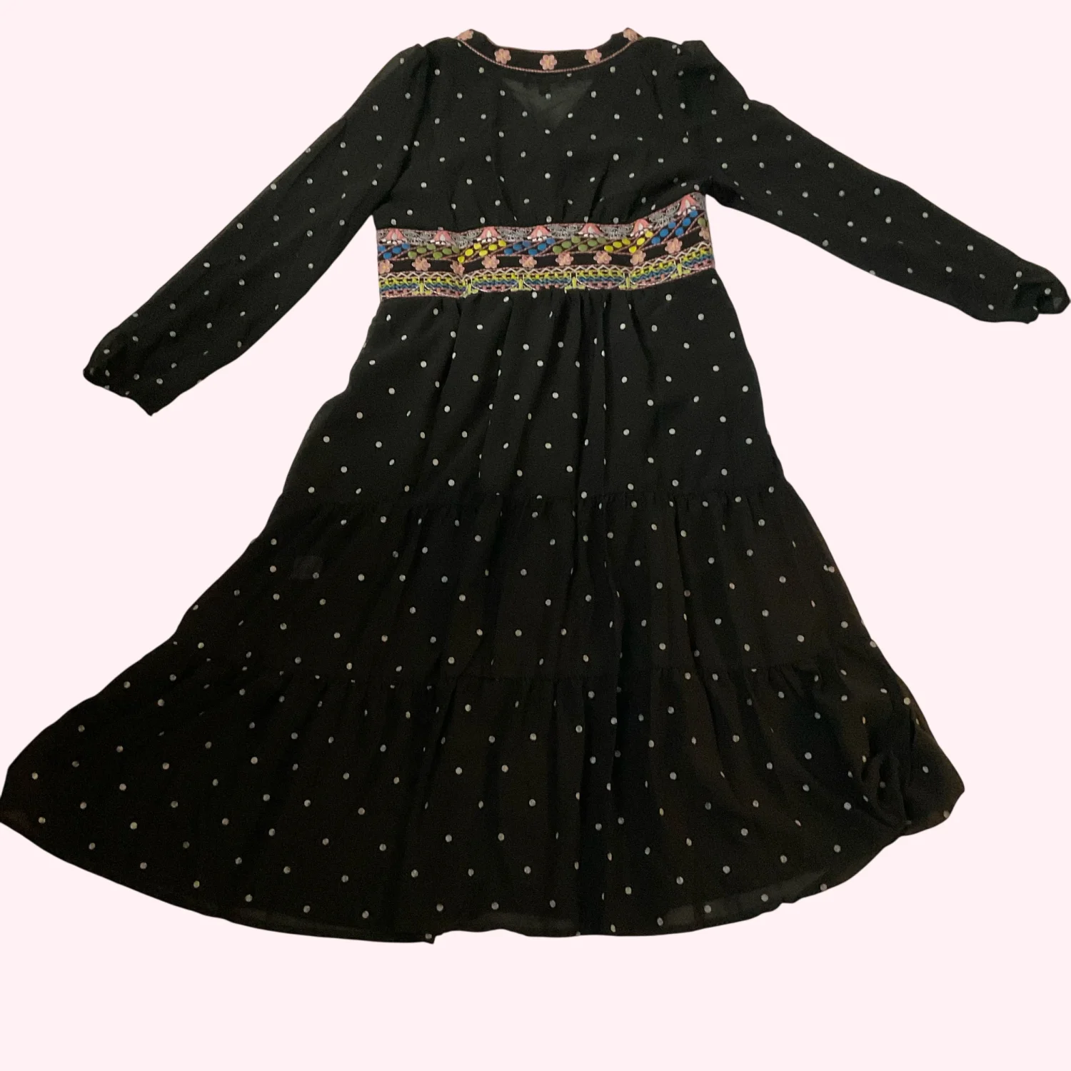 Style: Embroidered Midi Dress with lining and long sleeves Color:Pink/Yellow/Blue Size: M Armpit: 16" Sleeve: 20" Length: 39" Condition; Good 65% Cotton 35% Polyester Machine wash