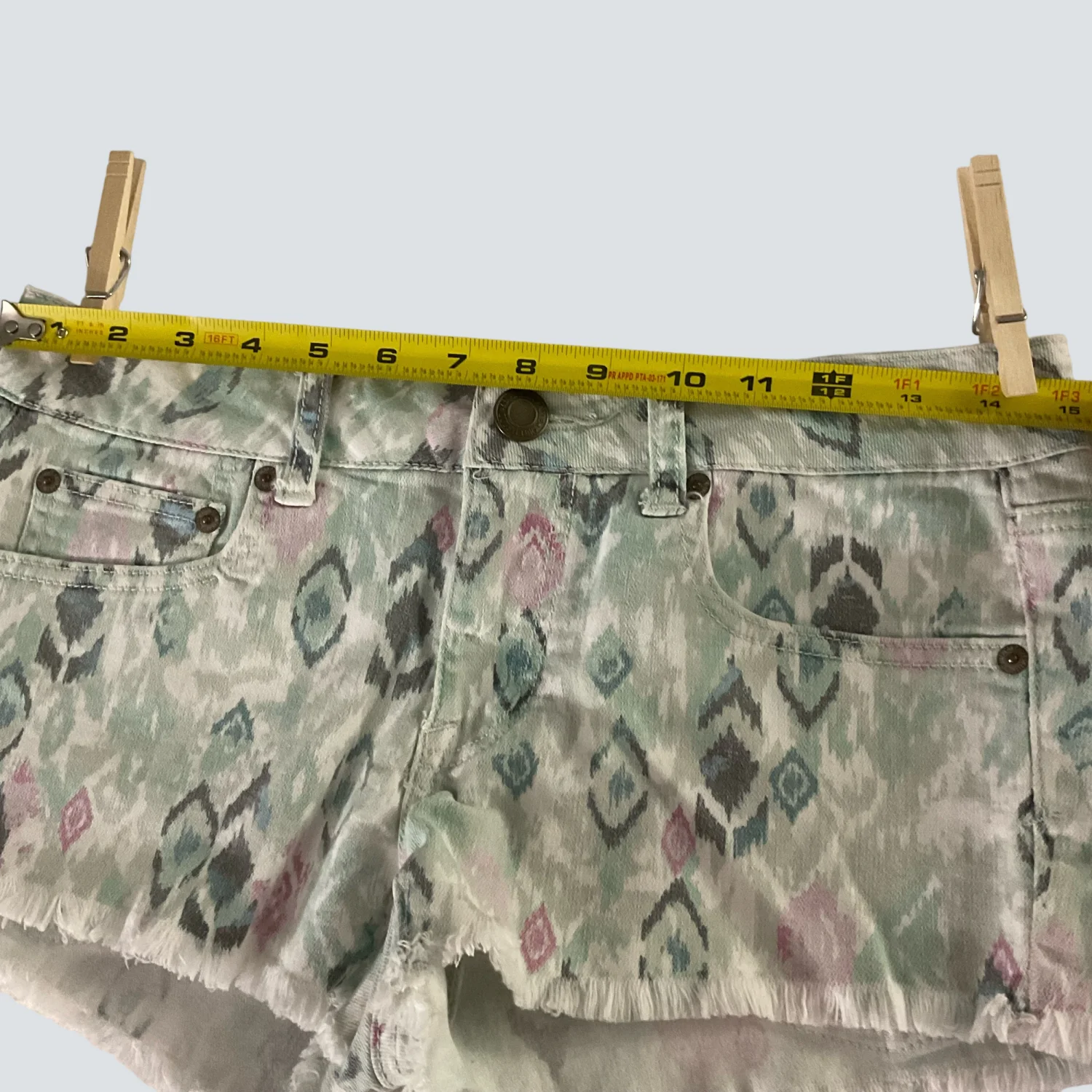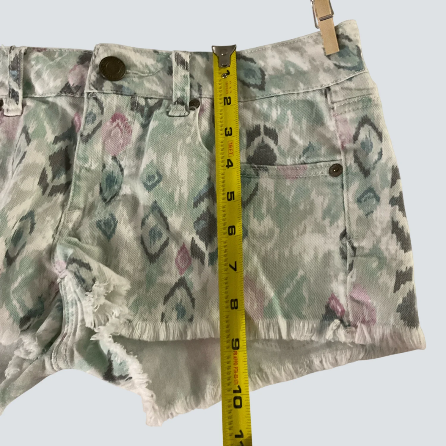 Style: 5 pocket, Aztec print raw hem denim shorts Color: White, Mint Green, Pink Size: 6 Waist: 16" Length: 10" Condition: Good 70% Cotton 29% Polyester 1% Spandex Machine wash cold