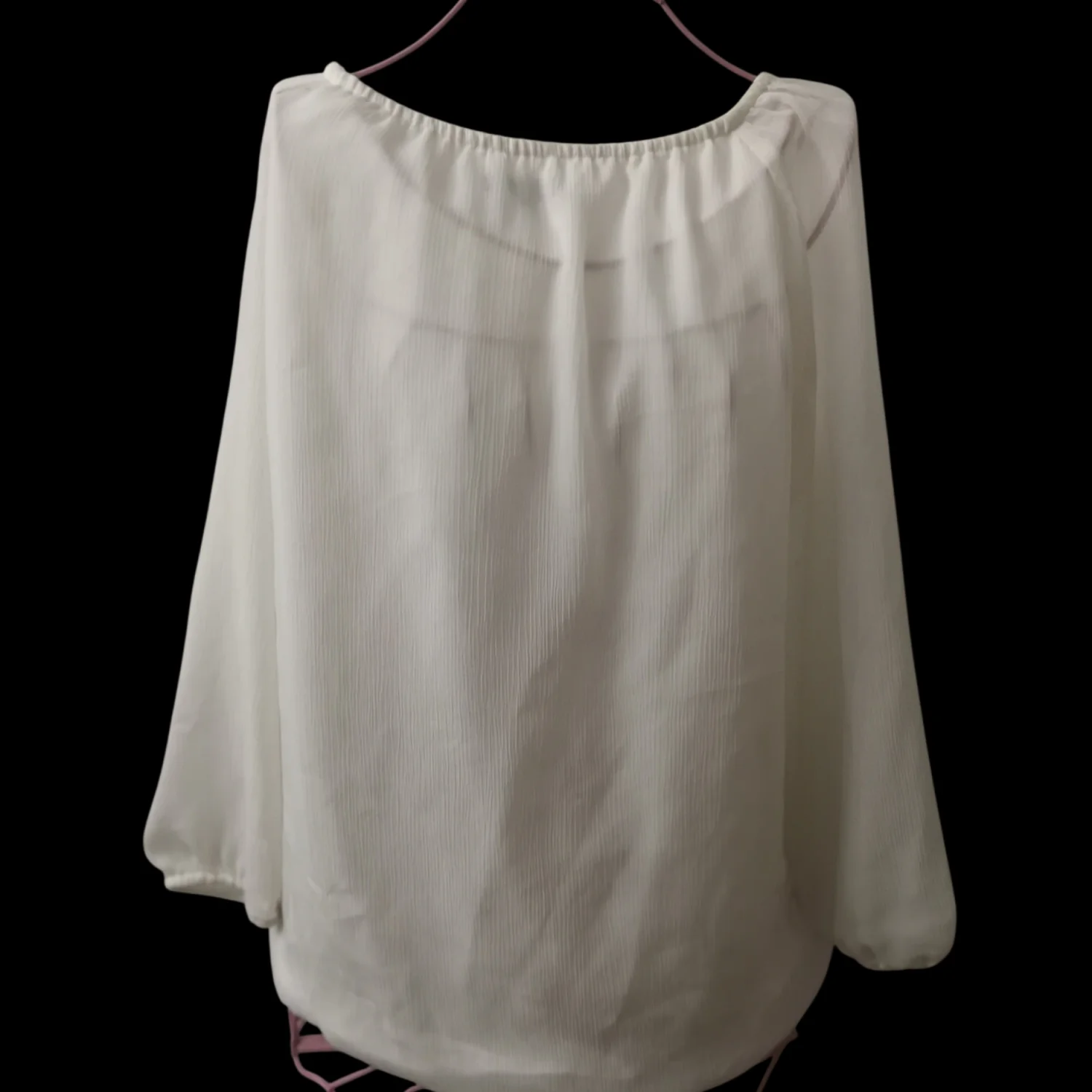 Style: Lined sheer blouse with gathered balloon sleeves Color: White Size: XS Armpit: 18” Length: 20” Sleeve: 24” 100% Polyester Machine wash cold
