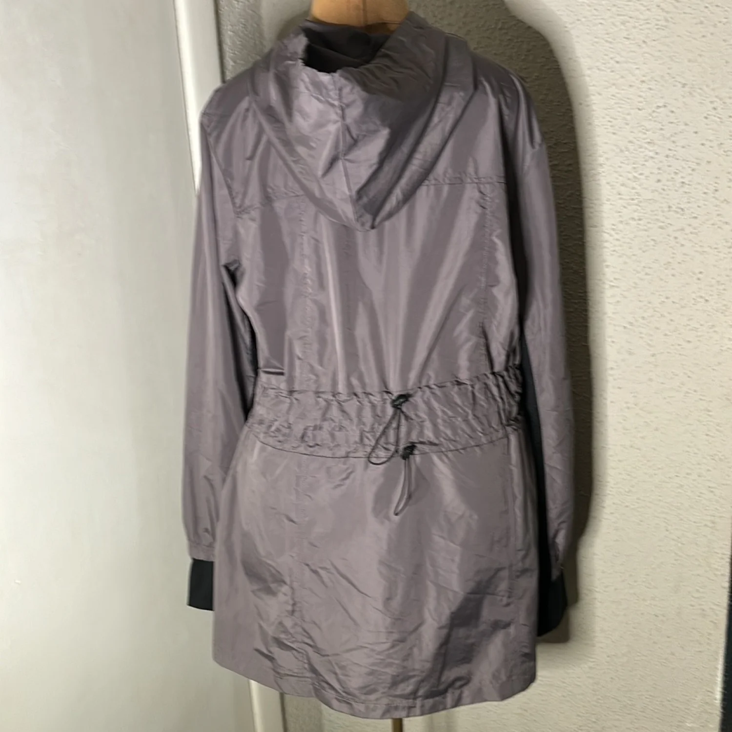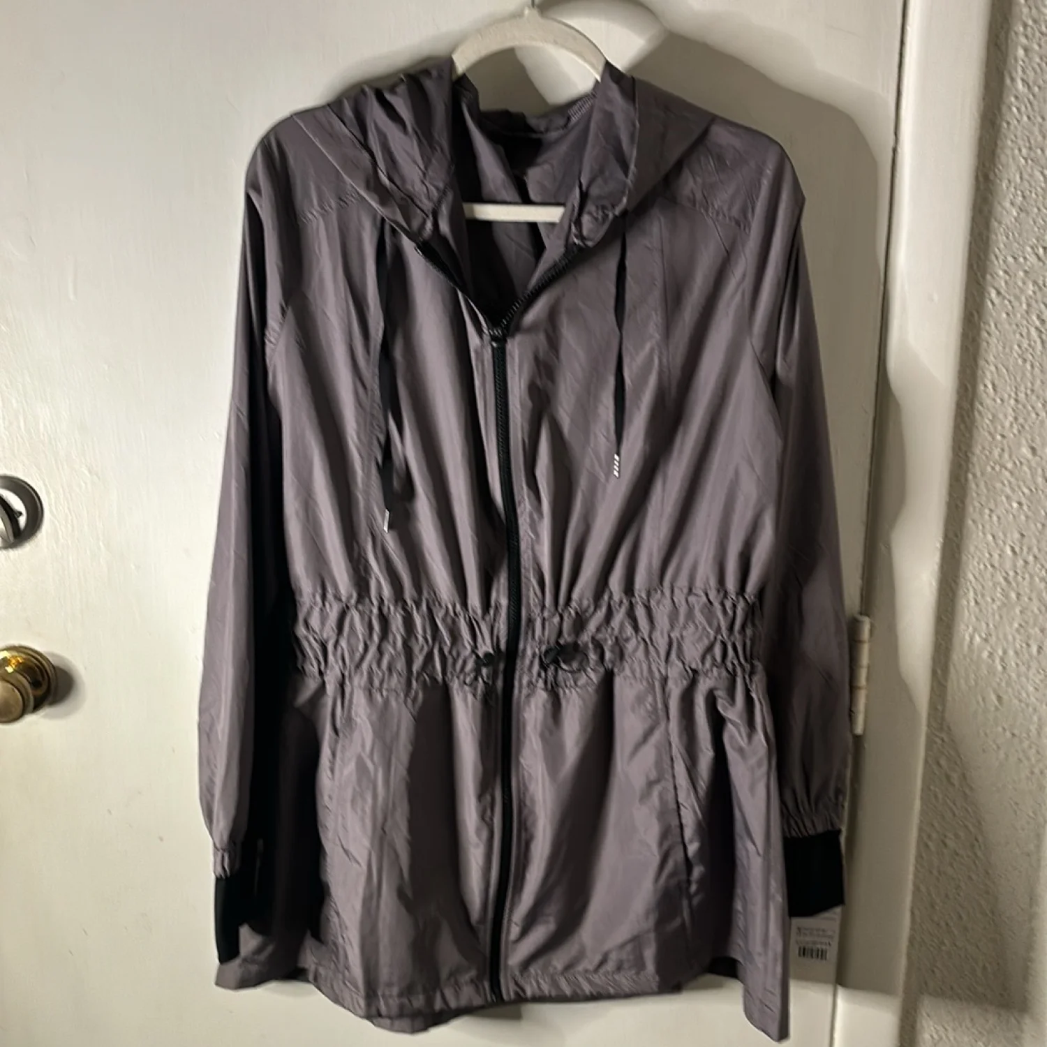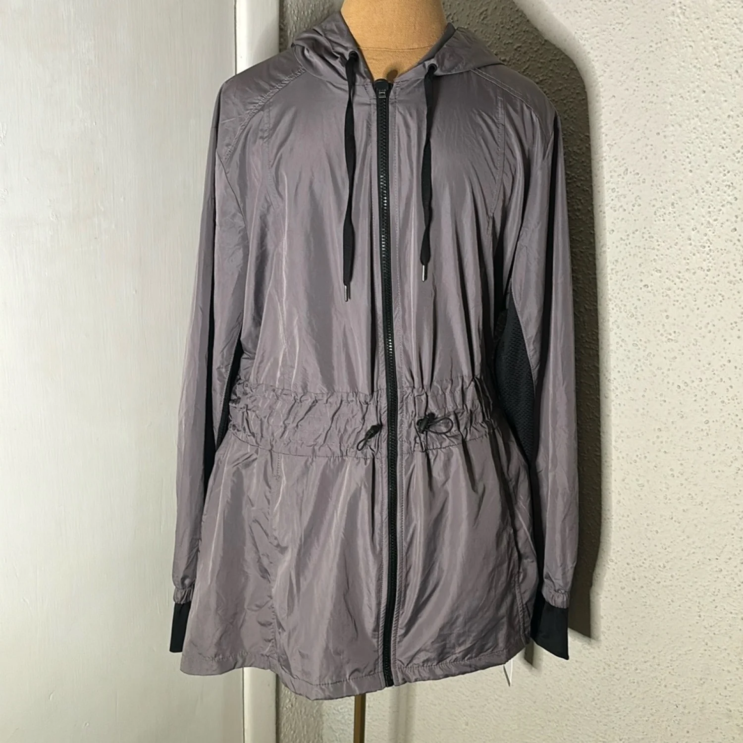 Style: Long sleeve, lightweight jacket with two pockets, adjustable waist, thumbhole cuffs and hood Color: Grey Wing Gray/Black Size: L Armpit: 20” Length: 43” Sleeve: 32” Condition: New 100% Polyester Machine wash cold