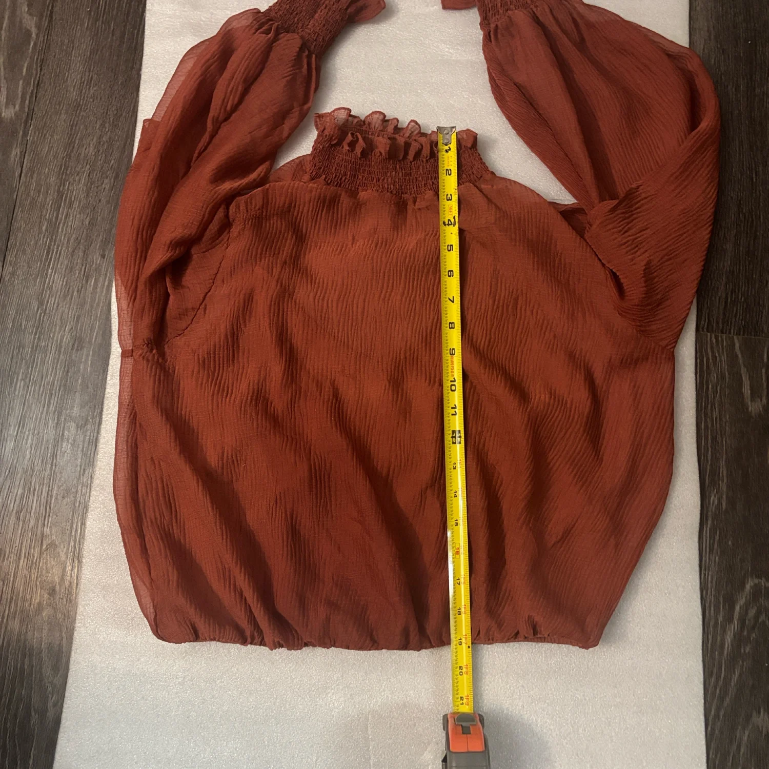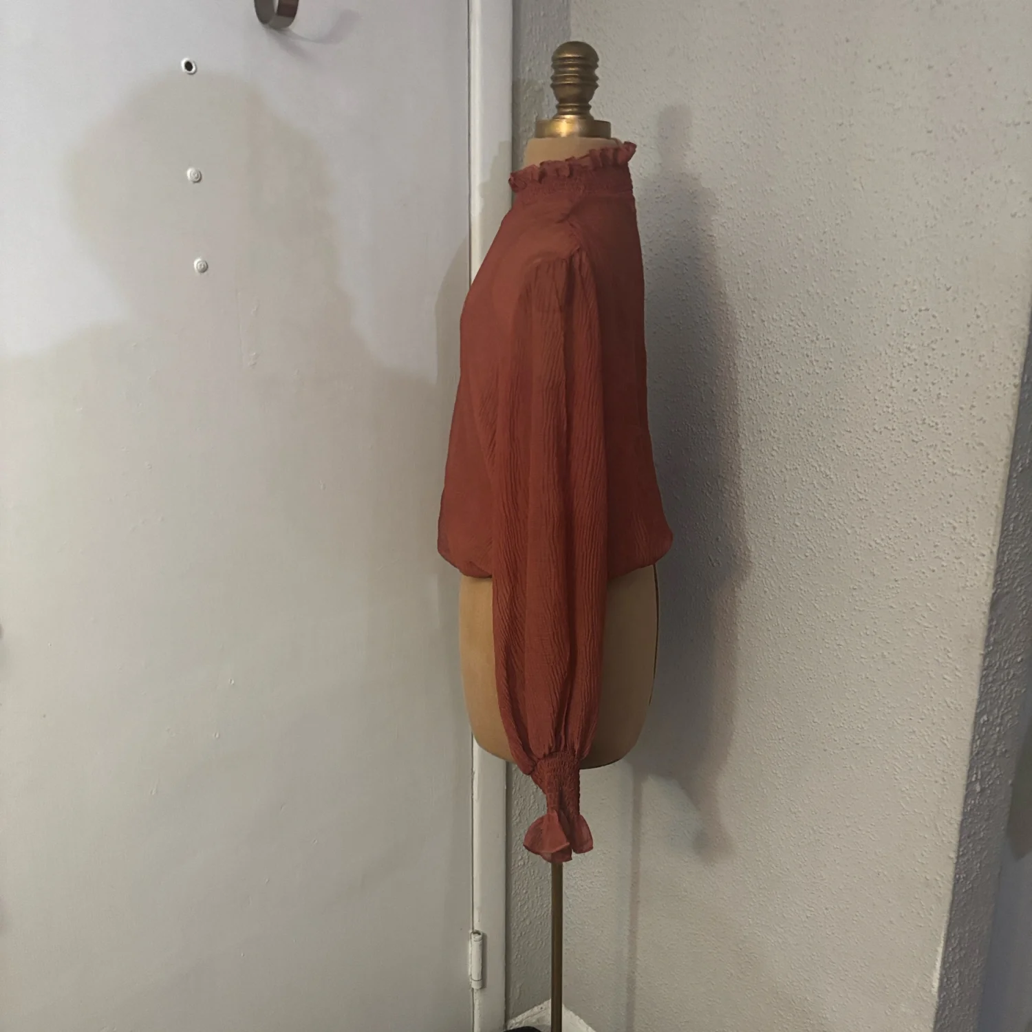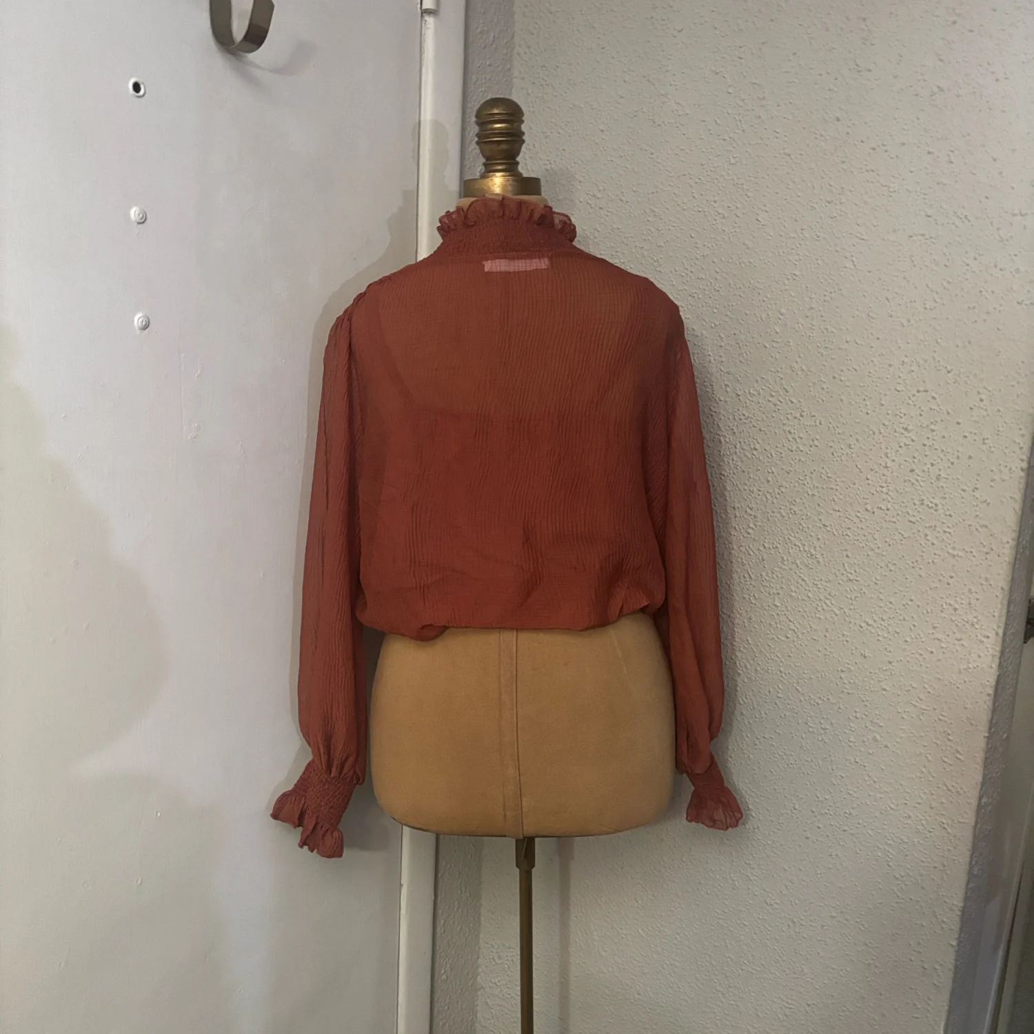 Style: Marsala AT 16423 This elegant sheer blouse features delicate ruffles at the neck and sleeves. There is a matching attached tank inside the blouse for coverage. The rich fall color adds a touch of warmth to your wardrobe. Color: Rust Size: S Armpit: 20" Length: 19" Sleeve: 29" Condition: Good 100% Polyester Dry Clean Only