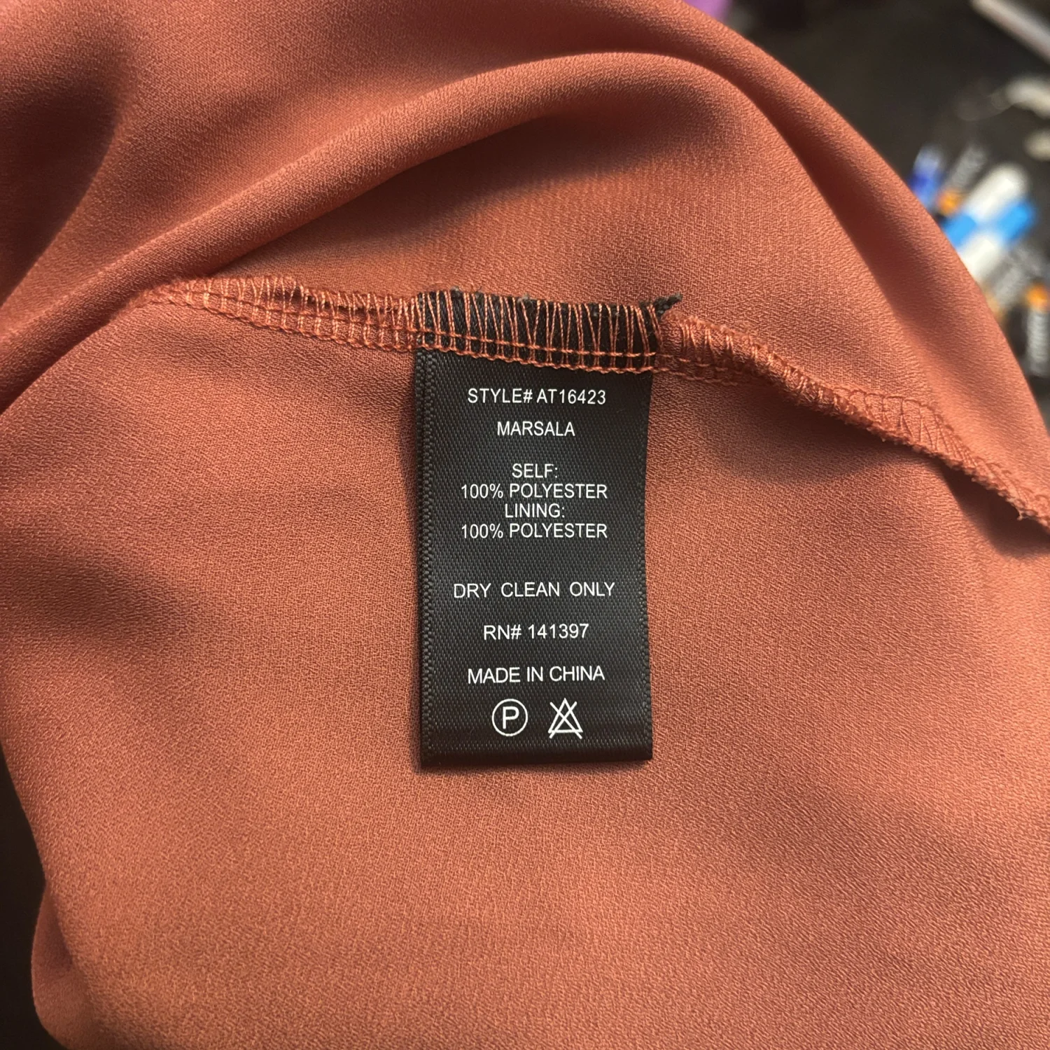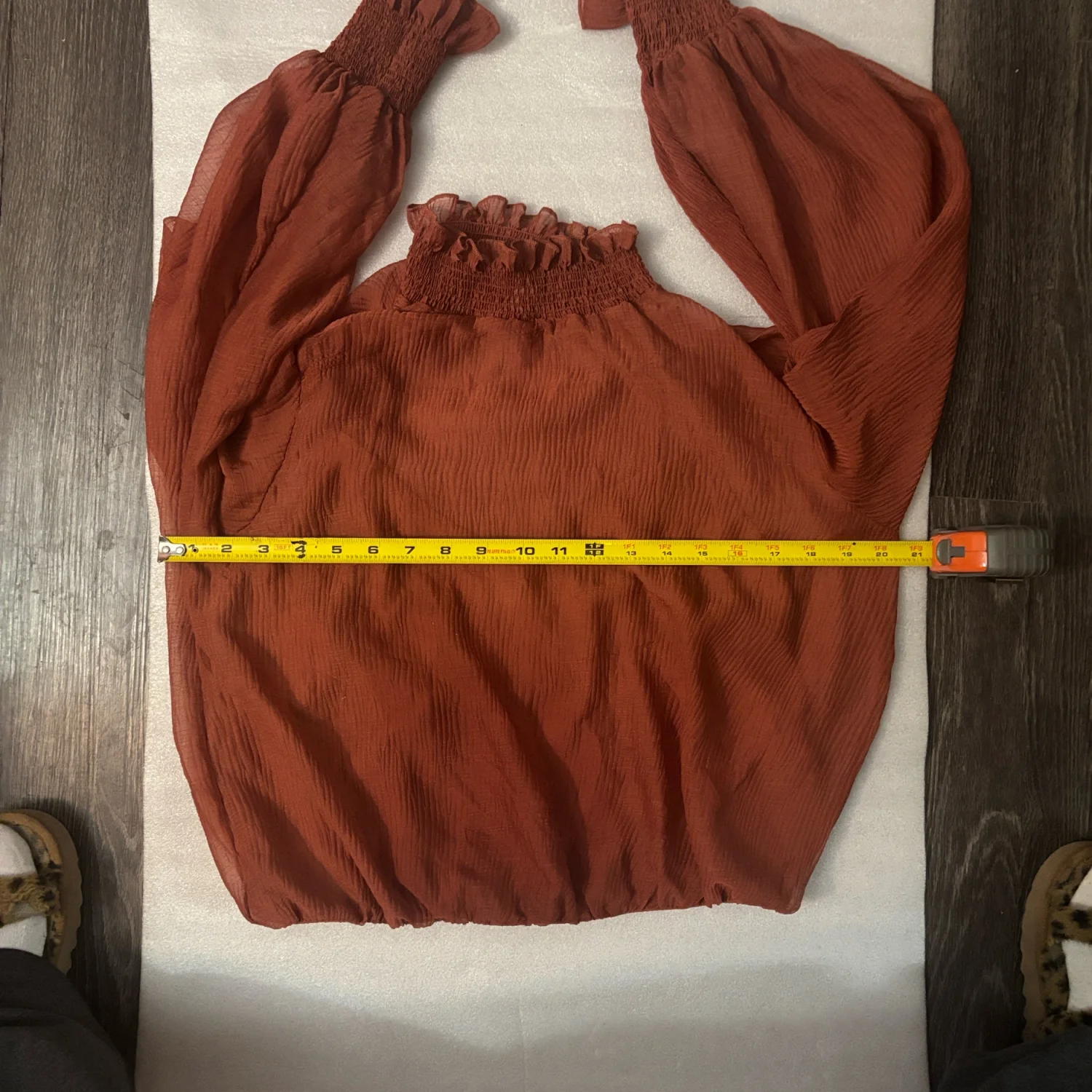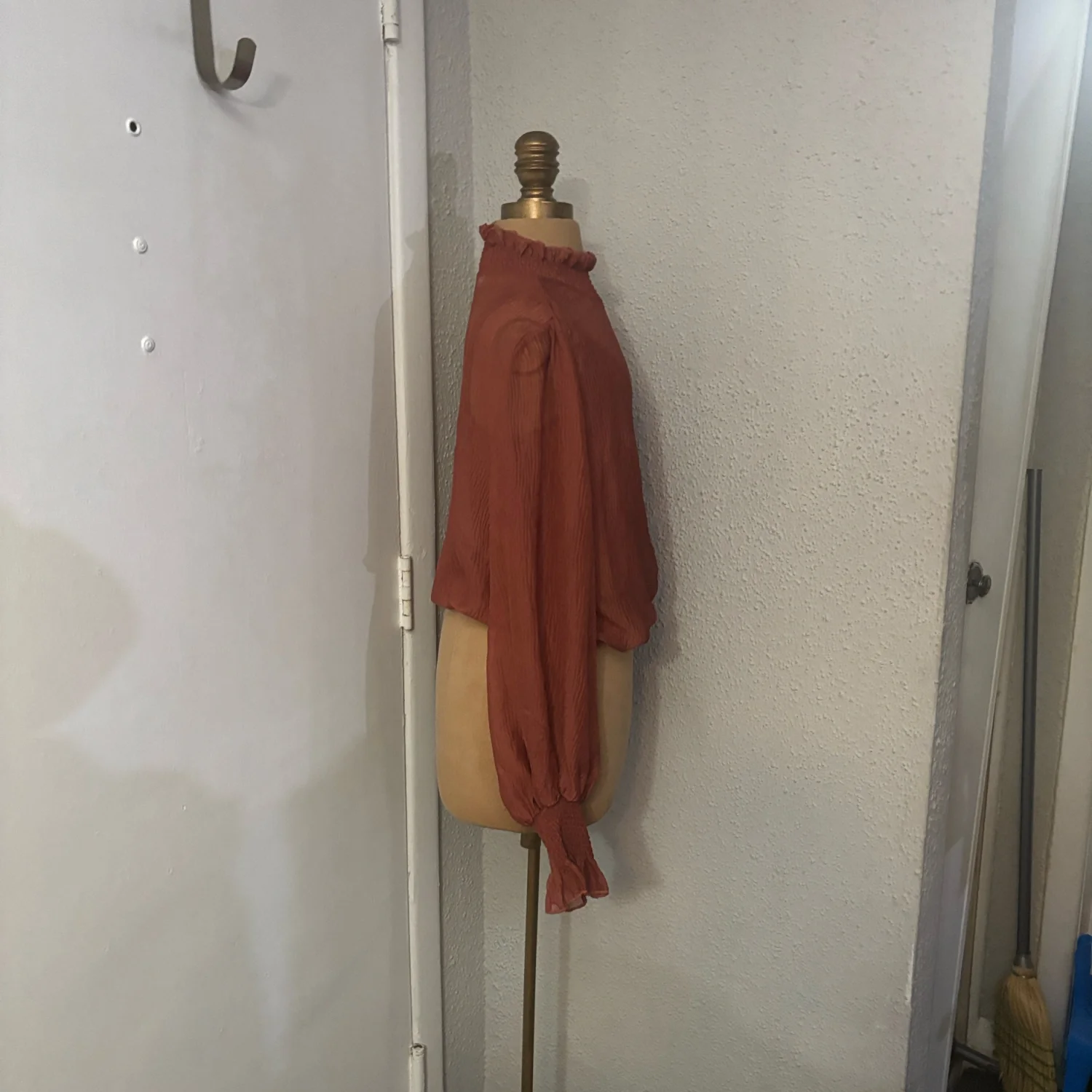 Style: Marsala AT 16423 This elegant sheer blouse features delicate ruffles at the neck and sleeves. There is a matching attached tank inside the blouse for coverage. The rich fall color adds a touch of warmth to your wardrobe. Color: Rust Size: S Armpit: 20" Length: 19" Sleeve: 29" Condition: Good 100% Polyester Dry Clean Only